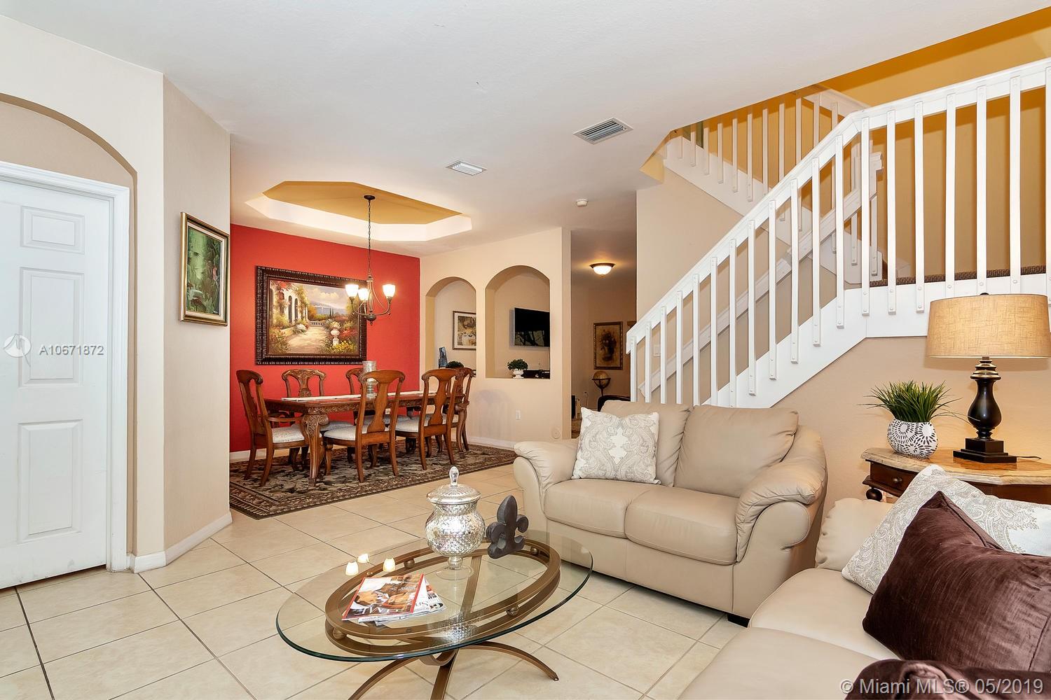 Spanish style Townhome in the peaceful and conveniently located community of Vizcaya. This spacious corner unit has 4 bedrooms, 2.5 bathrooms, 1 car garage, and a sizeable backyard. It displays a convenient open layout with accent arches dividing formal dining from the family room. Lots of bright natural light. Updated master bathroom! Neutral tile in common areas, laminate flooring in the master bedroom and carpet in secondary bedrooms and staircase. Access right across property amenities which include community pool, clubhouse, gym, and playground. Great for entertaining family and friends!