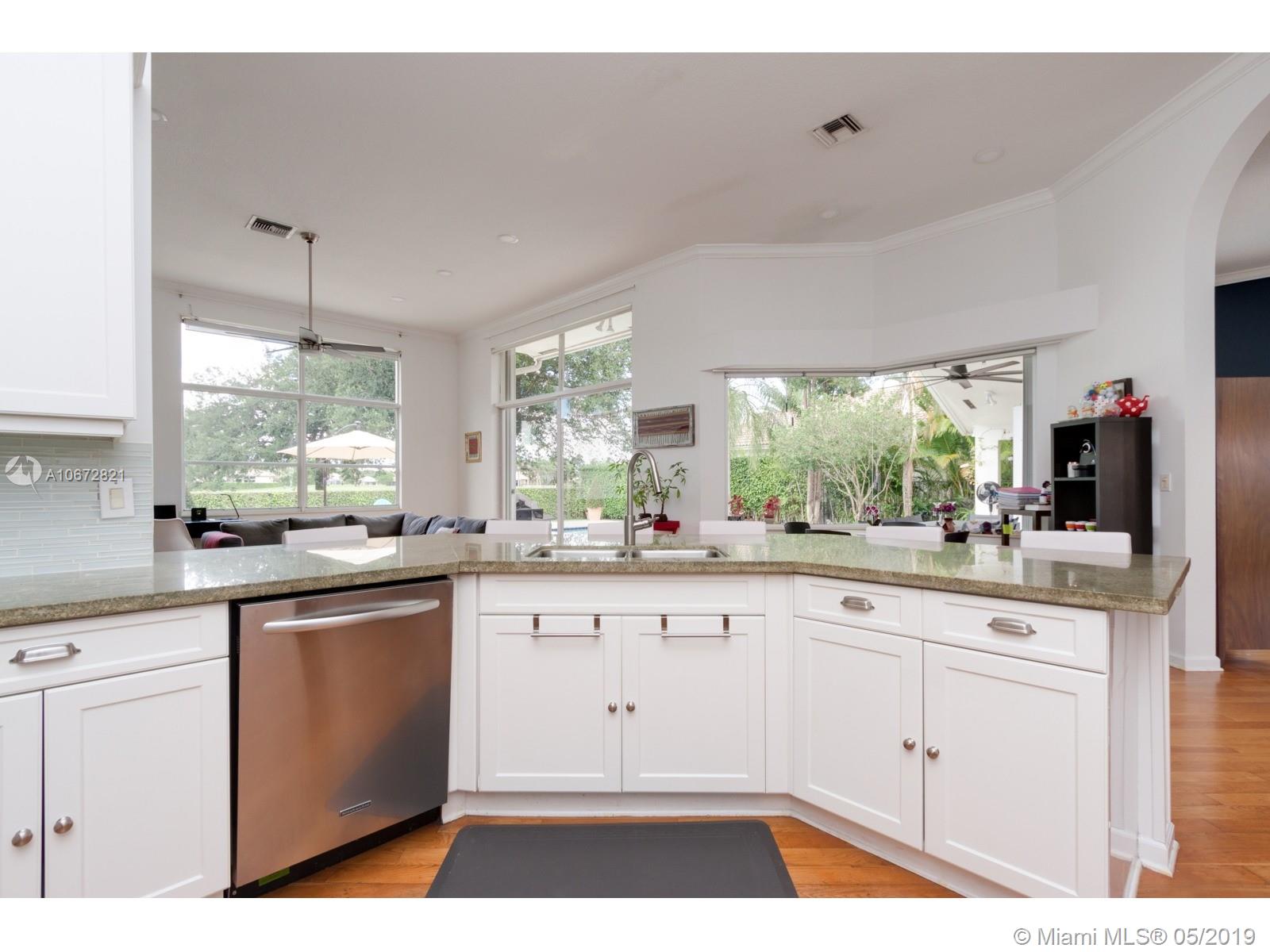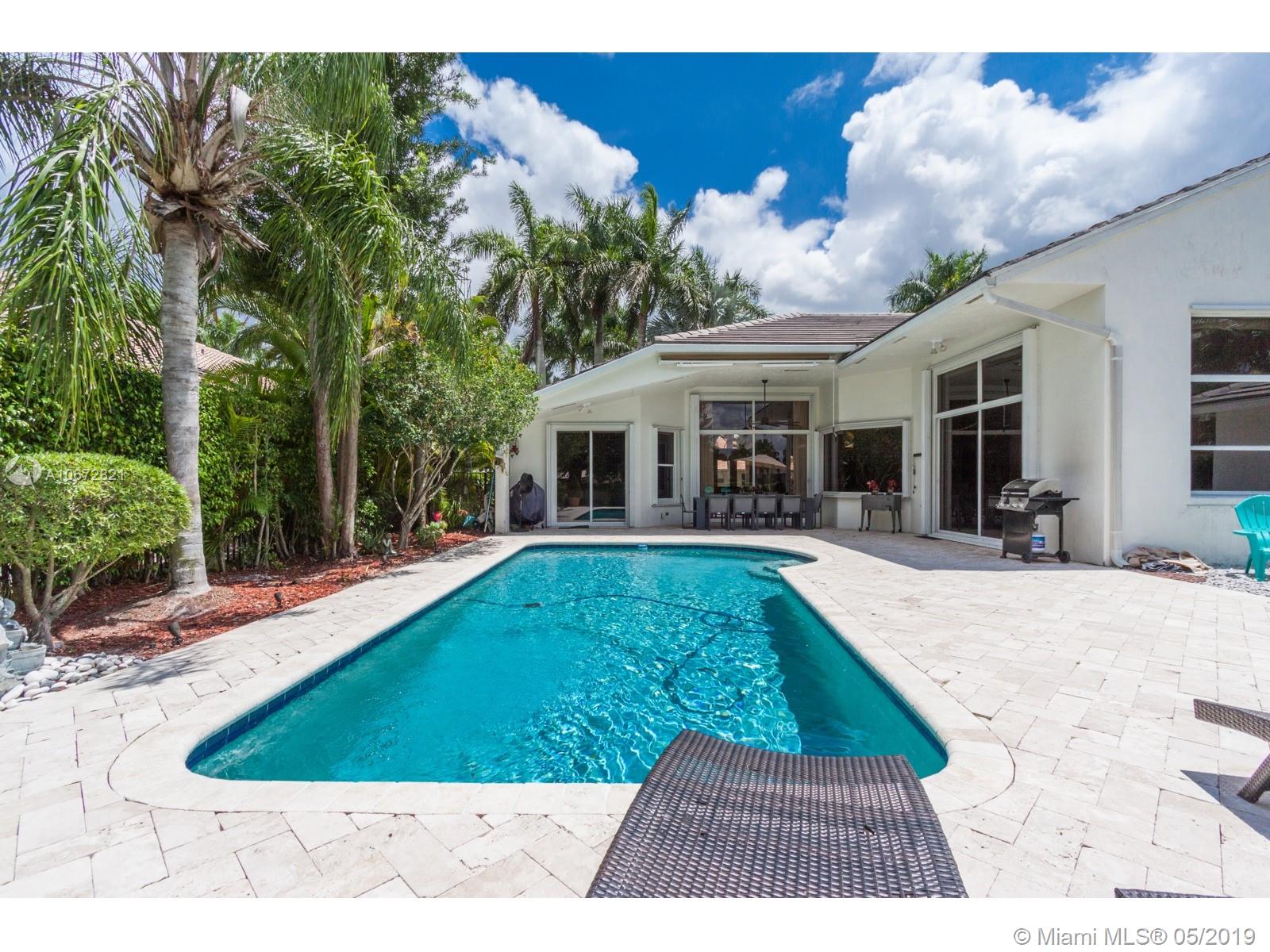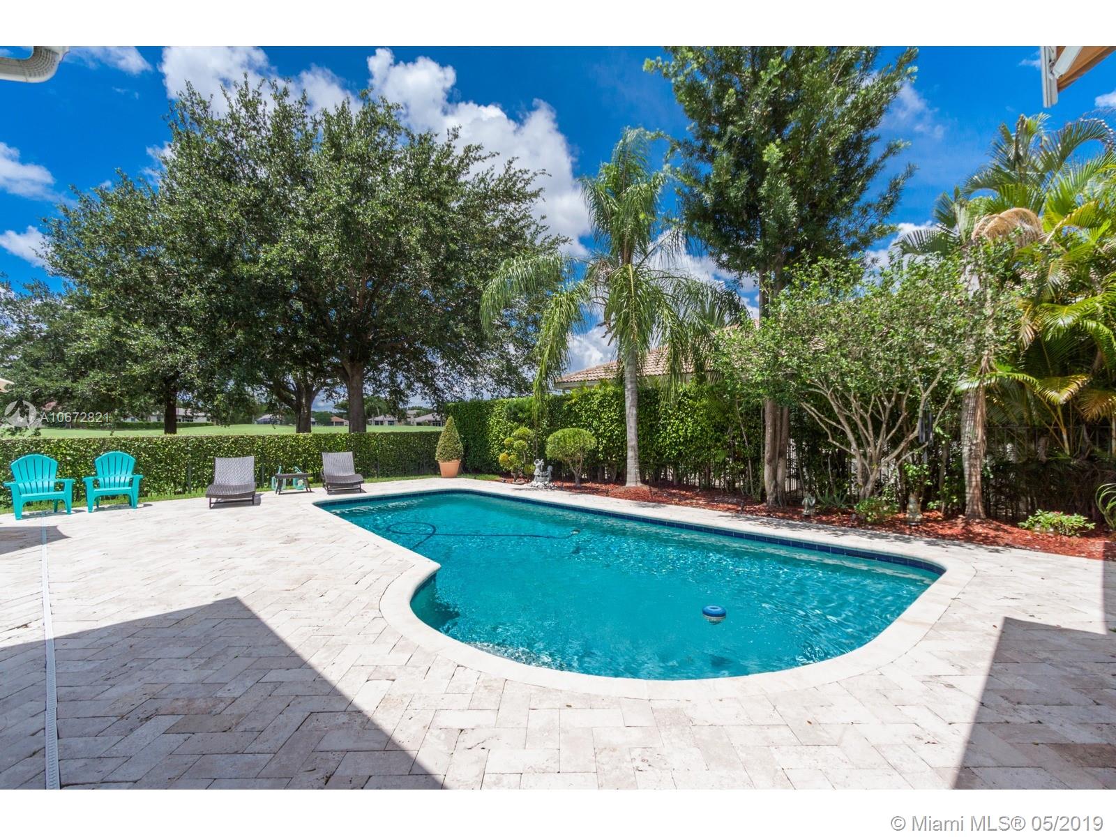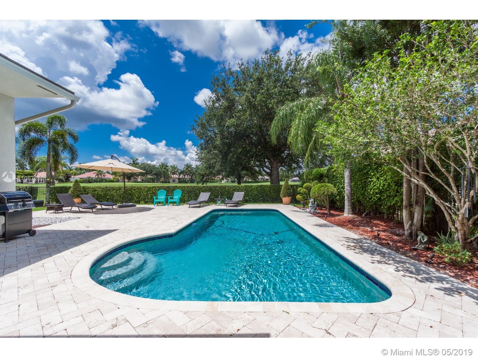 Captivating Luxury One-Story Single Family Home at Eagle Watch, Weston Hills Country Club. 4 bed 3 baths. Upon entering the house, enjoy the large spacious layout open concept with lots of natural light and high ceilings. Breathtaking views of Weston Hills golf course hole #2 and your private pool as it can be seen from almost anywhere in the home. Kitchen has large quartz counter-top and a little niche perfect for a breakfast table, with open windows to enjoy the view. Driveway entrance paved with brightening rustic Chicago brick. Hardwood floors and LED lights across the whole house. Renovated bathrooms. Recently replaced A/C units. Prestigious 3M Sun Control films on windows allow for utmost luminosity but trap heat for a cooler home. Remote control window shades in Family and Kitchen.
