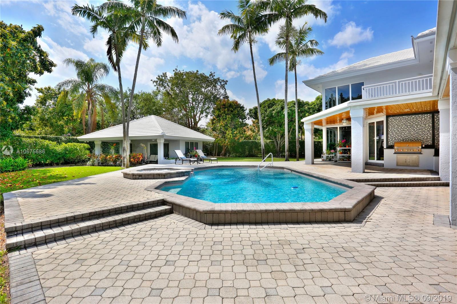 Sited on almost a full acre in Pinecrest, with a flag lot to provide the ultimate in privacy, this pristine estate is located in a great school district and is ready for immediate occupancy! The biggest bonus with this property is the beautiful 1b/1b guest house. The main house is 6 bedroom, 6.5 bathrooms and has soaring ceilings, foyer entry, energy efficient LED lighting throughout, pool with spa, wood burning fireplace, large utility room, beautiful open kitchen with breakfast area, formal dining room, spacious patio with built-in barbecue, basketball court, impact windows and doors, new roof with 5 year warranty remaining, and 60K generator with underground propane tanks that runs the entire house. Bring your most discriminating buyers. Easy to show, listed under appraised value!