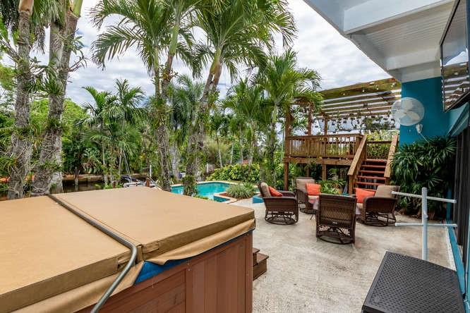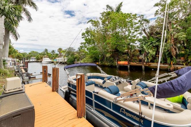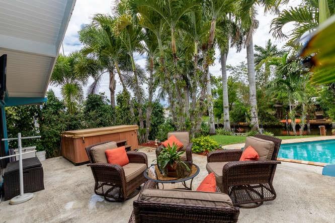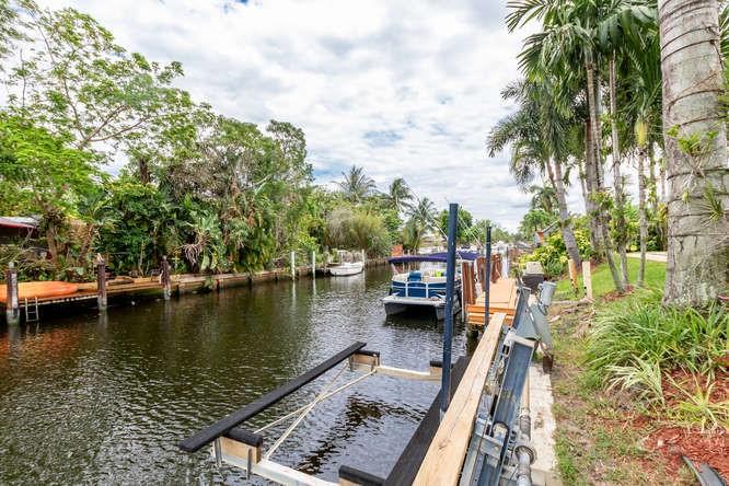 Sought after Tri-Level in Lauderdale Isles. 65' on Deep Water Ocean Access canal with 30' dock & 5000lb boat lift. This light & bight home features sparkling salt water pool, wood deck/balcony off 3rd bedrm., vaulted ceilings, real wood flooring upstairs, new carpeting downstairs and is wired for surround sound. Outstanding kitchen with new appliances, plenty of cabinet & counter space and a large pantry. Just off the kitchen is the dining area, a built in desk and spare room/den. Double Hurricane Impact French doors lead out to the lower patio deck. The living room and master bedroom have sliding glass doors that open up to the patio & the hot tub. Perfect home for entertaining. The property is lushly landscaped with palms, shrubs and exotic orchids. Too much to list here. MUST SEE!