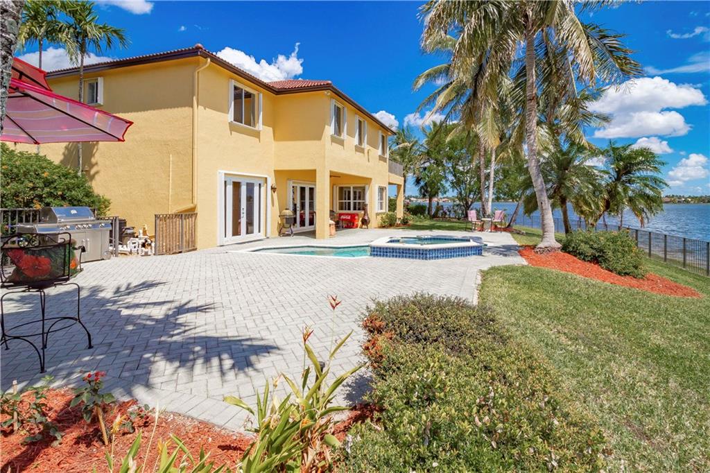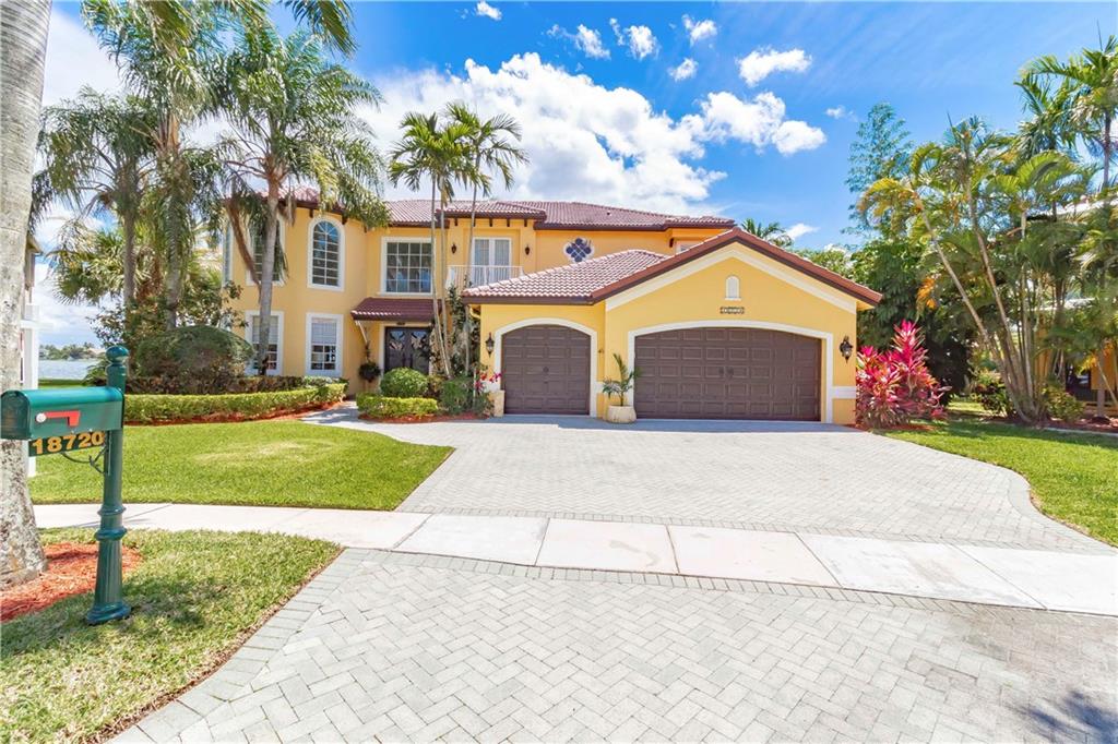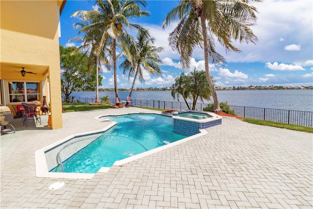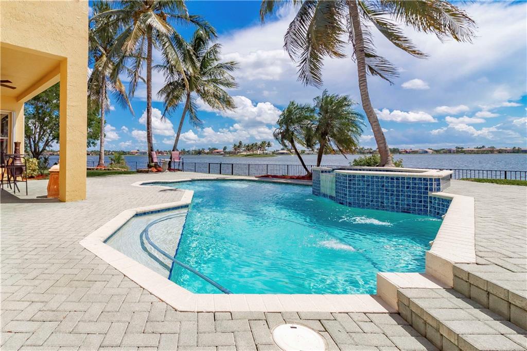 Absolutely gorgeous true 7 bedroom home overlooking the wide lake w breath taking views. Home has been freshly painted inside & out, & garage doors. Gorgeous new impact glass & iron doors invite you into this spectacular home. All new flooring throughout, porcelain on lower level common areas, rich new laminate in bedrooms & upper level. Home fully protected by accordion shutters, home security system & generator. Expansive master is complete w wet bar, mini refrigerator, & private balcony. New wrought iron railing on stairs. Kitchen has 6 burner gas Viking stove, new refrigerator, dishwasher & micro. Updated bathrooms. 3 lg beds on 1st floor, 4 lg beds upper level & loft area. New lighting & fans are found throughout. Lush landscaping on oversized lot provides complete privacy.