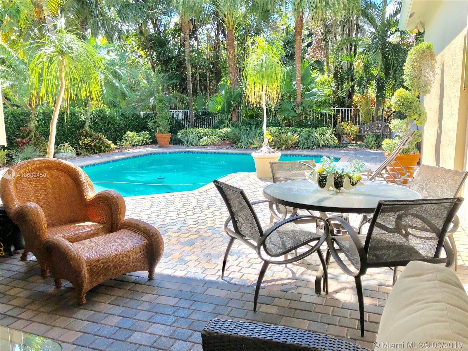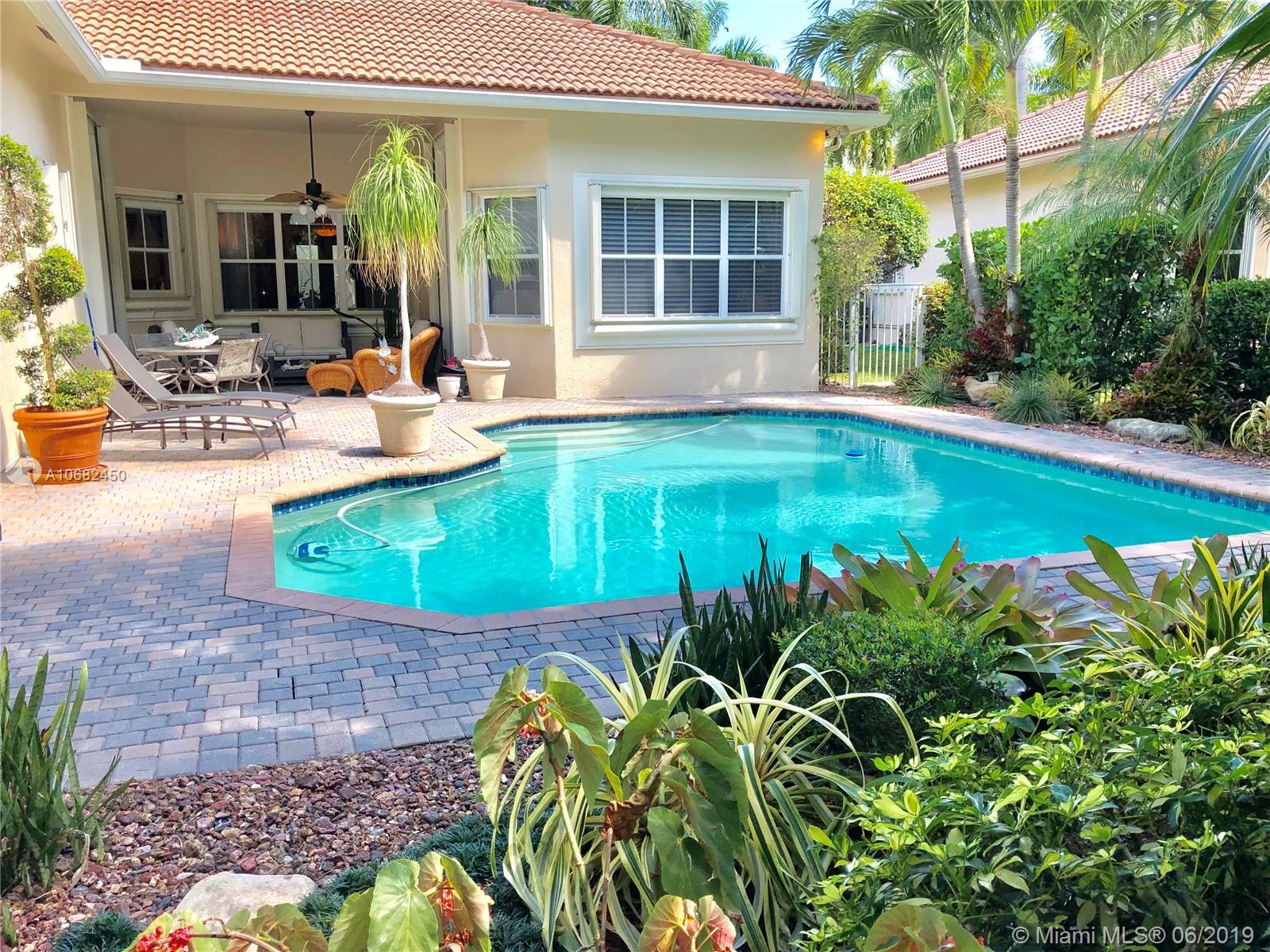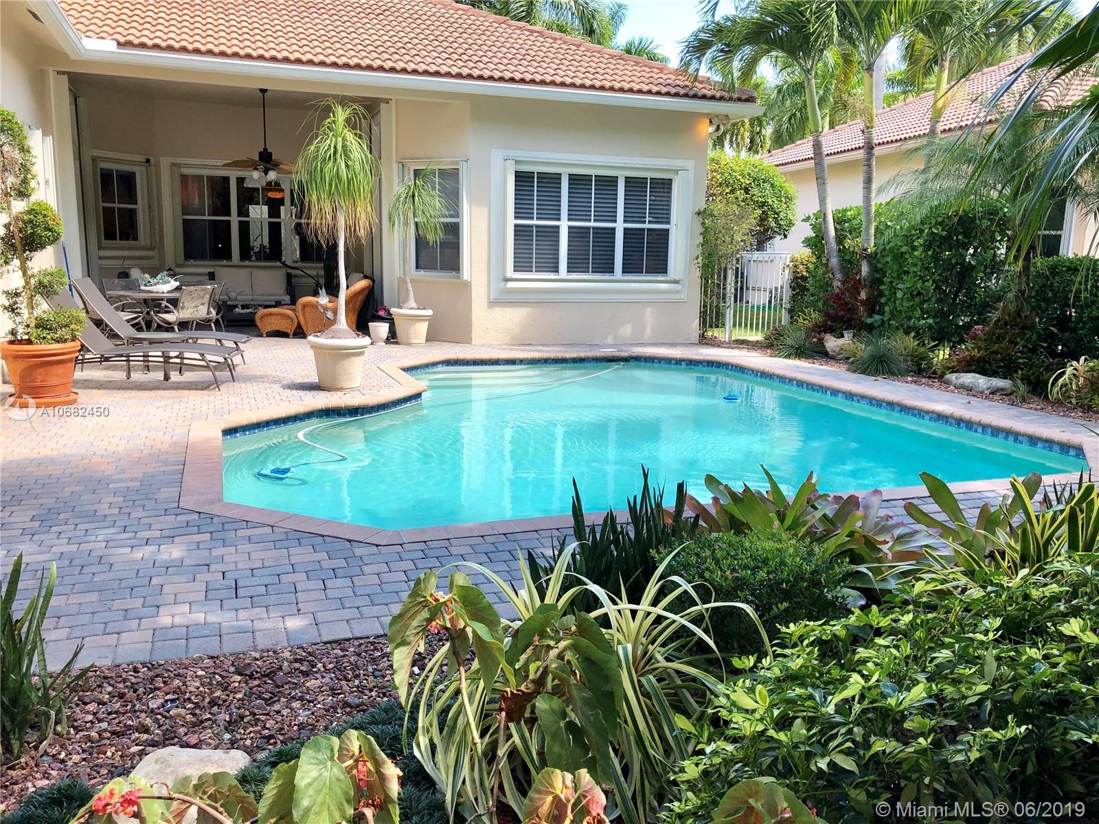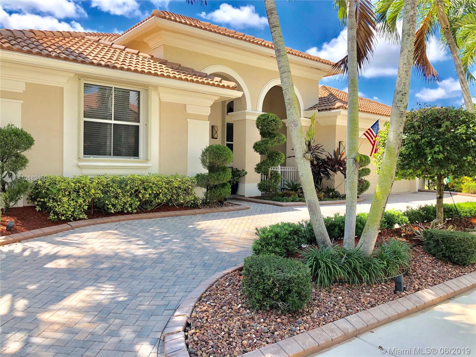 Original owners have maintained this elegant home with pride. Enter this spacious one story via your expansive circular paver driveway, lushly landscaped and enter through glass impact doors. Neutral diagonal coral stone tile flows through the living areas. Enjoy soaring ceilings and windows on private pool with paver patio, fully fenced and lushly landscaped. Split floor plan with private bedroom wing with wood floors, blinds and cabana bath to pool. Master bath with slider to patio, silloutte shades and luxurious master bath with roman tub, dual sinks. White kitchen with upgraded stainless steel appliances, center island and fashionable corian countertops. This home shows pride of ownership. Full accordion protection. Walk to community park.