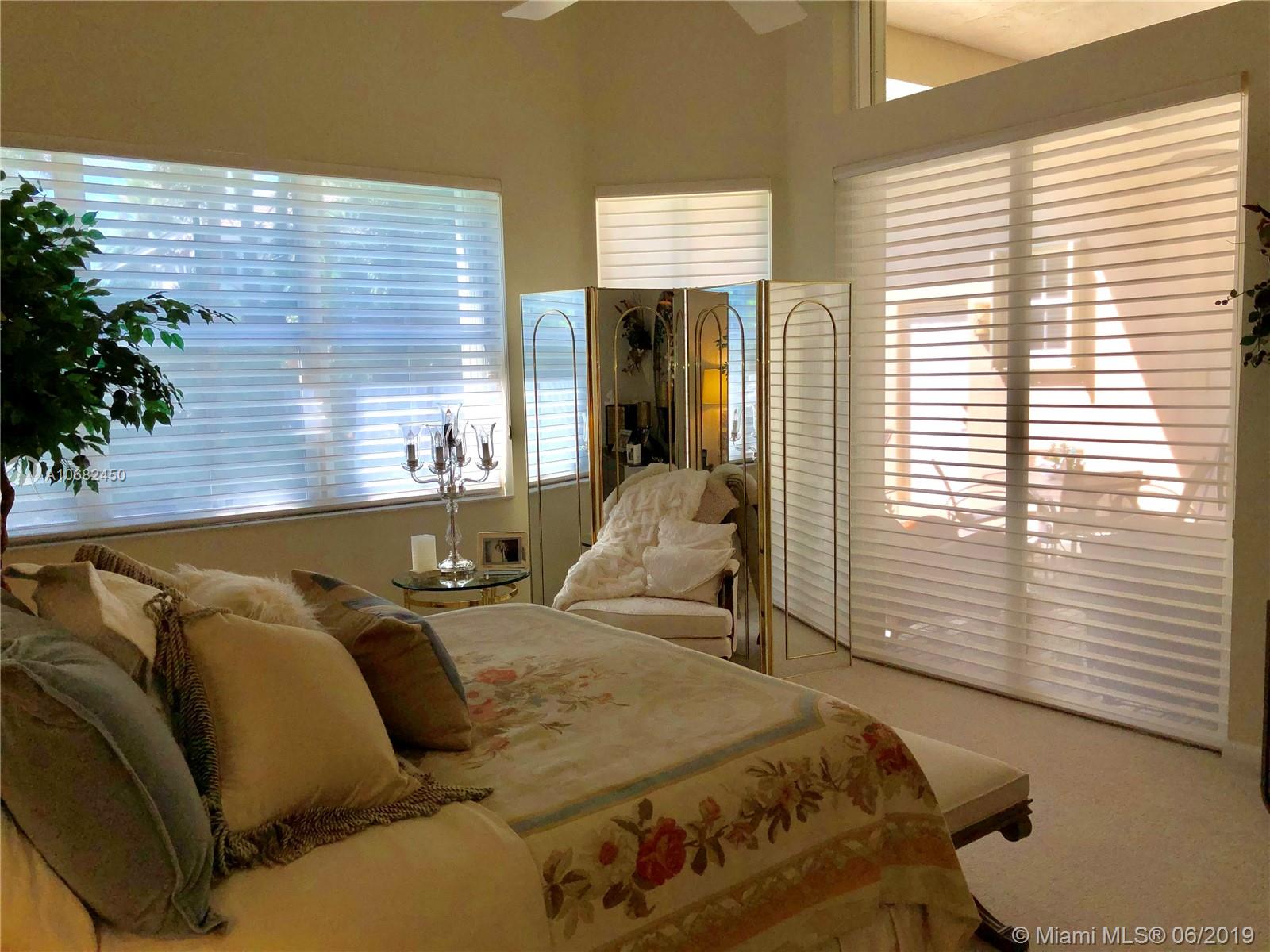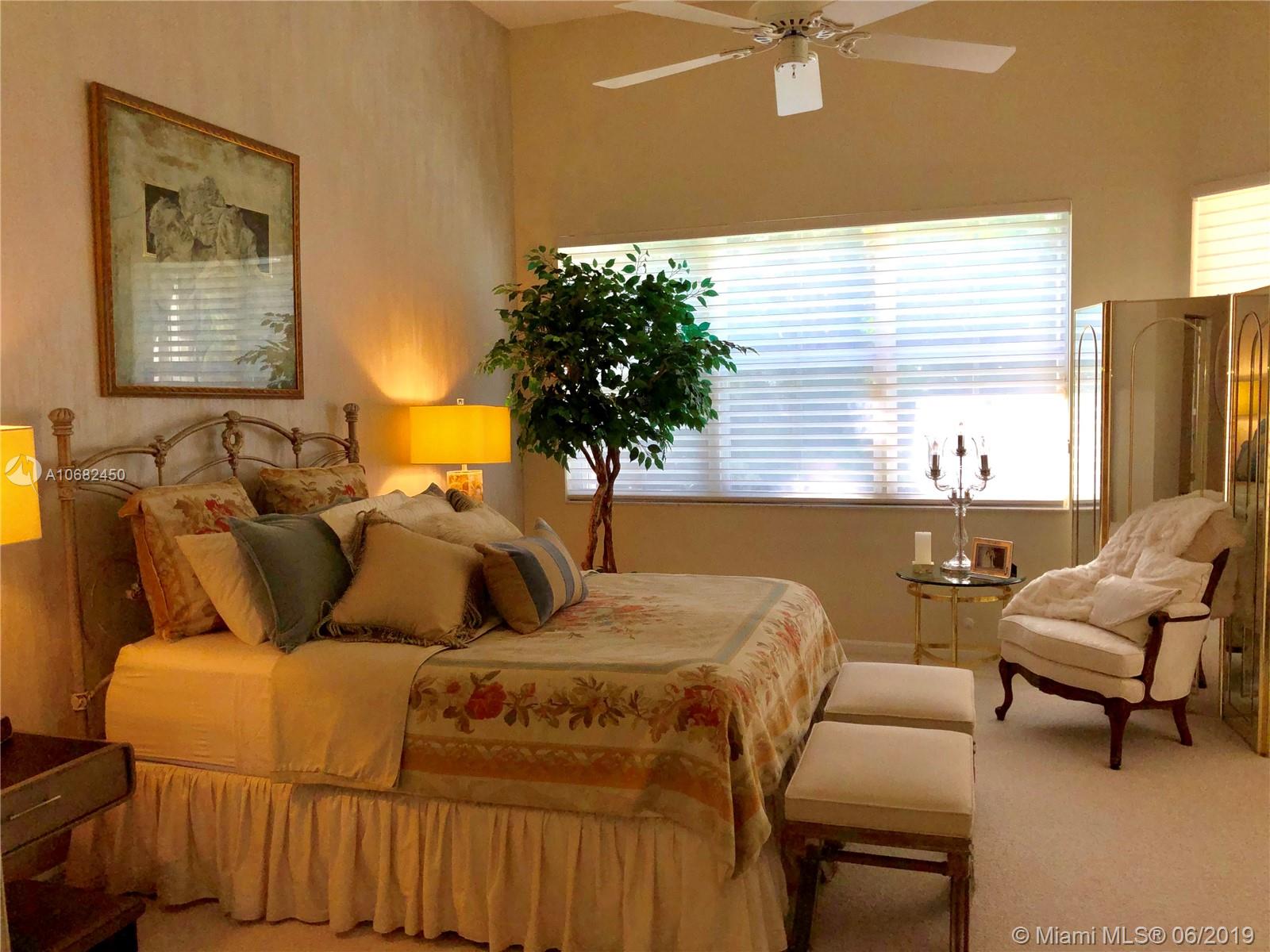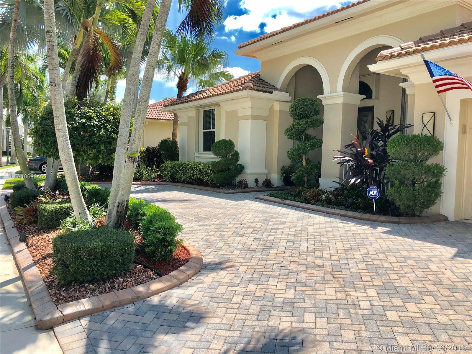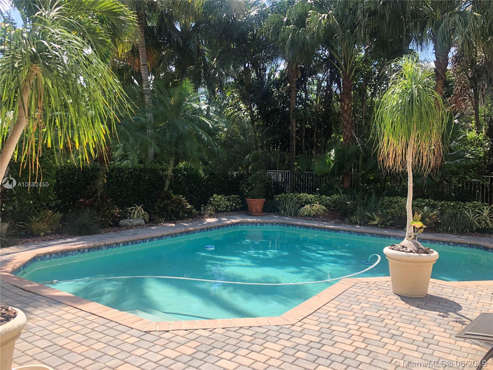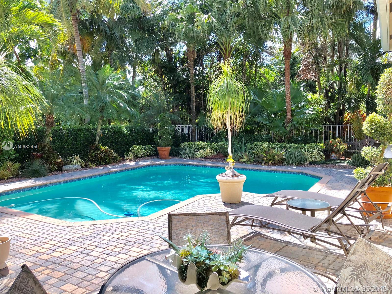 Original owners have maintained this elegant home with pride. Enter this spacious one story via your expansive circular paver driveway, lushly landscaped and enter through glass impact doors. Neutral diagonal coral stone tile flows through the living areas. Enjoy soaring ceilings and windows on private pool with paver patio, fully fenced and lushly landscaped. Split floor plan with private bedroom wing with wood floors, blinds and cabana bath to pool. Master bath with slider to patio, silloutte shades and luxurious master bath with roman tub, dual sinks. White kitchen with upgraded stainless steel appliances, center island and fashionable corian countertops. This home shows pride of ownership. Full accordion protection. Walk to community park.