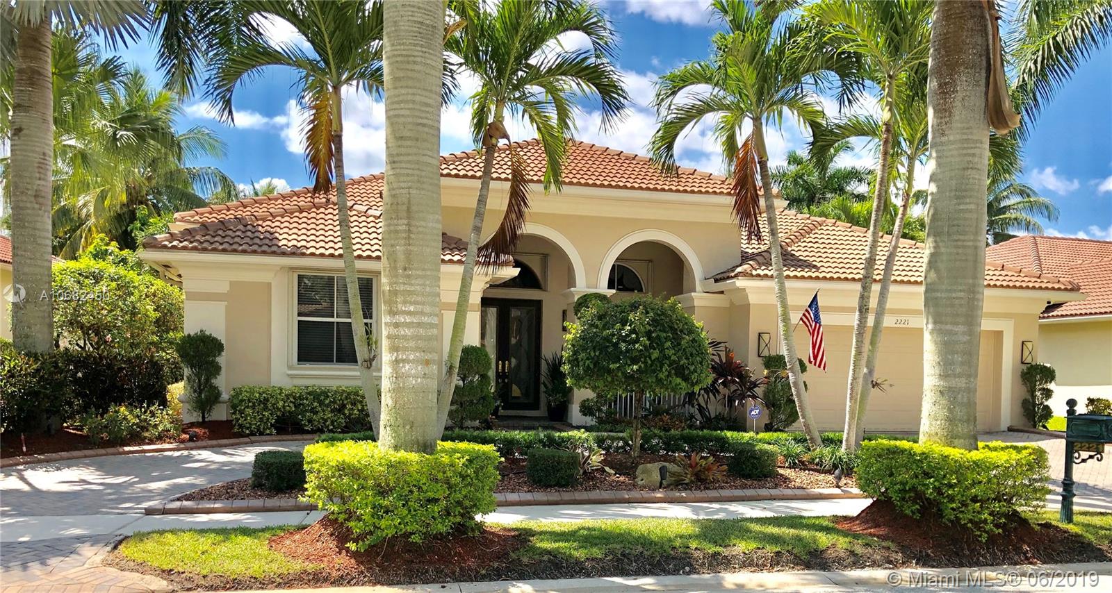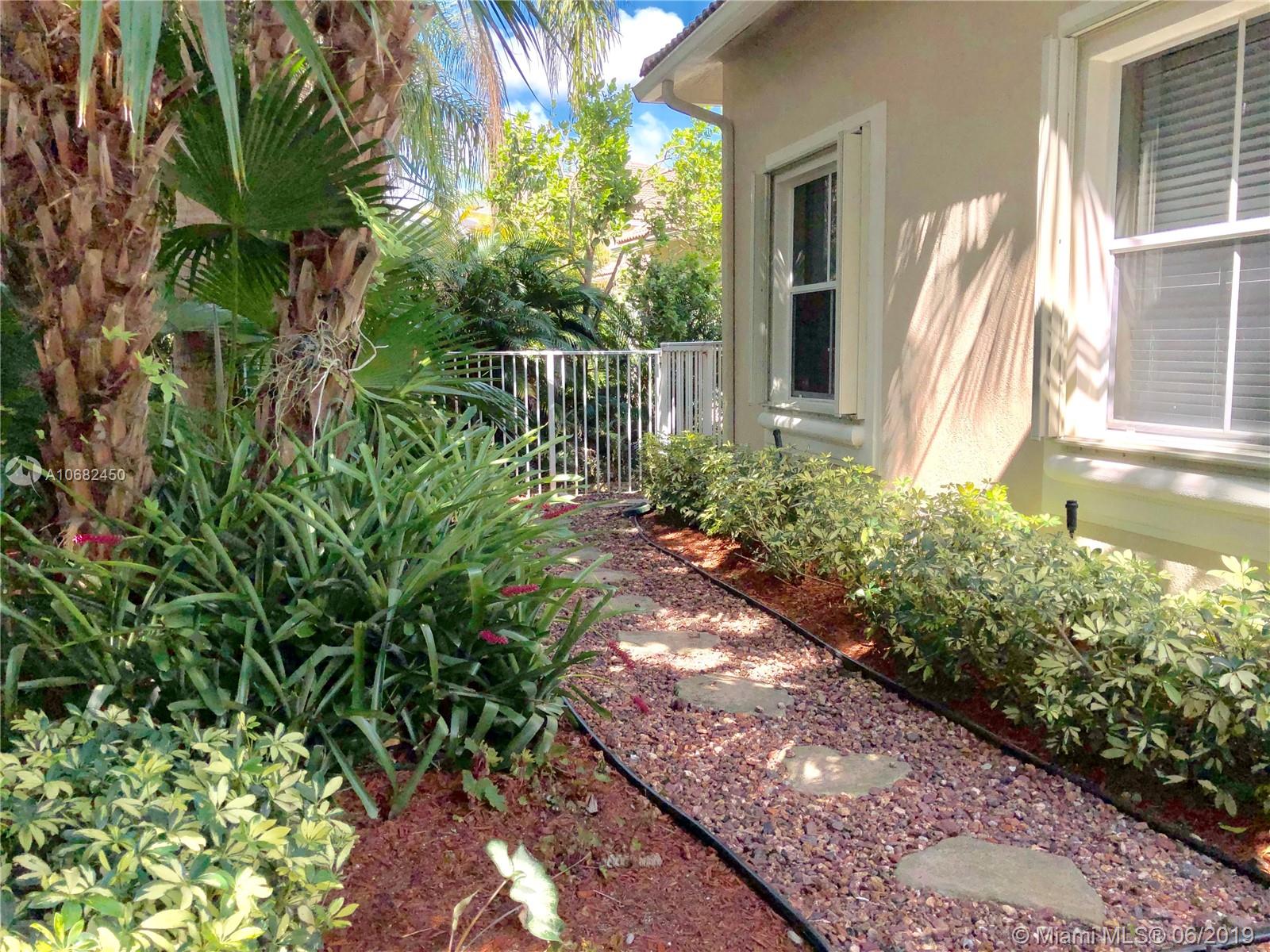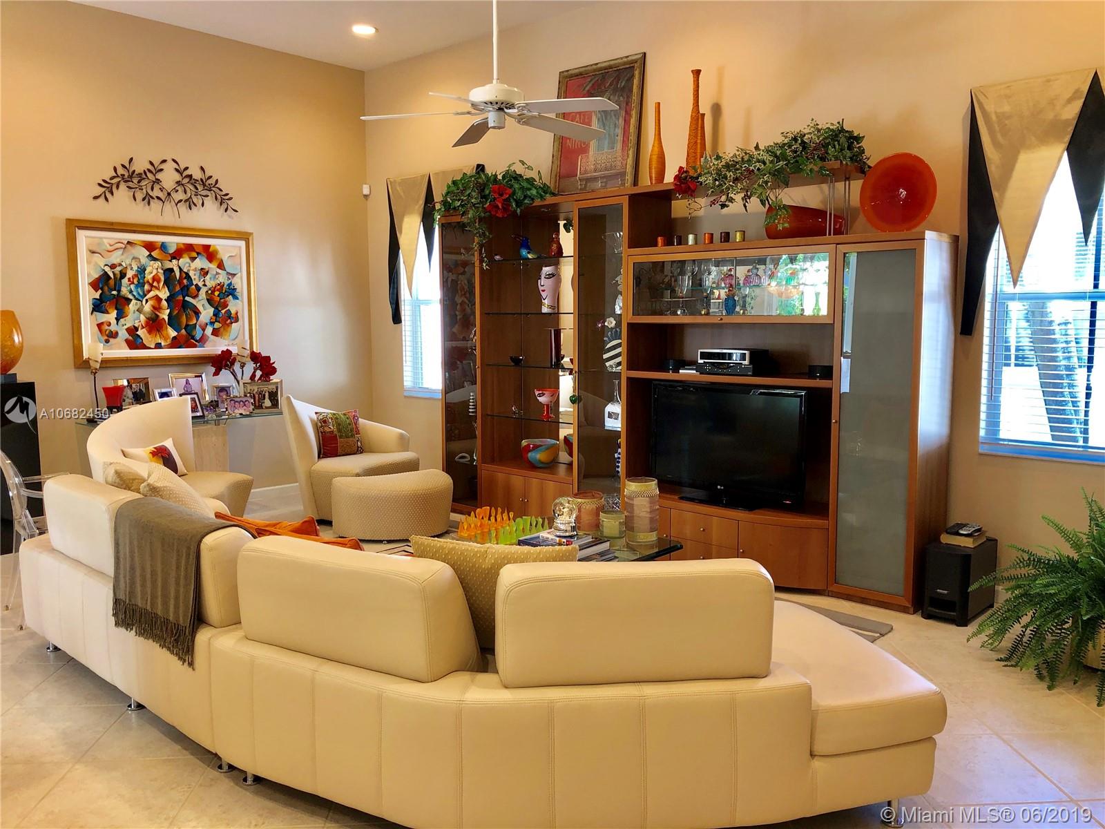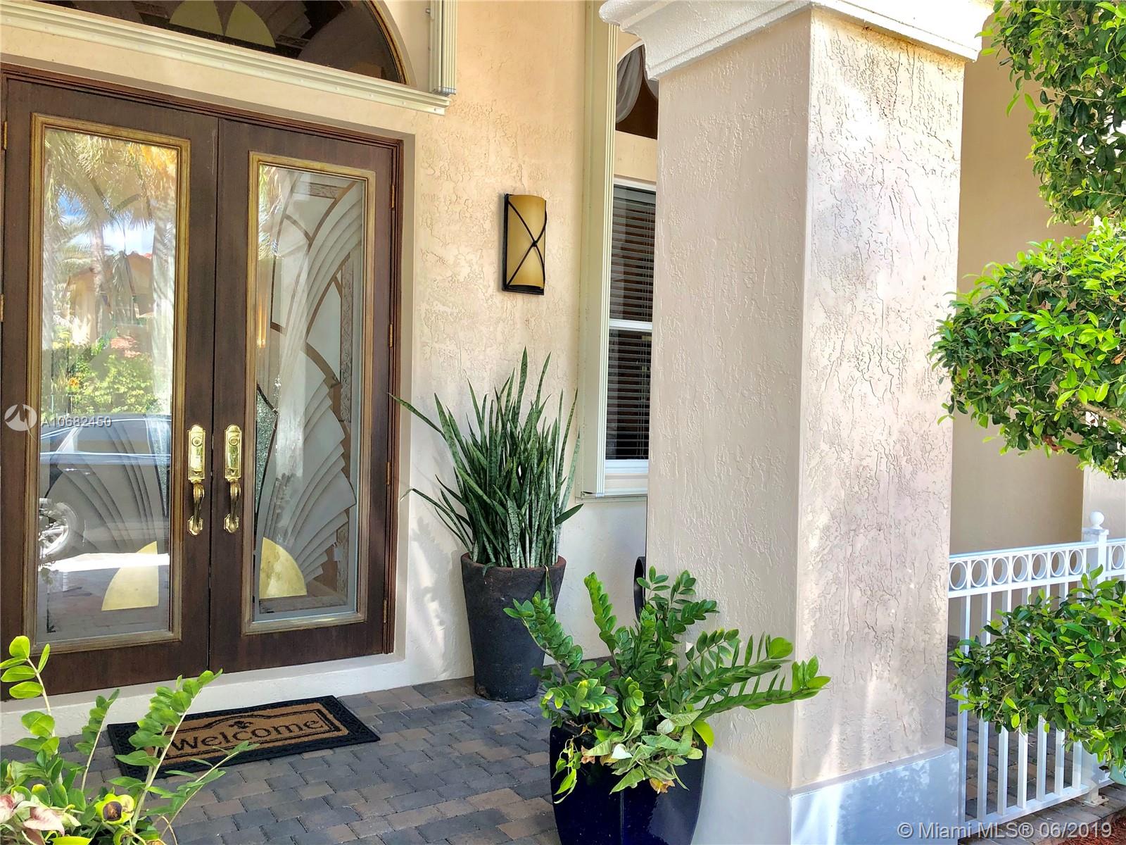 Original owners have maintained this elegant home with pride. Enter this spacious one story via your expansive circular paver driveway, lushly landscaped and enter through glass impact doors. Neutral diagonal coral stone tile flows through the living areas. Enjoy soaring ceilings and windows on private pool with paver patio, fully fenced and lushly landscaped. Split floor plan with private bedroom wing with wood floors, blinds and cabana bath to pool. Master bath with slider to patio, silloutte shades and luxurious master bath with roman tub, dual sinks. White kitchen with upgraded stainless steel appliances, center island and fashionable corian countertops. This home shows pride of ownership. Full accordion protection. Walk to community park.