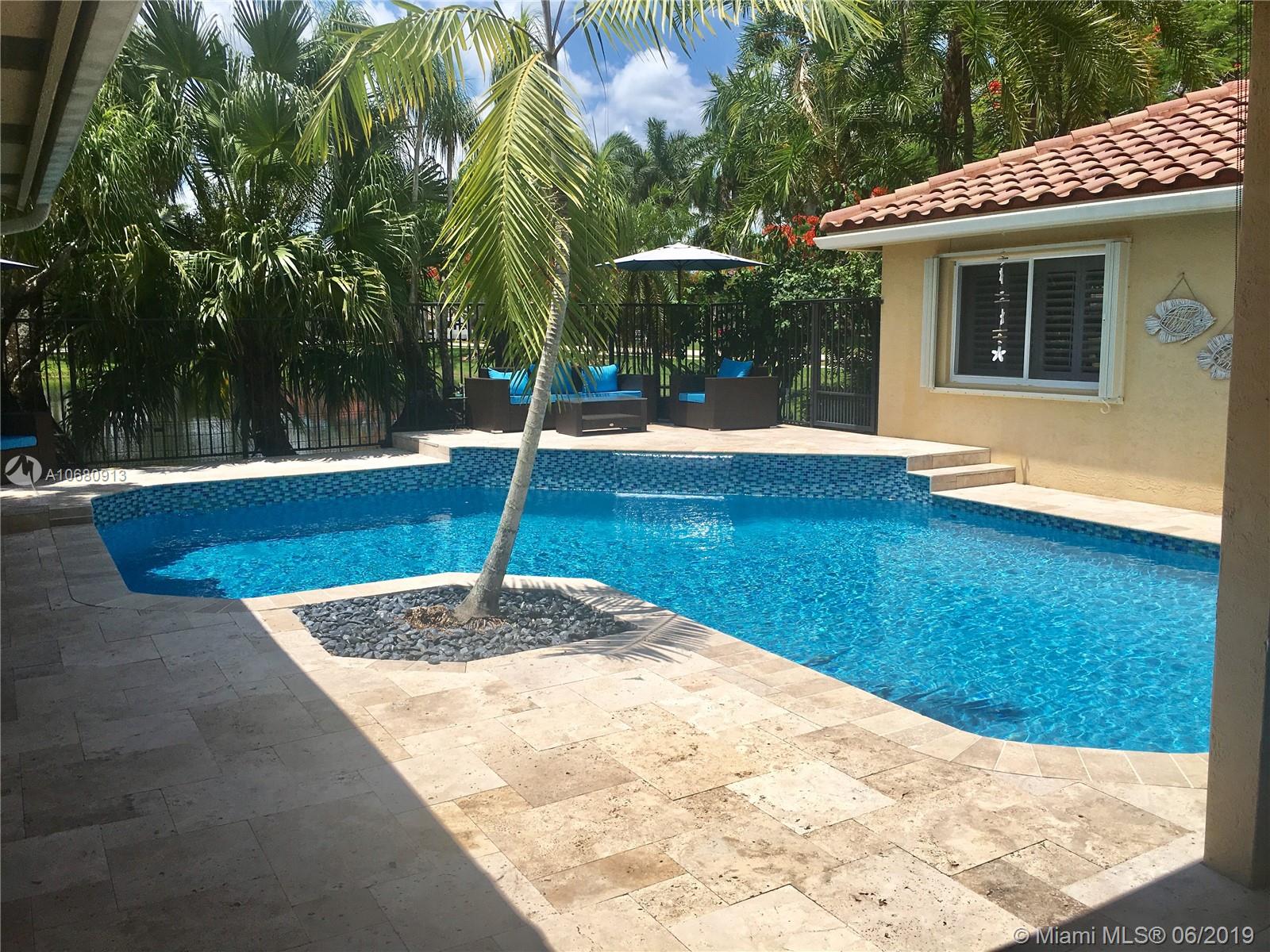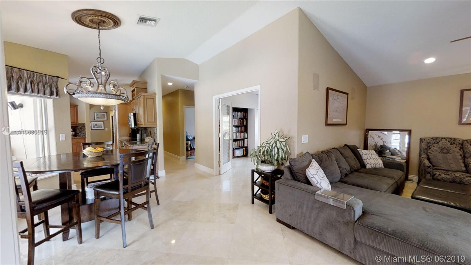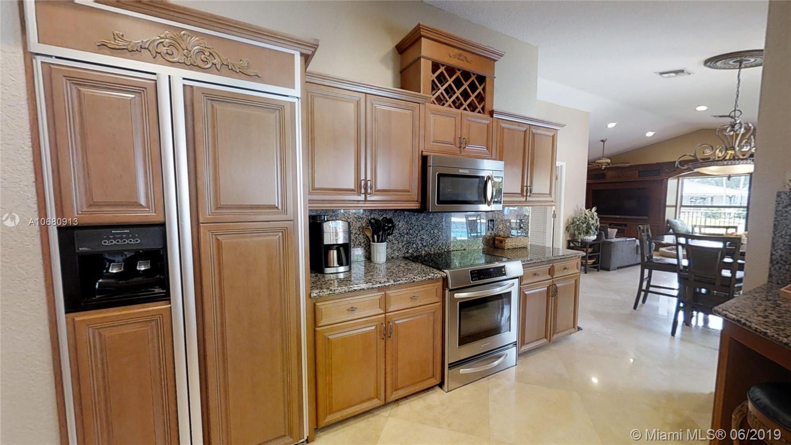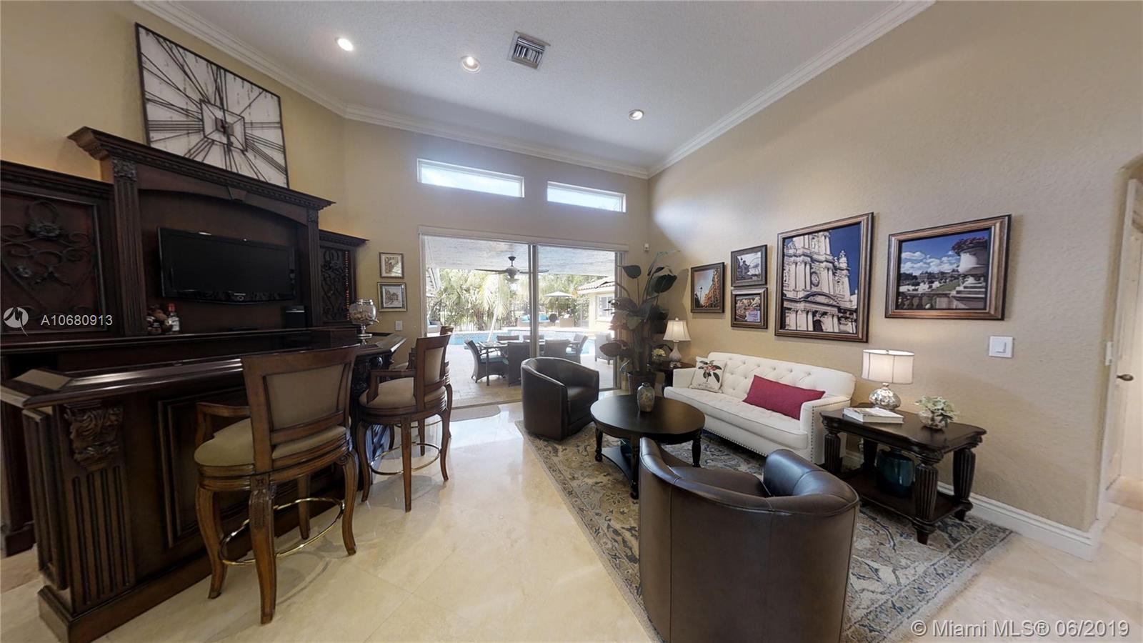 Beautiful and unique lake home with a pool in Sunset Springs. 5 bedroom, 3.5 bath where the 5th bedroom and 3rd full bath are in a full in-law suite with sitting area, kitchenette and separate entrance overlooking the pool. Updated kitchen with granite counters, large pantry and stainless steel appliances. All bathrooms are upgraded. Marble floors throughout the house living area. 2007 roof. Custom wood bar. Full of upgrades: impact windows & accordion shutters combination, power generator, recently resurfaced pool with salt system, LED recessed lighting, new water heaters, reverse osmosis water filtration system, widened driveway with pavers, camera door bell, sprinkler's water from the lake. Extra large corner lake lot across the community's play ground. A definite must-see!.