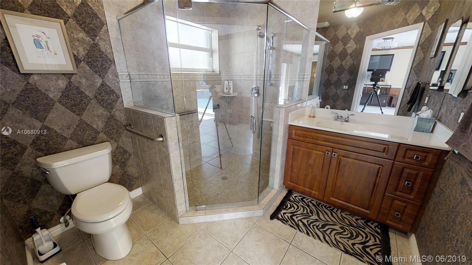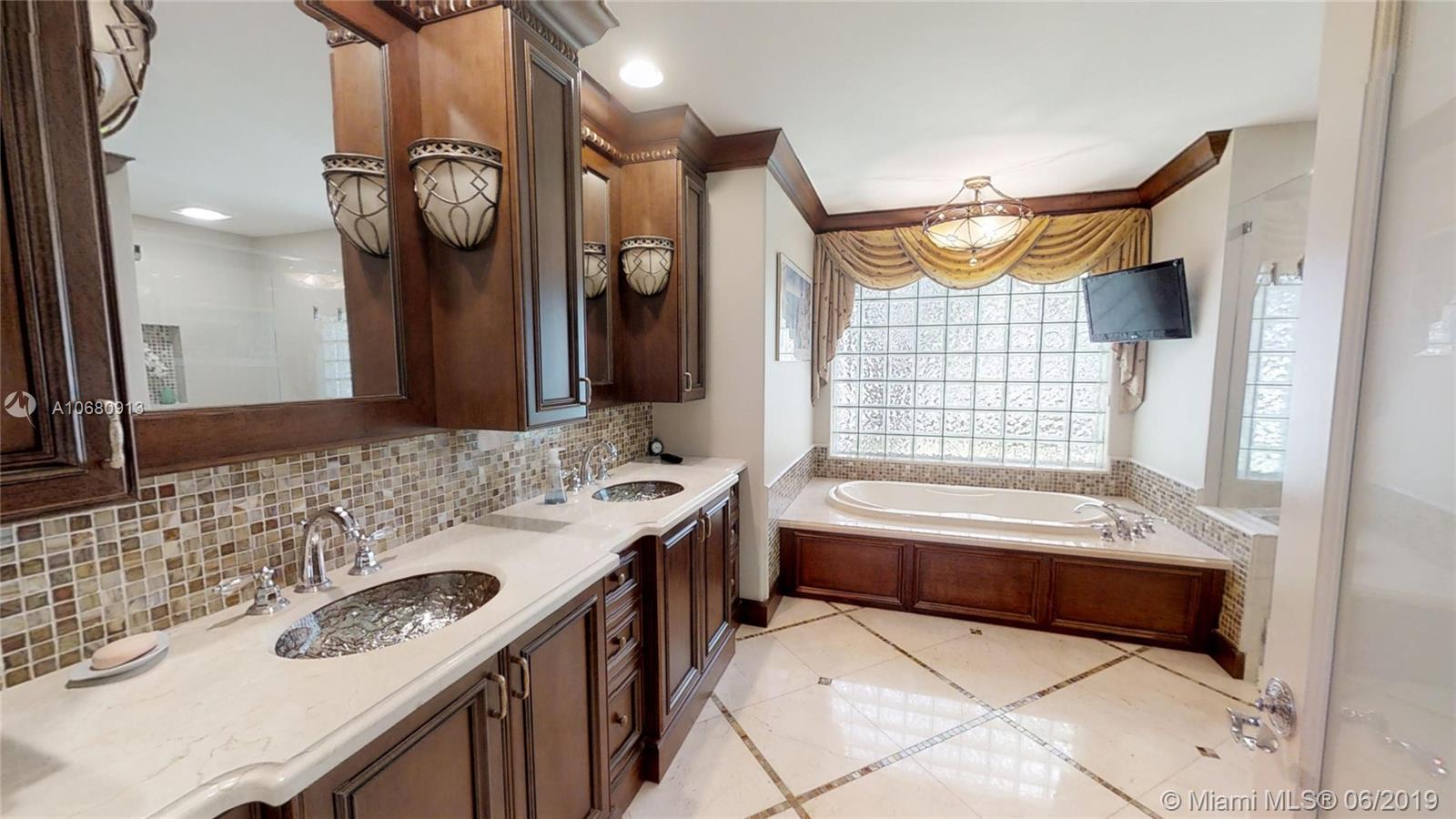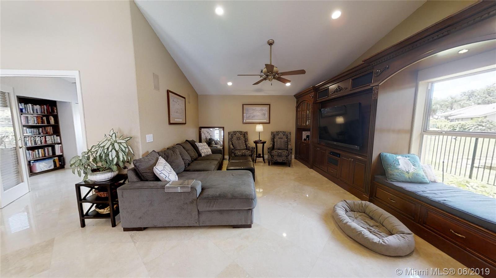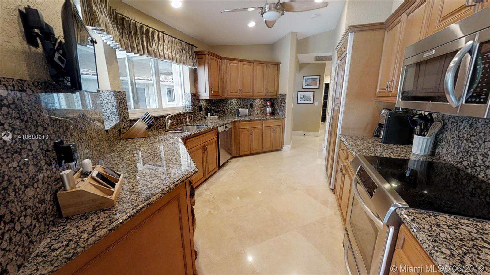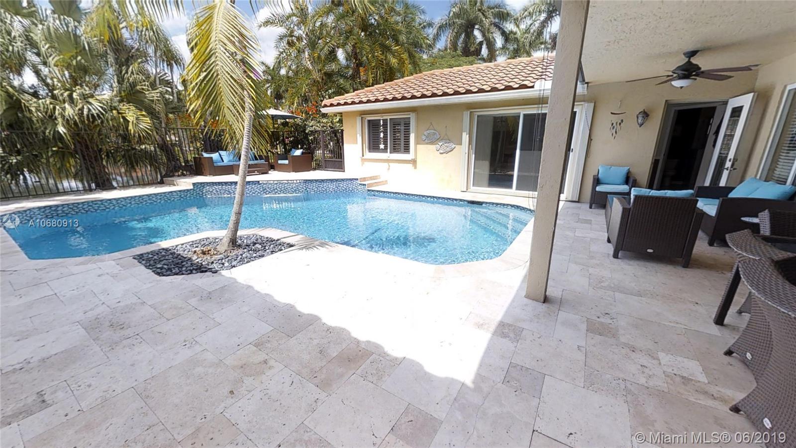 Beautiful and unique lake home with a pool in Sunset Springs. 5 bedroom, 3.5 bath where the 5th bedroom and 3rd full bath are in a full in-law suite with sitting area, kitchenette and separate entrance overlooking the pool. Updated kitchen with granite counters, large pantry and stainless steel appliances. All bathrooms are upgraded. Marble floors throughout the house living area. 2007 roof. Custom wood bar. Full of upgrades: impact windows & accordion shutters combination, power generator, recently resurfaced pool with salt system, LED recessed lighting, new water heaters, reverse osmosis water filtration system, widened driveway with pavers, camera door bell, sprinkler's water from the lake. Extra large corner lake lot across the community's play ground. A definite must-see!.