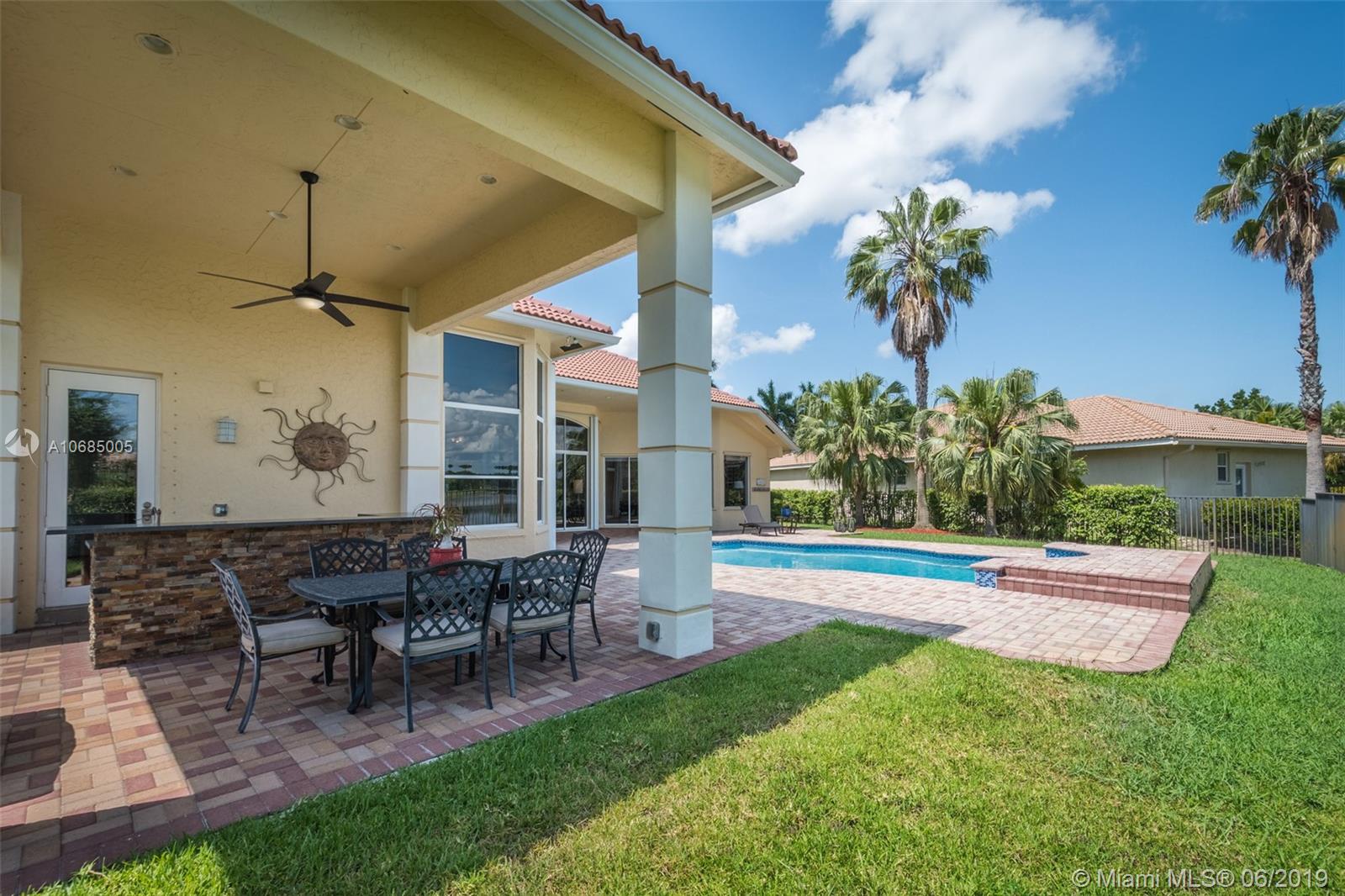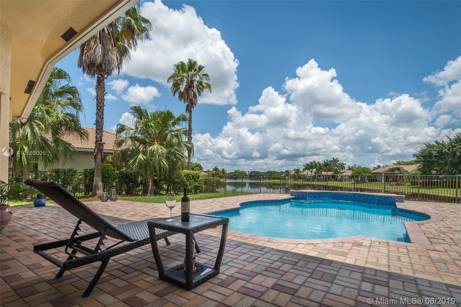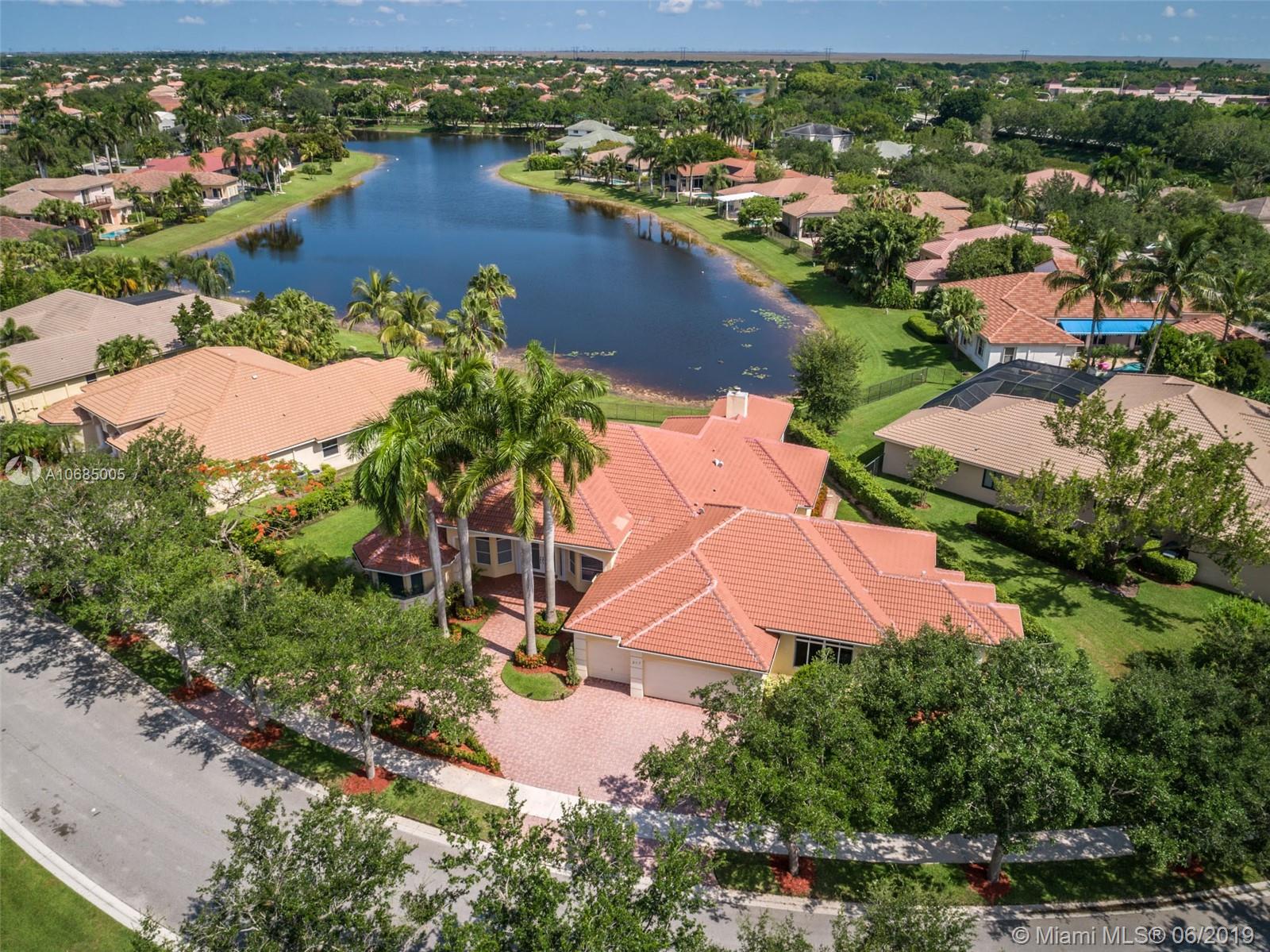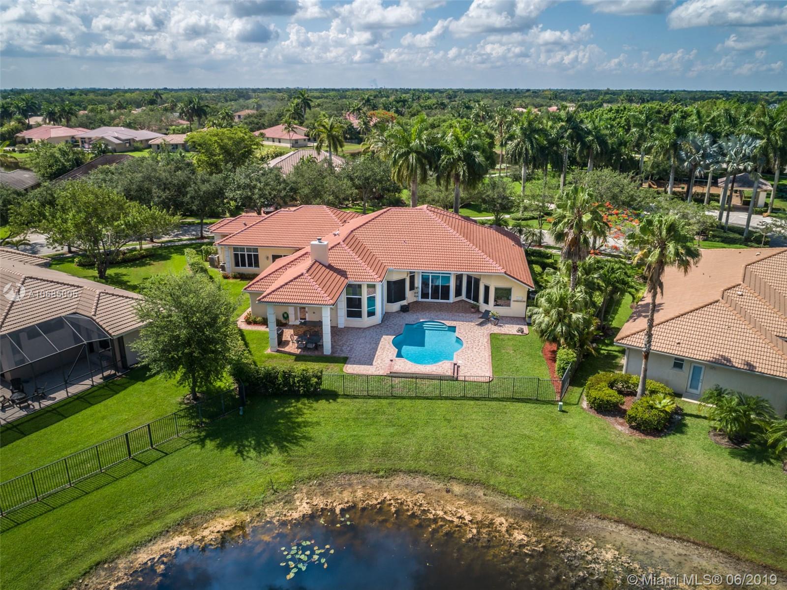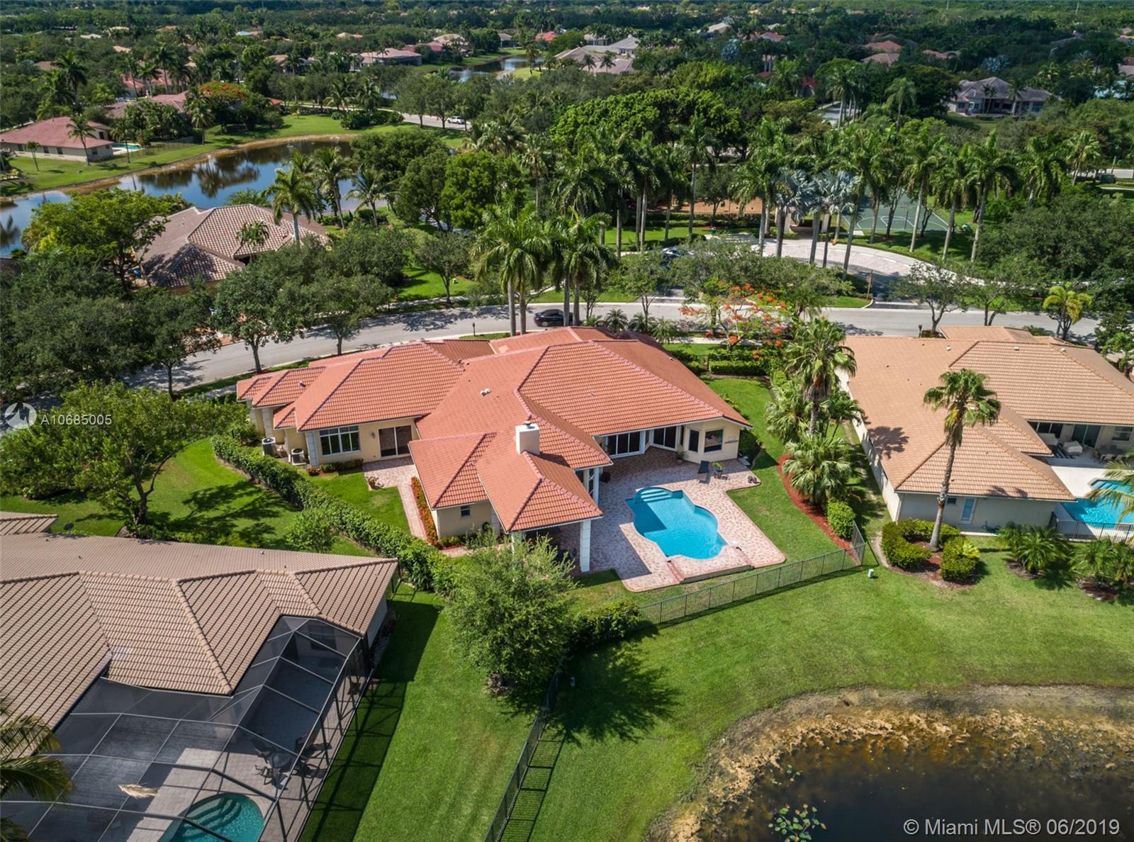 This is the one you have been waiting for. Expanded custom one story home on a private oversized 17,796 square foot lot. Enjoy long lake views with newly renovated heated pool - chlorinated but could be salt*cascading spa*spacious covered paver patio*summer kitchen*fully fenced*across the street from the community park. Chef's Delight kitchen*marble center island 9x5 with seating*top of the line Stainless Steel Appliances*Custom wood floors*Master bedroom with custom built in closet*glass doors*shoe closet*Marble Master Bath*Spa.Newer addition 2010 with full impact glass protection. Kid Wing includes large playroom*guest room*office* Newer Roof*Newer A/C's*Accordions*Fireplace