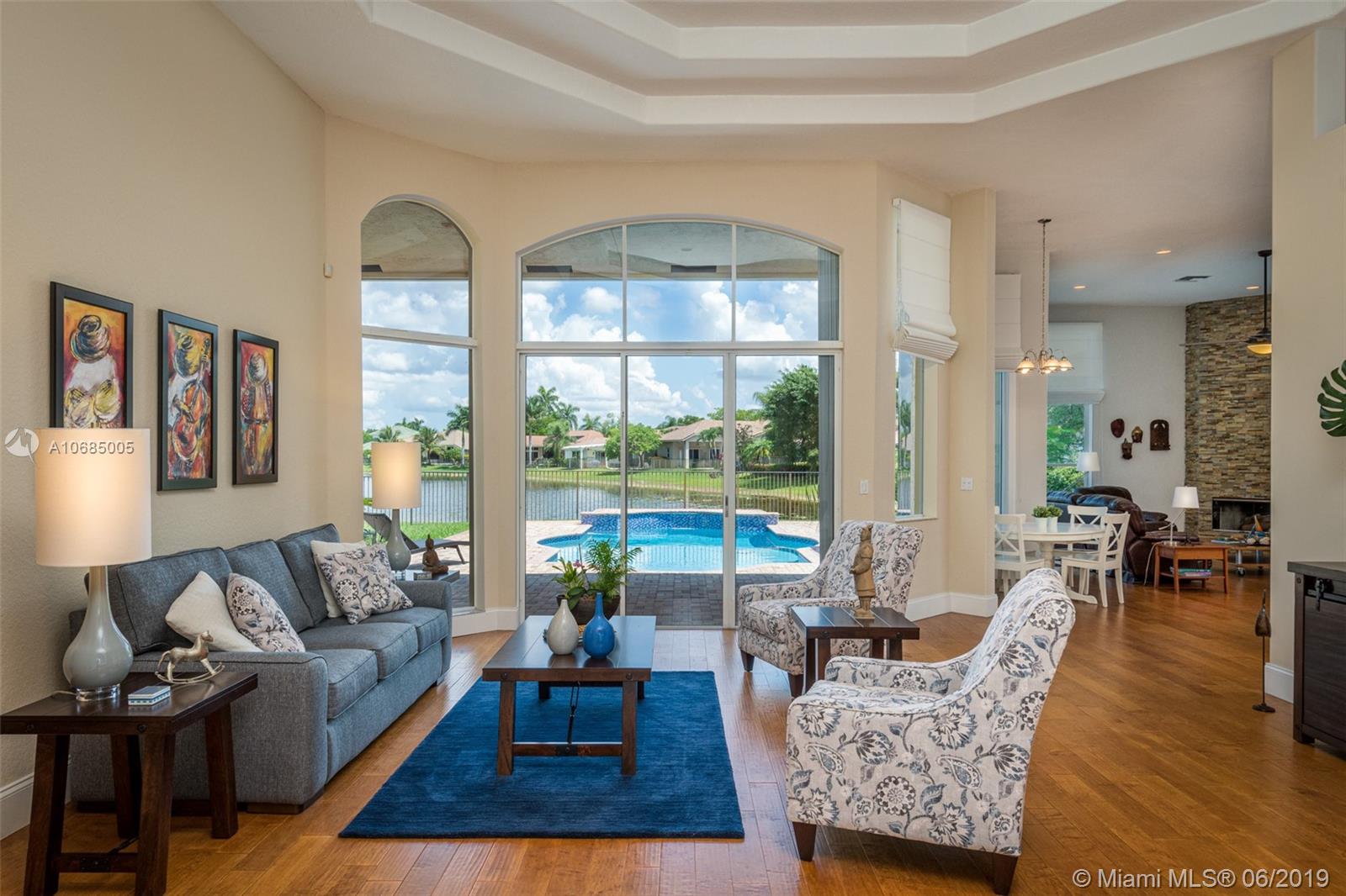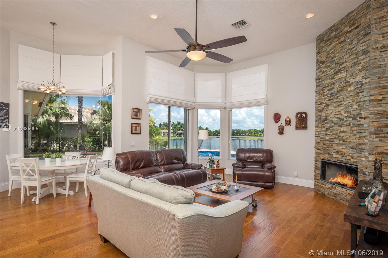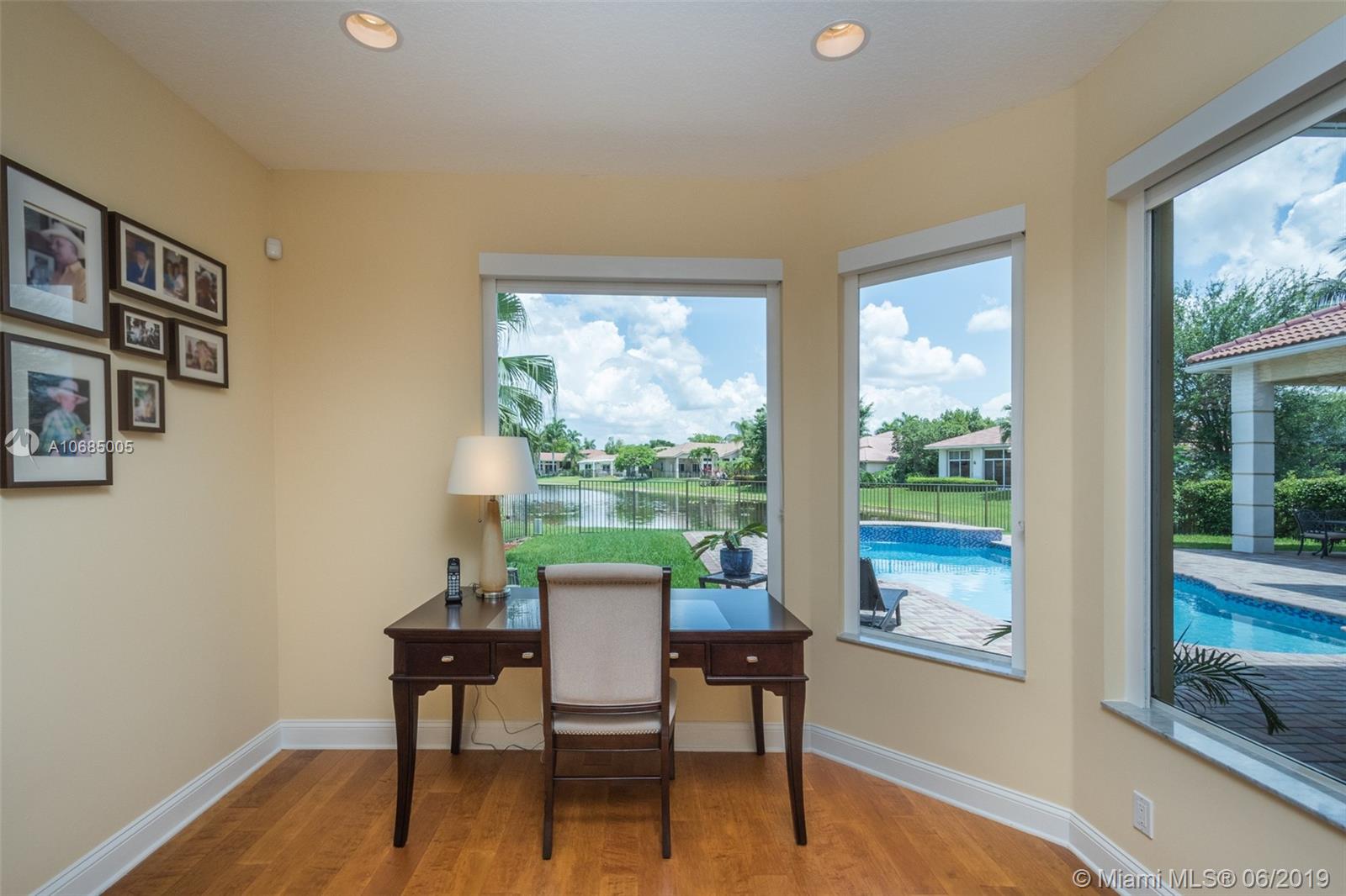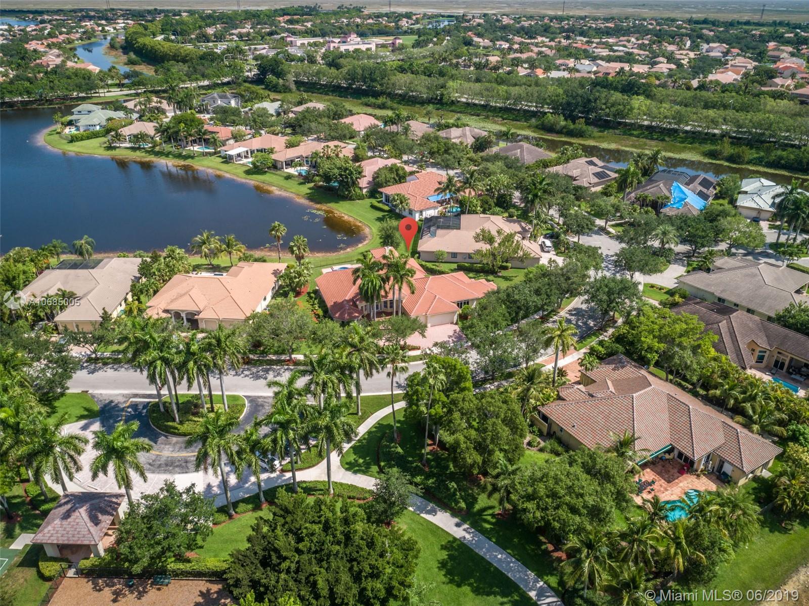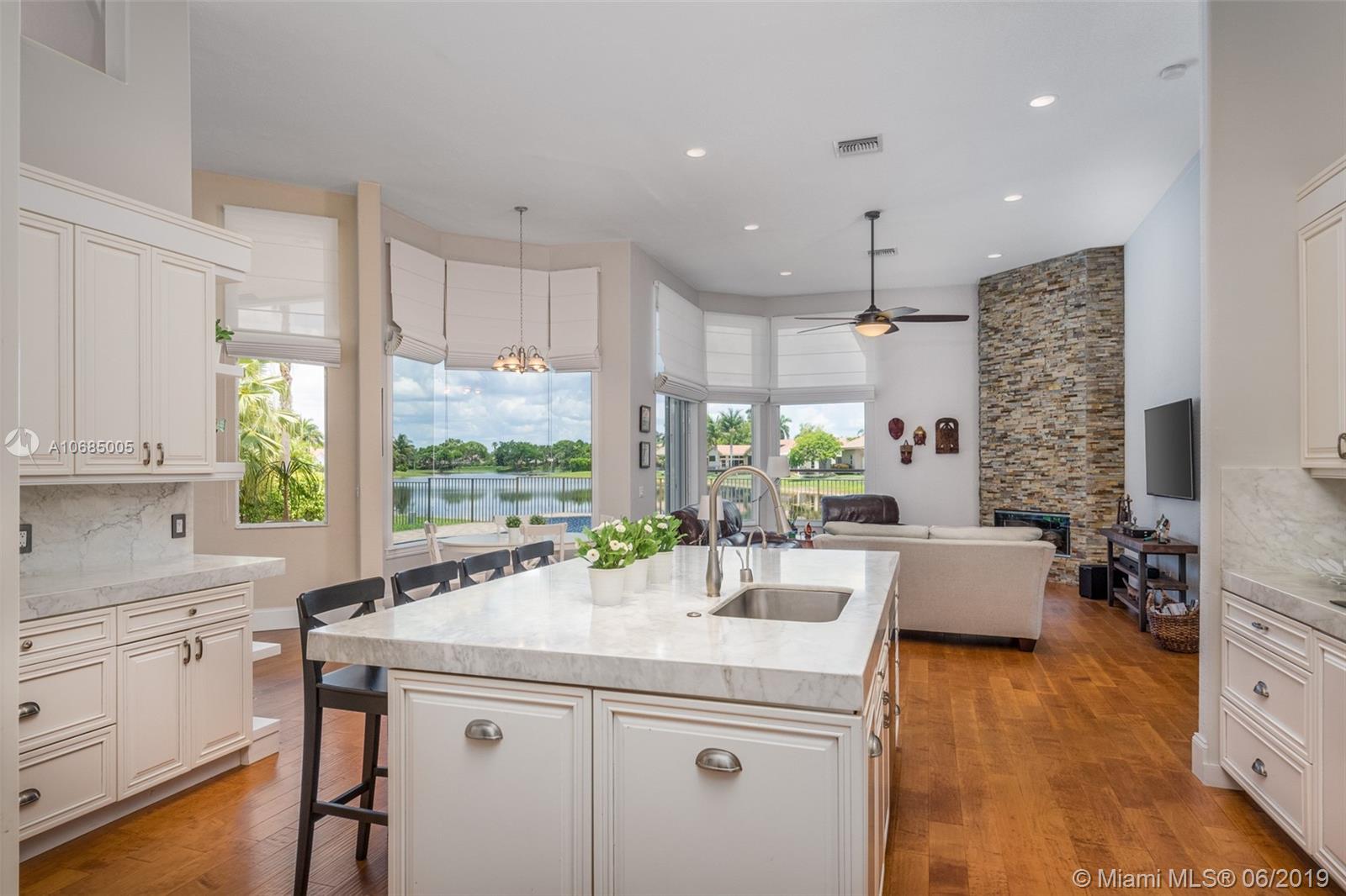 This is the one you have been waiting for. Expanded custom one story home on a private oversized 17,796 square foot lot. Enjoy long lake views with newly renovated heated pool - chlorinated but could be salt*cascading spa*spacious covered paver patio*summer kitchen*fully fenced*across the street from the community park. Chef's Delight kitchen*marble center island 9x5 with seating*top of the line Stainless Steel Appliances*Custom wood floors*Master bedroom with custom built in closet*glass doors*shoe closet*Marble Master Bath*Spa.Newer addition 2010 with full impact glass protection. Kid Wing includes large playroom*guest room*office* Newer Roof*Newer A/C's*Accordions*Fireplace