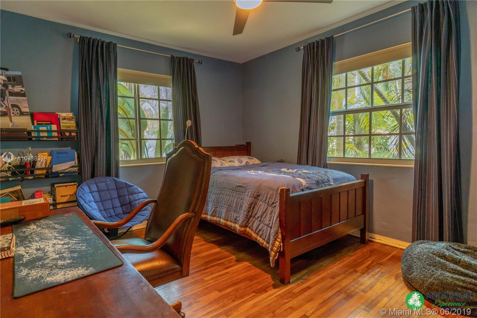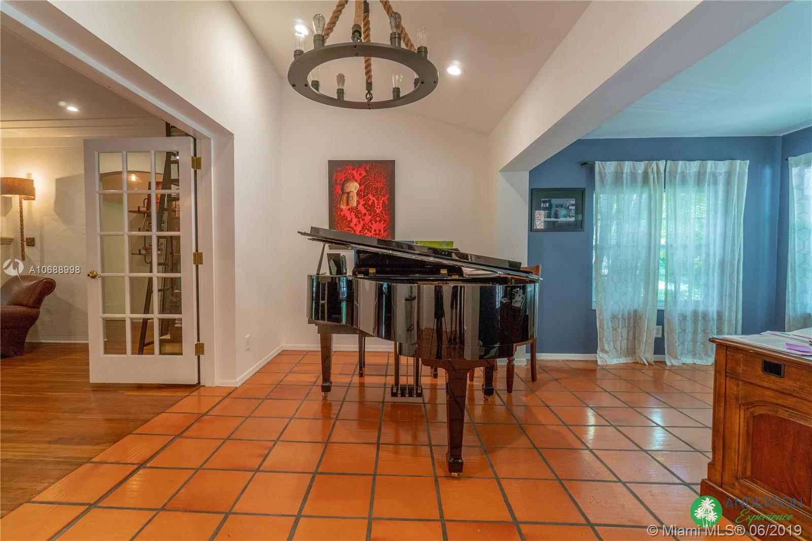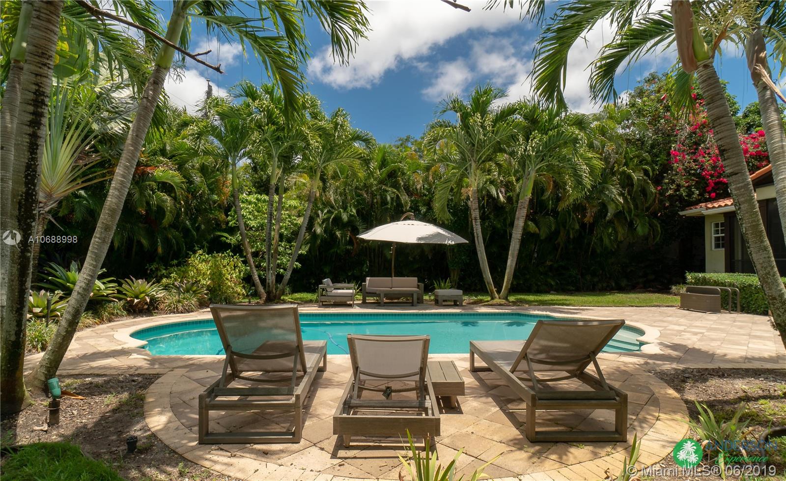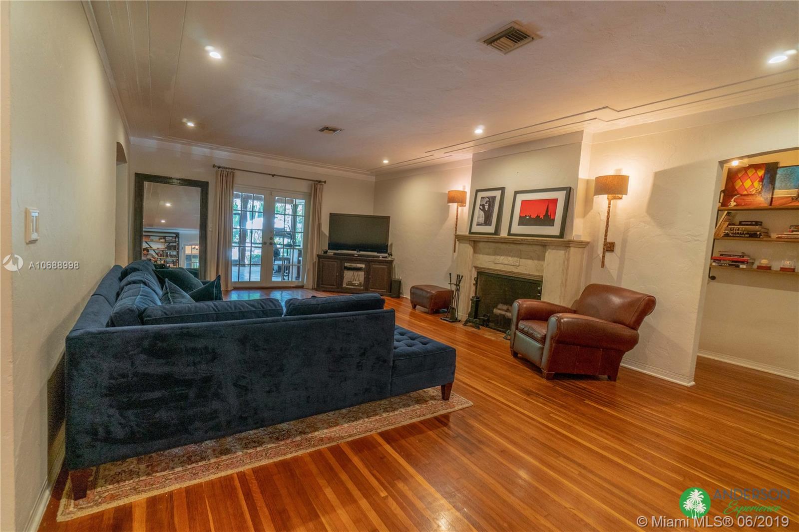 Great house to call home! Located a few blocks from Granada Golf Course and the Coral Gables Country Club. Built in 1944, this charming Art Deco home sits on a beautiful tree lined street w/ a circular driveway and a 1-car garage. The living room has beautiful Art Deco features in the ceiling & mantel of the working fireplace. The home is a split plan 3b/3b. The master bedroom features a walk-in closet & master bath w/ his n’ hers sinks. From the living room, French doors open to a huge screened in patio w/ wood beam vaulted ceiling, wet bar, serving station, and plenty of room for a dining table and seating area. Sparkling salt water pool with brick paved deck area, tropical landscaping, detached gazebo.