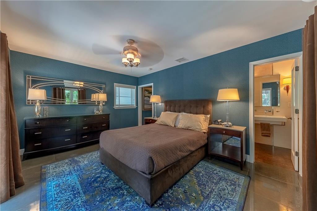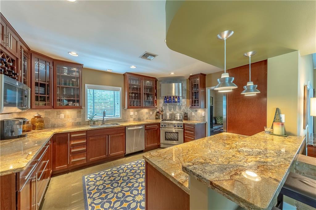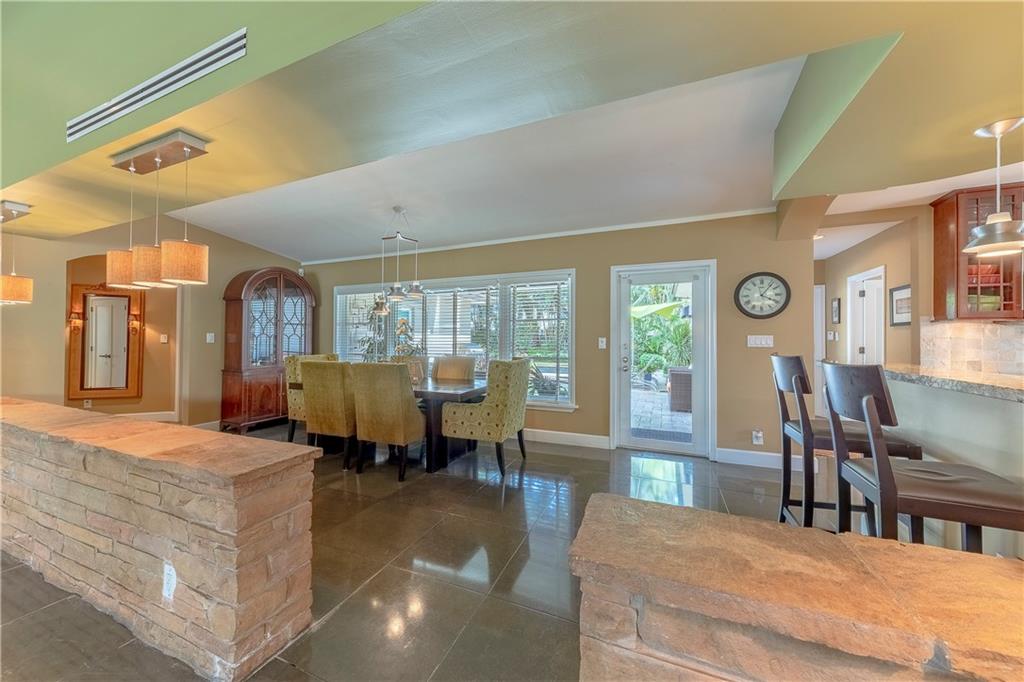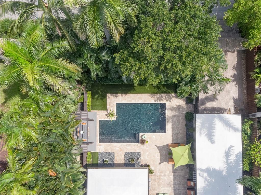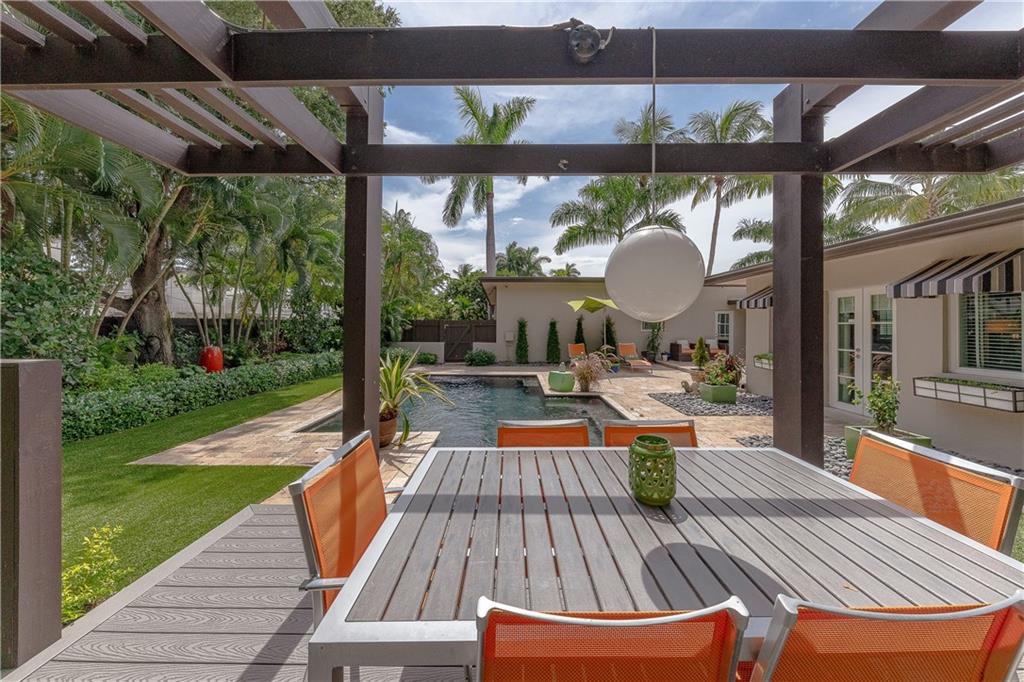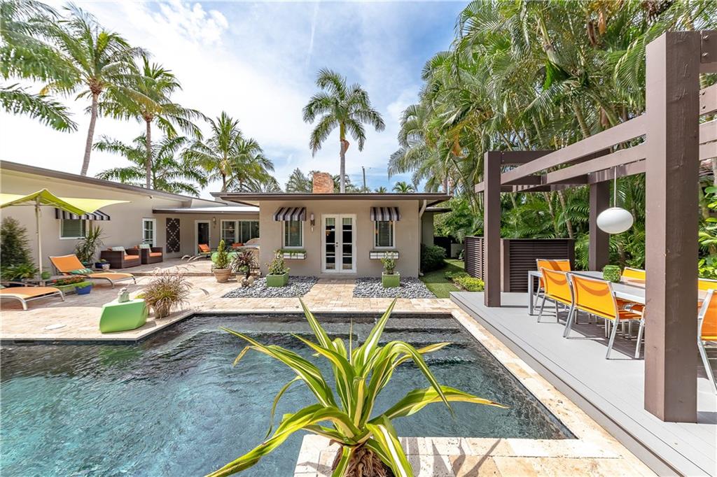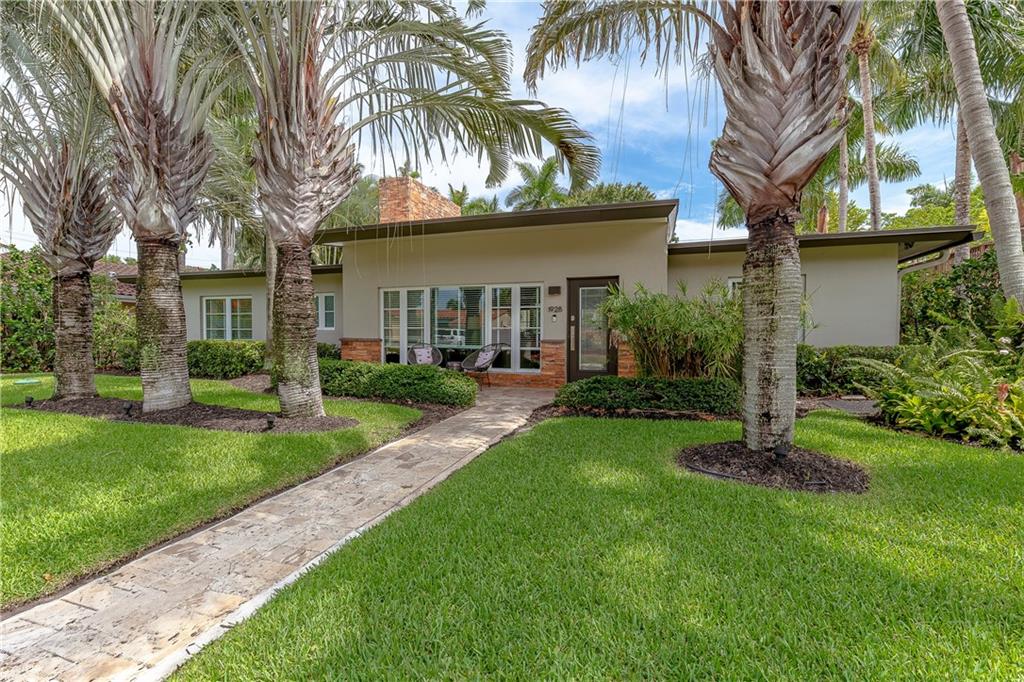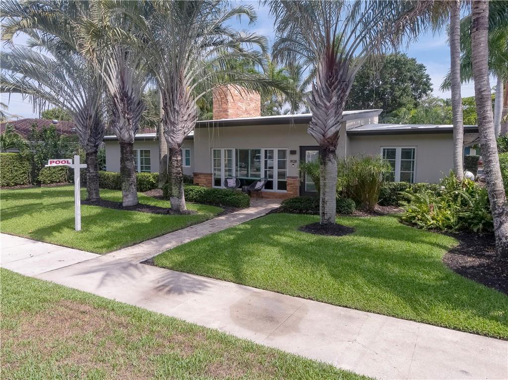 A beautifully modernized Victoria Park Mid-Century is a sterling representation from the Atomic period. This three bedroom, three bath home with a Den boasts an iconic stacked Sandstone wall and room divider, wood burning fireplace, soaring vaulted ceilings, polished slate flooring and sloping roof lines. Features include impact windows and doors, whole house generator, over-sized single bay garage with storage loft and Chef's kitchen with premium stainless appliances including a Thermador gas range, hardwood cabinetry and granite tops. A spacious Breakfast bar separates the kitchen from the dining room. The very private fenced yard is surrounded by spectacular architectural gardens with marble pavered terrace, thoughtful dining loggia overlook a sparkling pool.