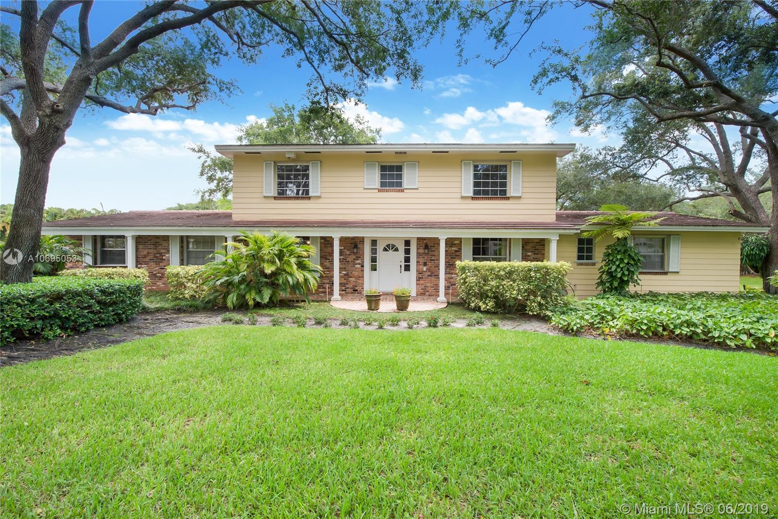 Located in Pinecrest's family-friendly walled community, The Elysium. This 6 bed / 4 full, 1 half bath residence is nestled on a lush manicured substantial 30,993 sf lot. This 2-story charming home is comprised of 3,598 sf and includes formal living and dining room, kitchen with breakfast nook, and family room overlooking the screened patio complete with covered terrace, pool, built-in barbecue and wet bar. Master Suite is located on the first floor and features a large walk-in closet, roman tub and separate shower. Double Jack and Jill floor plan upstairs. Laundry room off of the 2 car garage. Ideal for a developer interested in an opportunity in a great neighborhood. Dining Room chandelier excluded from sale. Minutes from A+ rated schools, shops and restaurants.