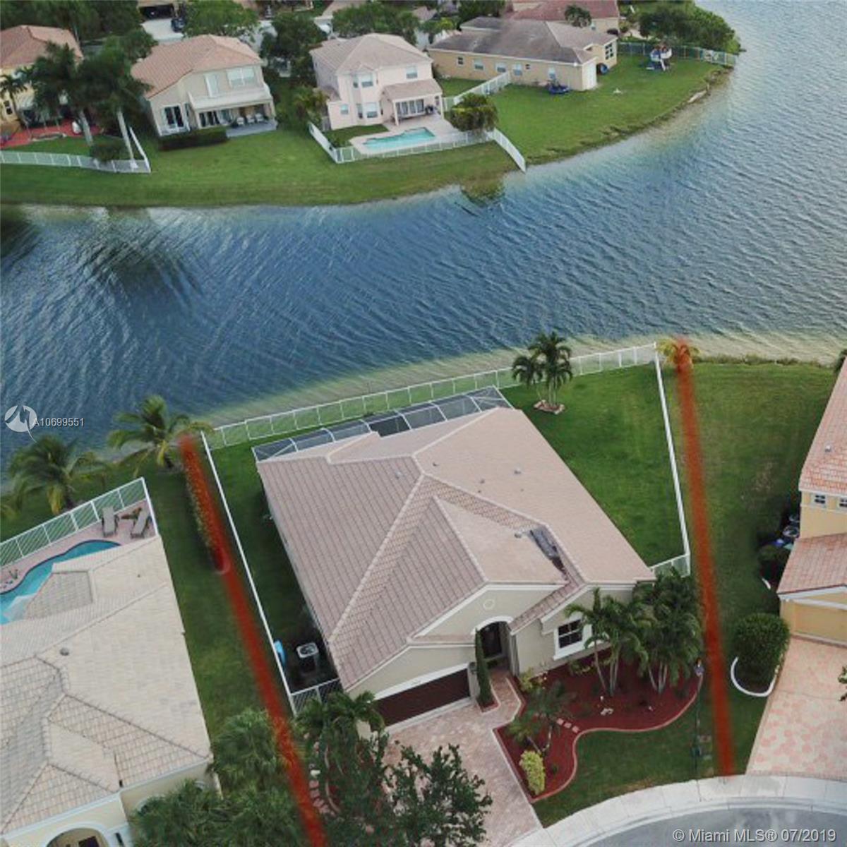 Beautiful one story 4 BR 2.5 BA w/ lakefront home on oversized lot in cul de sac in Prestigious Riviera Isles. All stainless steel upgraded kitchen appliances, upgraded corian counter tops; Newly painted interior & exterior; Tile floors throughout; Bedroom floors are upgraded wood laminate; Decorative glass double front doors; 12 ft high ceilings throughout, 8 ft raised panel interior doors; upgraded baseboards. Brand new AC unit. 2 yr old water heater. House is well maintained by original owners. Includes large screened in patio w/ pavers. Fenced backyard w/ new landscaping on large lake. Walk to to beautiful clubhouse – w/ large pool, waterfalls, jacuzzi, extra large gym w/ newest equipment, tennis courts & basketball courts. Close to I75 and convenient 25 minute access to FLL and MIA.