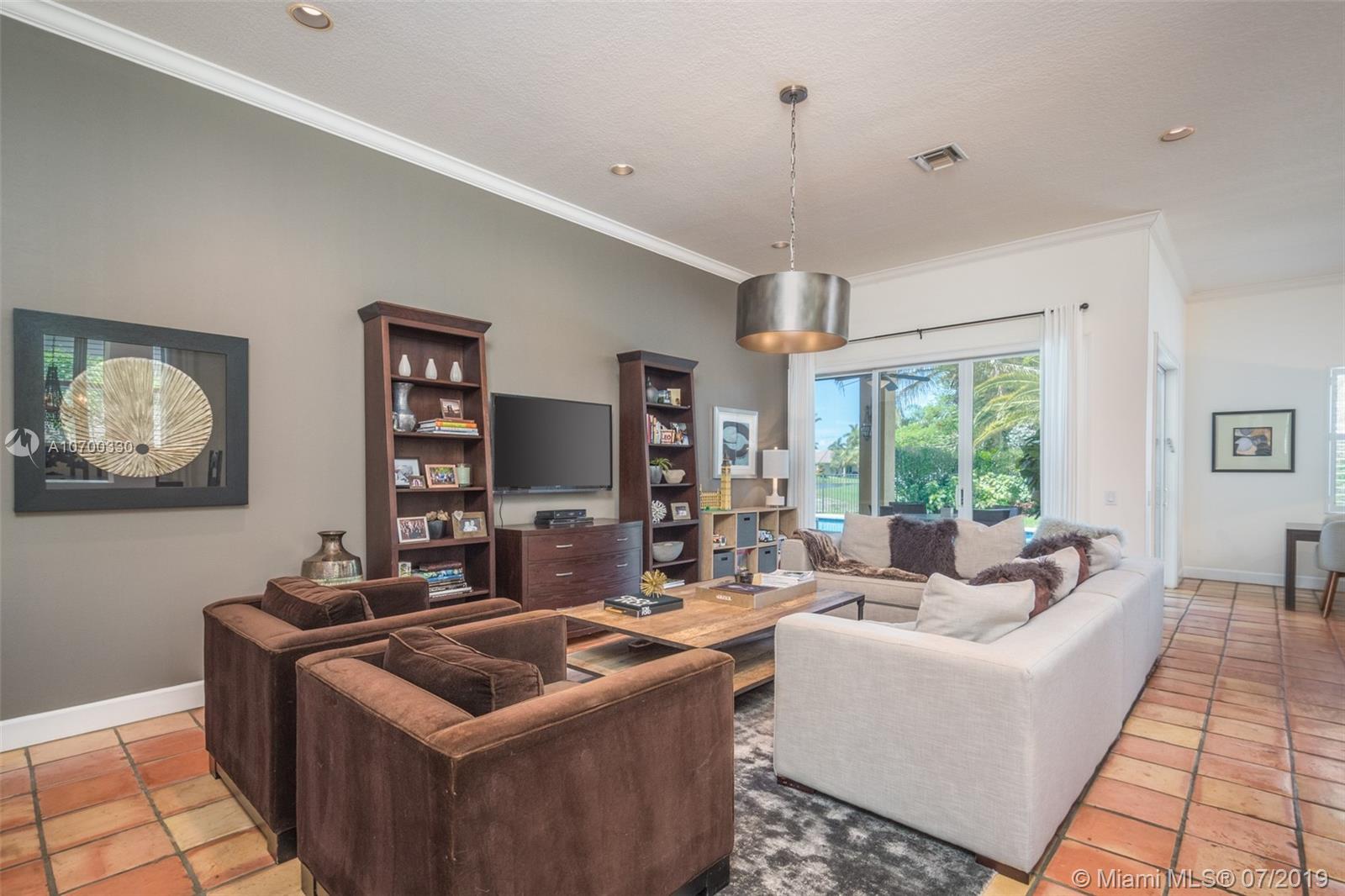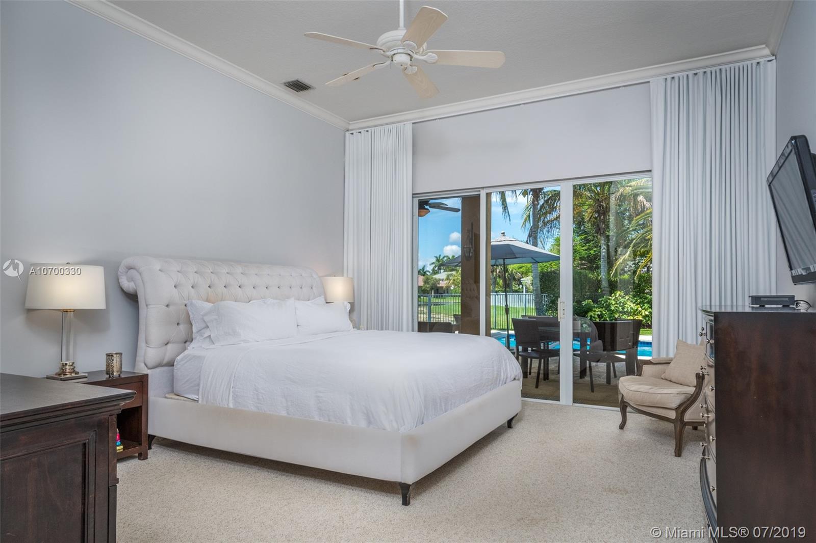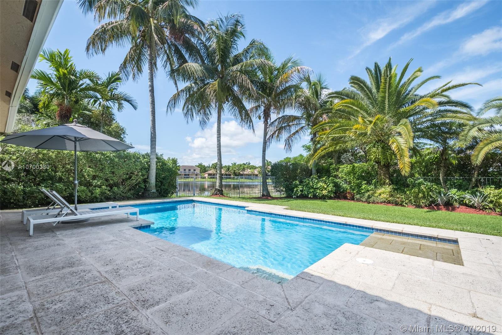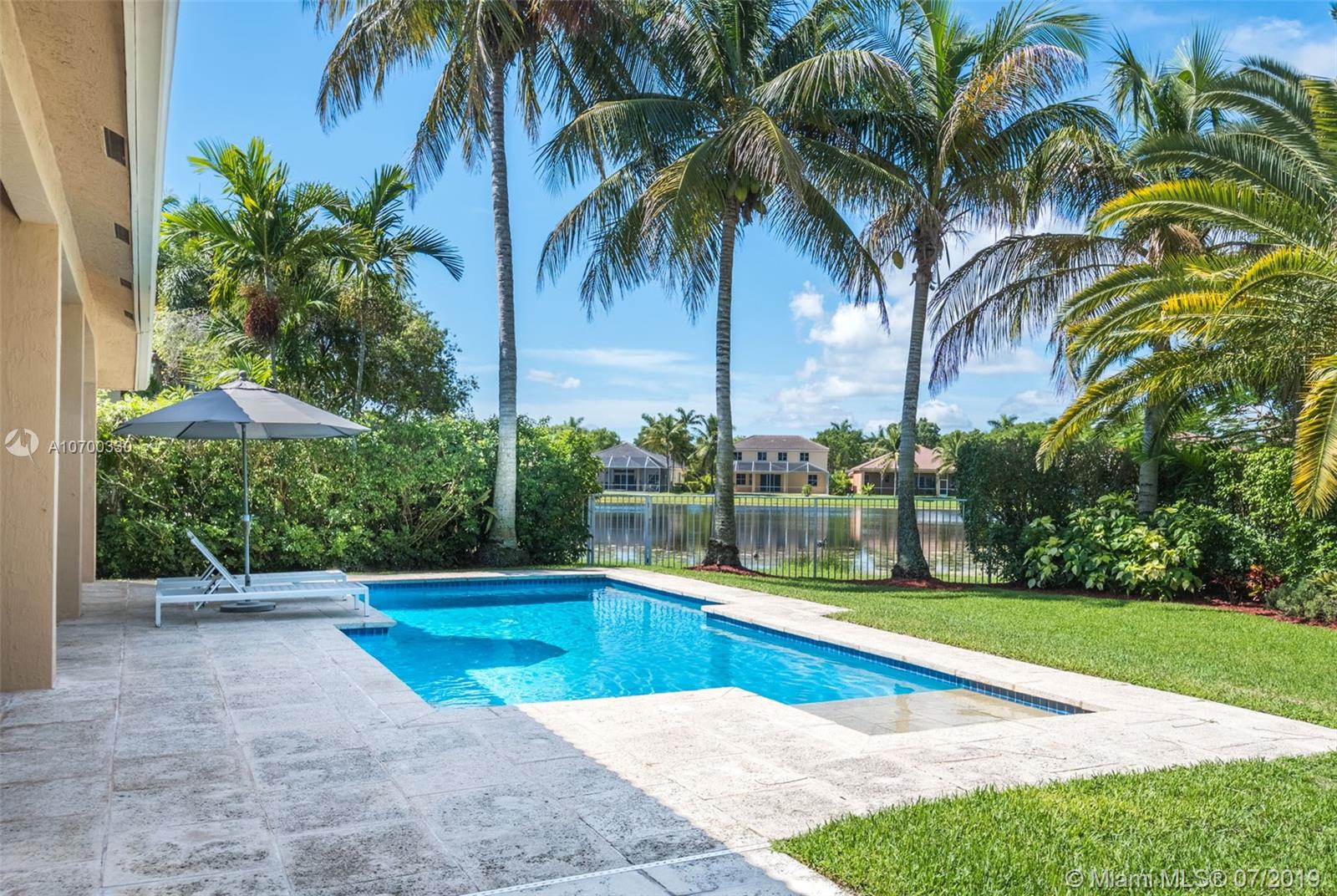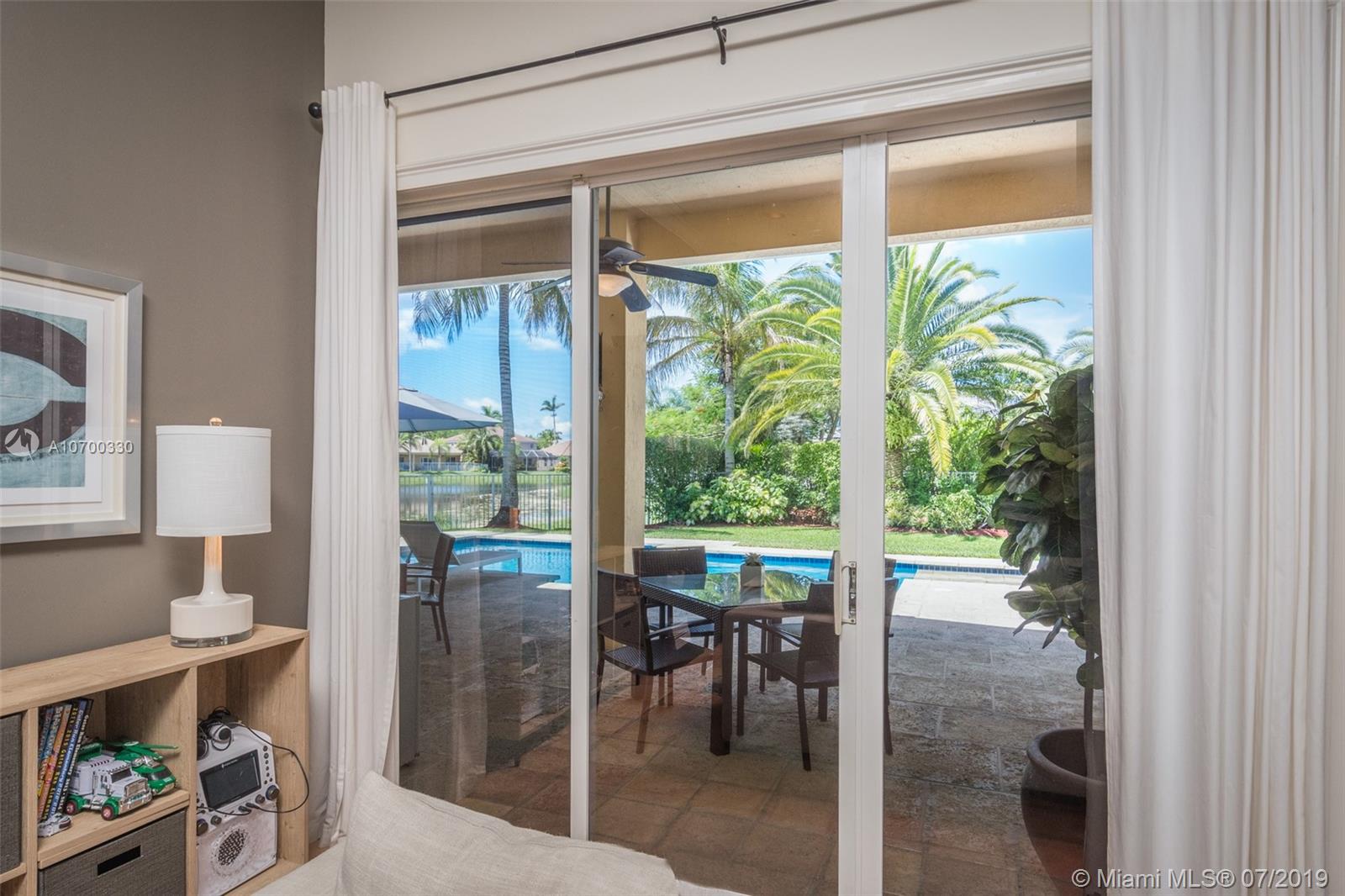 Tucked on a 11,625 square foot lot, ficus hedged for privacy. Popular Dove model with soaring ceilings and custom contemporary heated pool with full length covered patio with privacy shade curtain. Fully fenced with plenty of room for a play set and beautiful view of the lake. Three sets of sliders to pool. Spacious kitchen with loads of cabinets, center island with granite and large pantry. Shows light and bright. Plantation shutters and crown moldings throughout. Shows like a model out of Restoration Hardware. Great curb appeal. Hurricane protection. Walk to community pool/water slide and amenities.