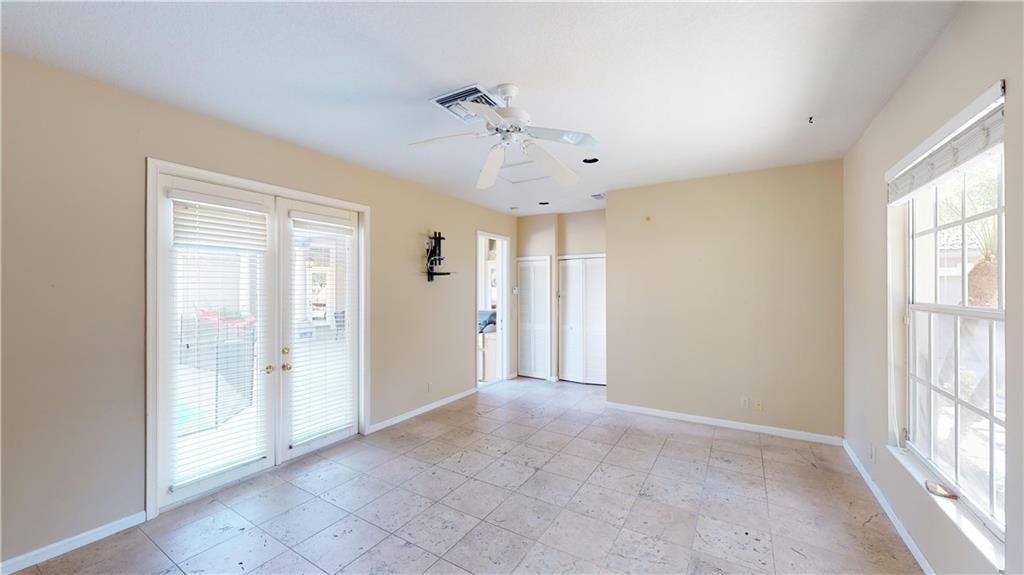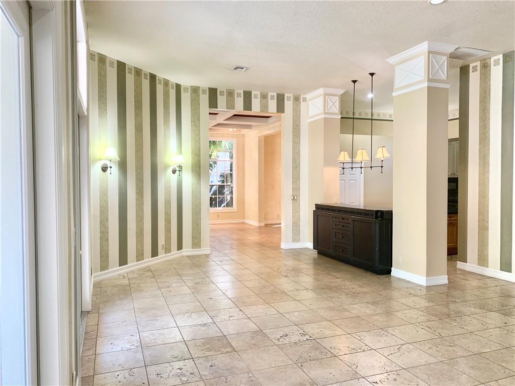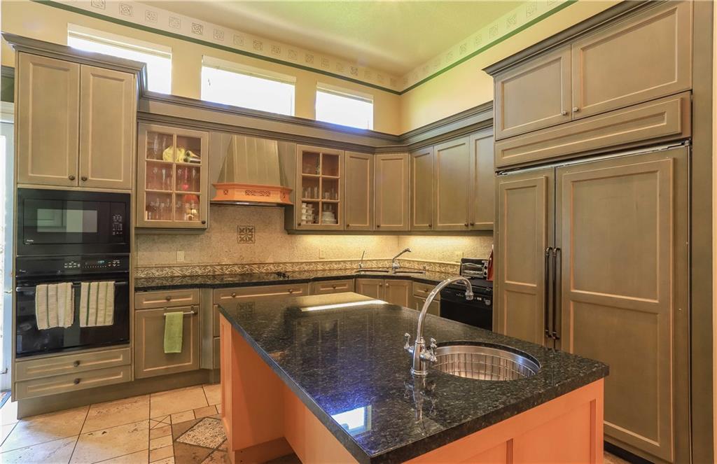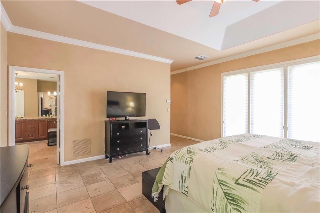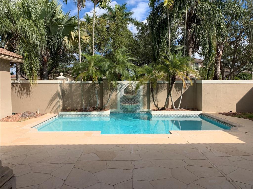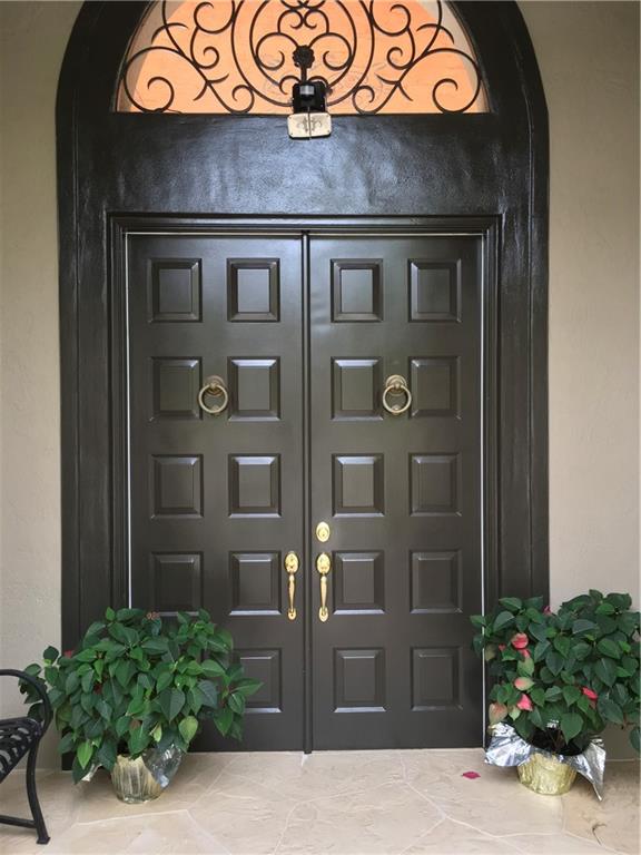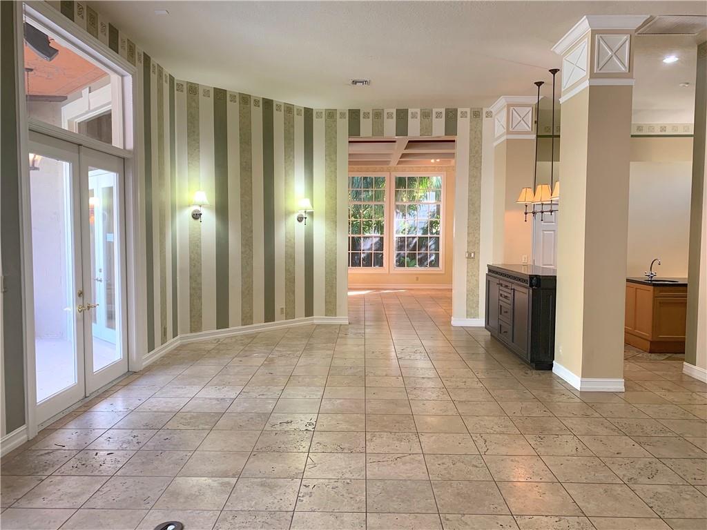 A must see! one-story corner lot home with 6 rooms which includes a custom built office and a guest house + 4.5 baths. 2 car-garage + additional parking space. Courtyard home entrance great for entertaining and extra privacy. Patio/pool area w/Roman columns, tall French doors & custom ceiling design. Inside, travertine floors, coffered ceilings, large windows facing the backyard, plantation shutters, detailed moldings, venetian plaster plus other designer touches. Kitchen w/gourmet center island, wood cabinetry and granite countertop. Guard gated community. Property walled & hedge for privacy. Free flow split Plan w/rooms on opposite sides for maximum privacy. The setting is private, the outside garden is lush and scenic. Walking distance to community play area. A+ schools.