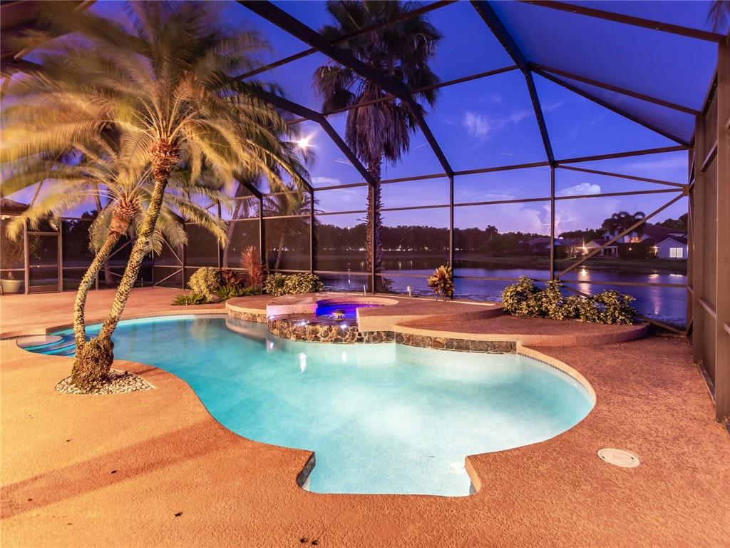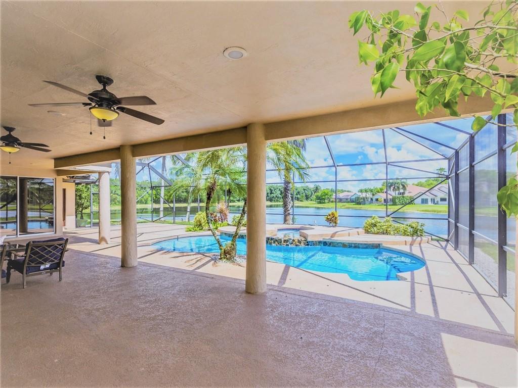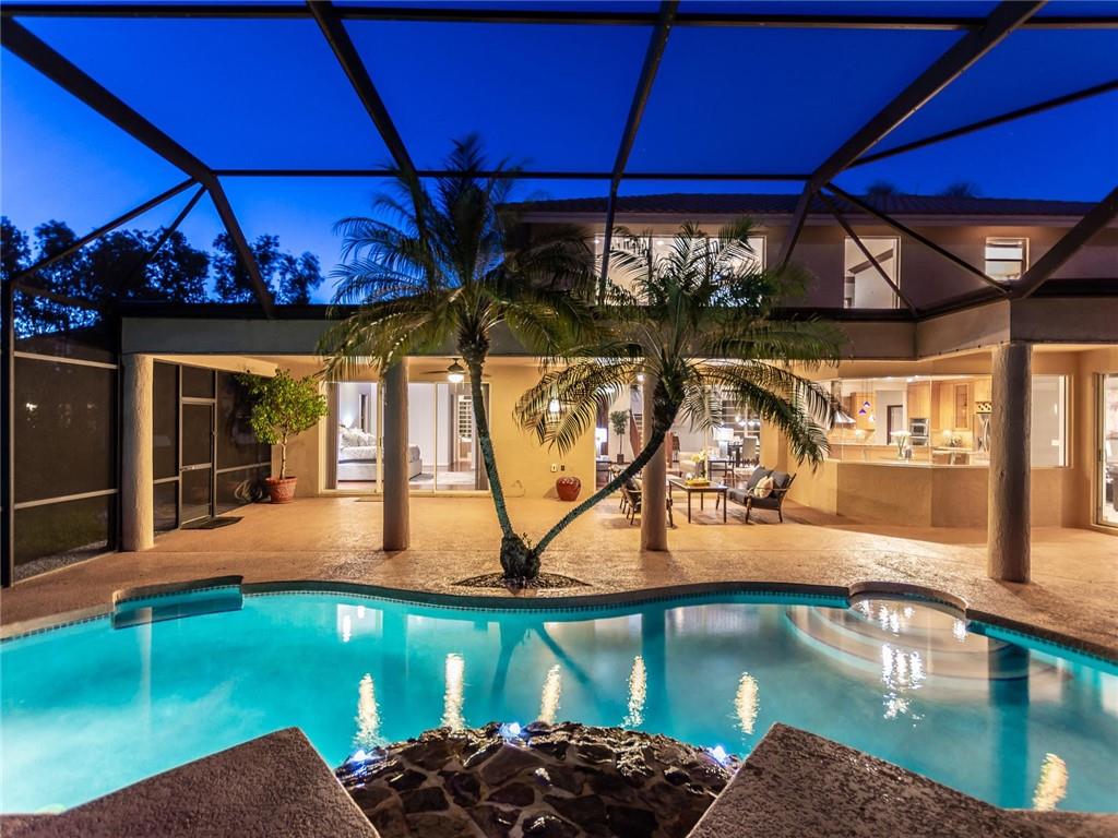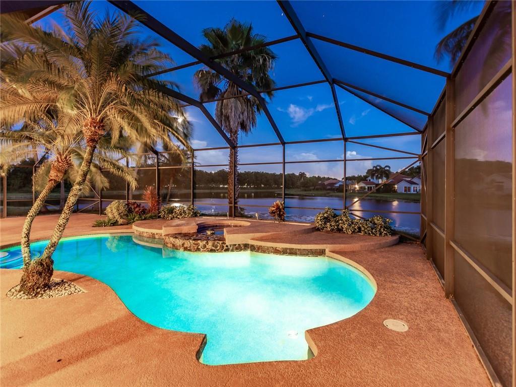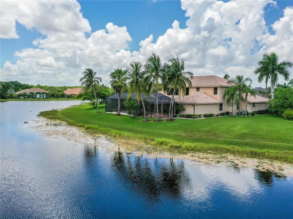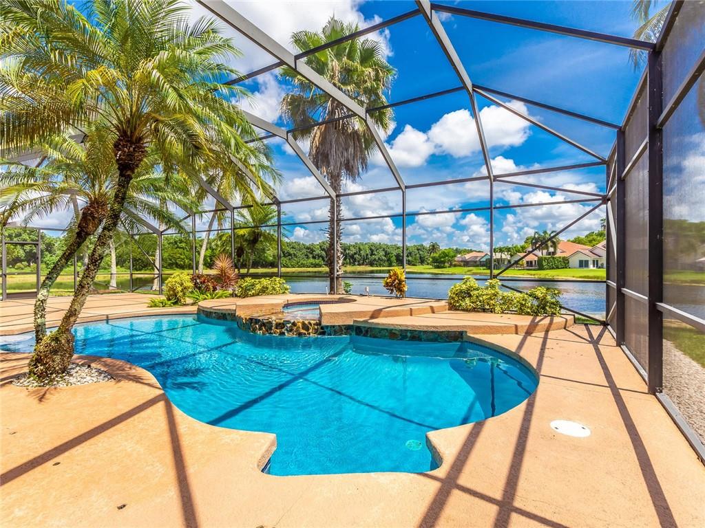 AMAZING HUGE pie-shape culdesac LAKEFRONT lot, OVER half acre, wrap-around WATER views & tons of LAND in upscale boutique Palm Island! Professionally staged, beautifully maintained 5/5/3CG w/salt-chlorinated heated pool/raised spa & long covered patio, screened for year-round comfort! Downstairs spacious Master Suite, Inlaw/Guest Suite + Full Cabana Bath, all with updated bathrooms! Upstairs, 3/2 Kids wing. Stainless/Granite Kitchen w/center island, trendy lighting. Freshly painted interior, new garage epoxy floors, 5-Ton AC compressor 2018. New fans, rose-wood floors in master & living area, new irrigation piping, pool pump, landscape. 3ACs, 2 Hot Water Heaters (one hybrid), custom closets & more! Tot lot, A+ Schools! (Price reflects no shutters, upstairs has original bathrooms & carpet).