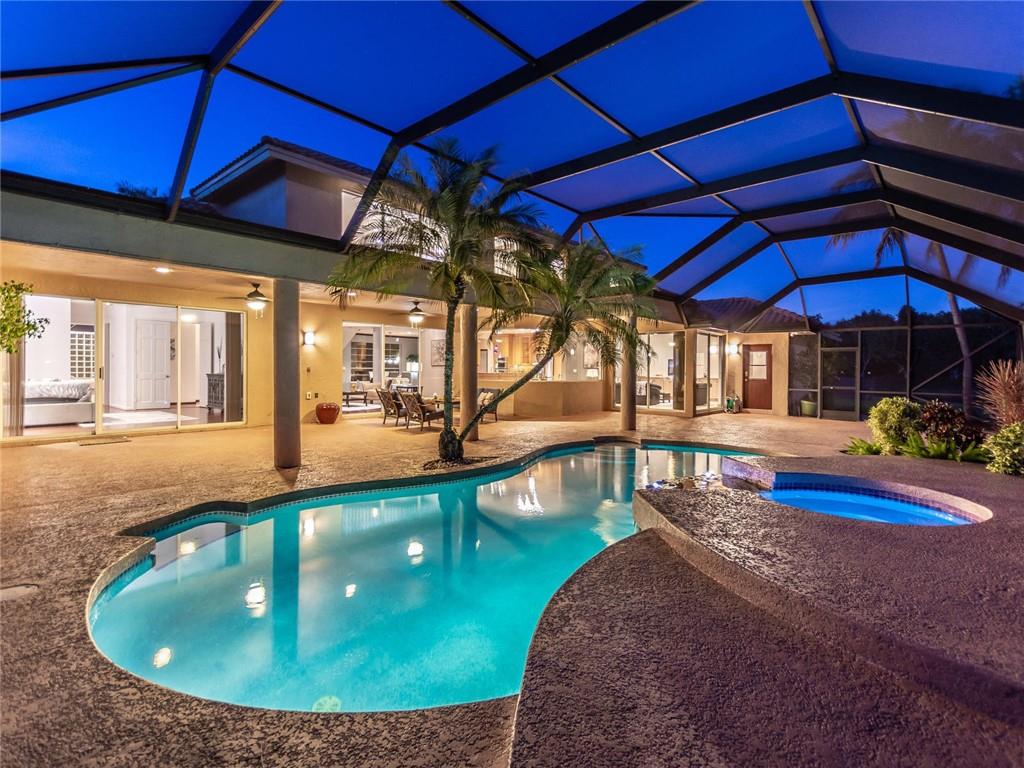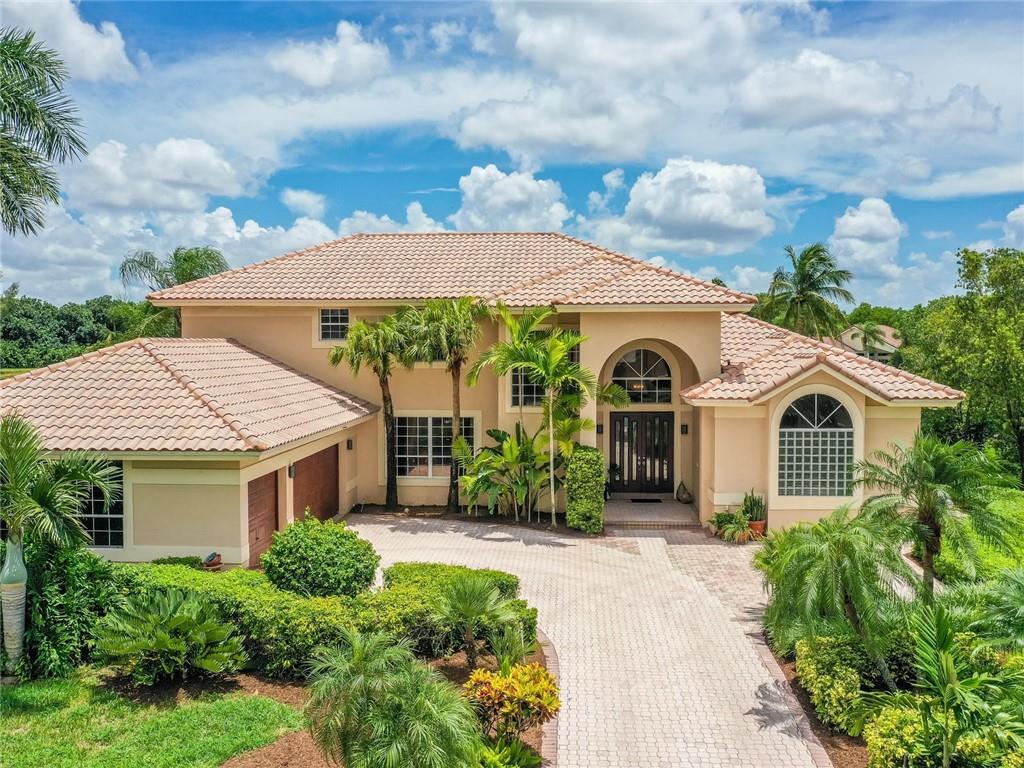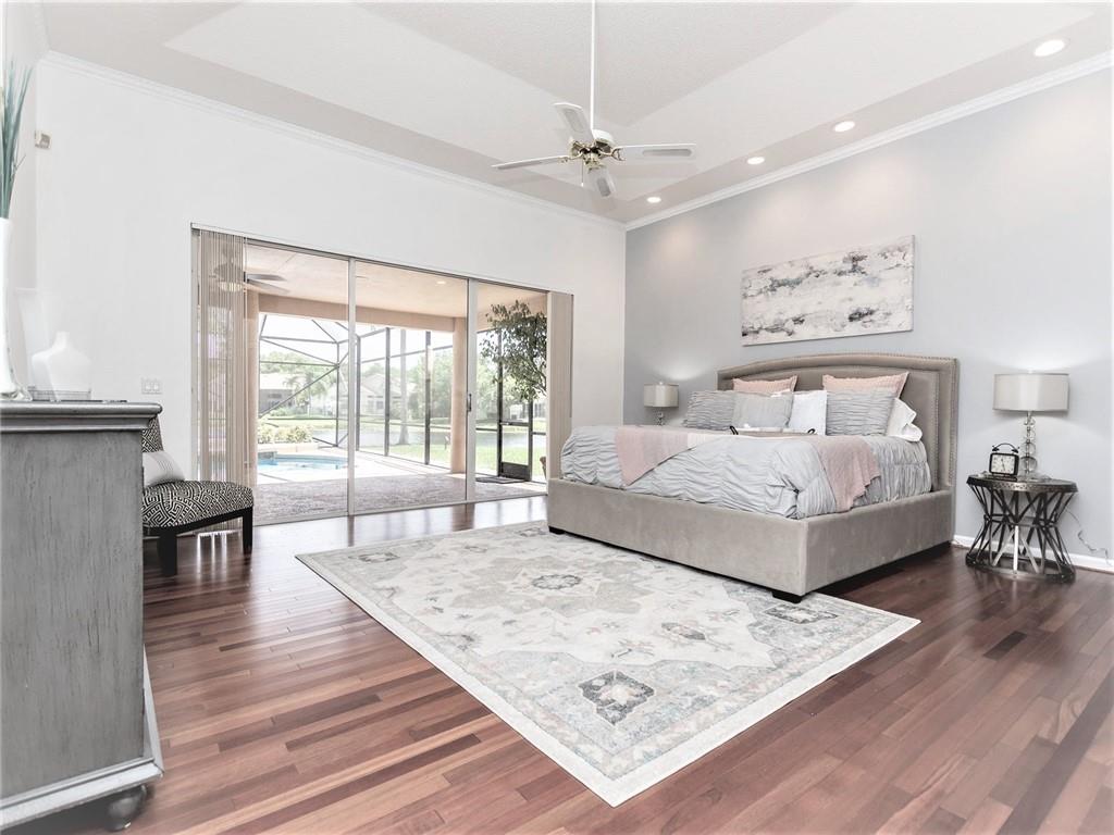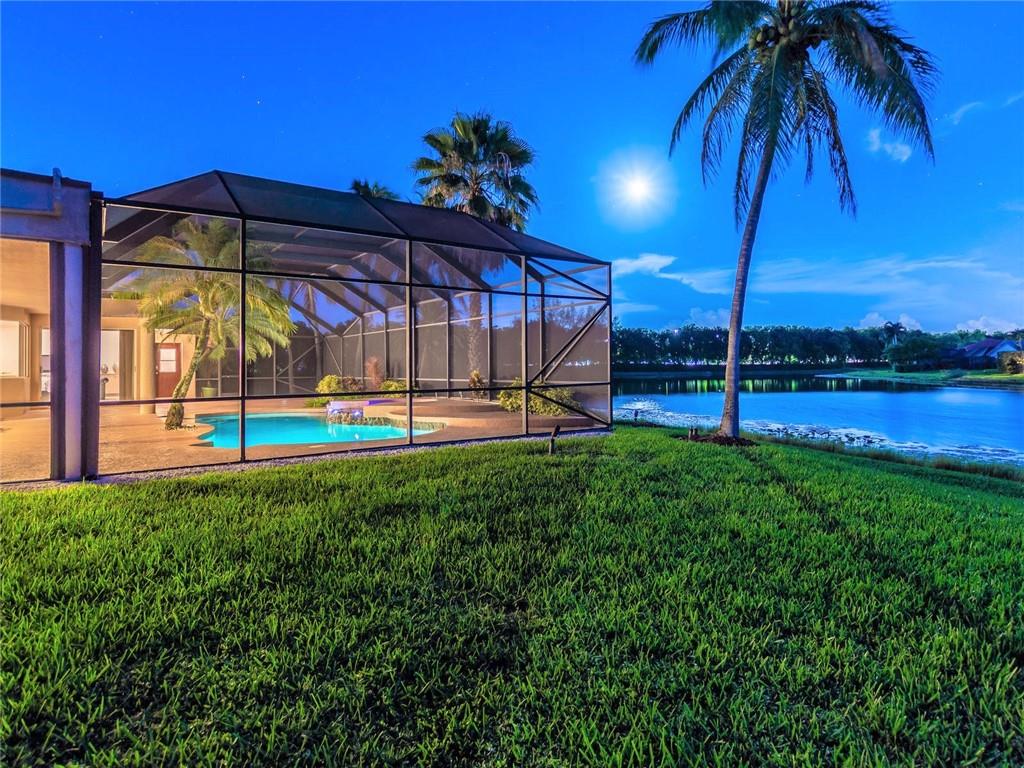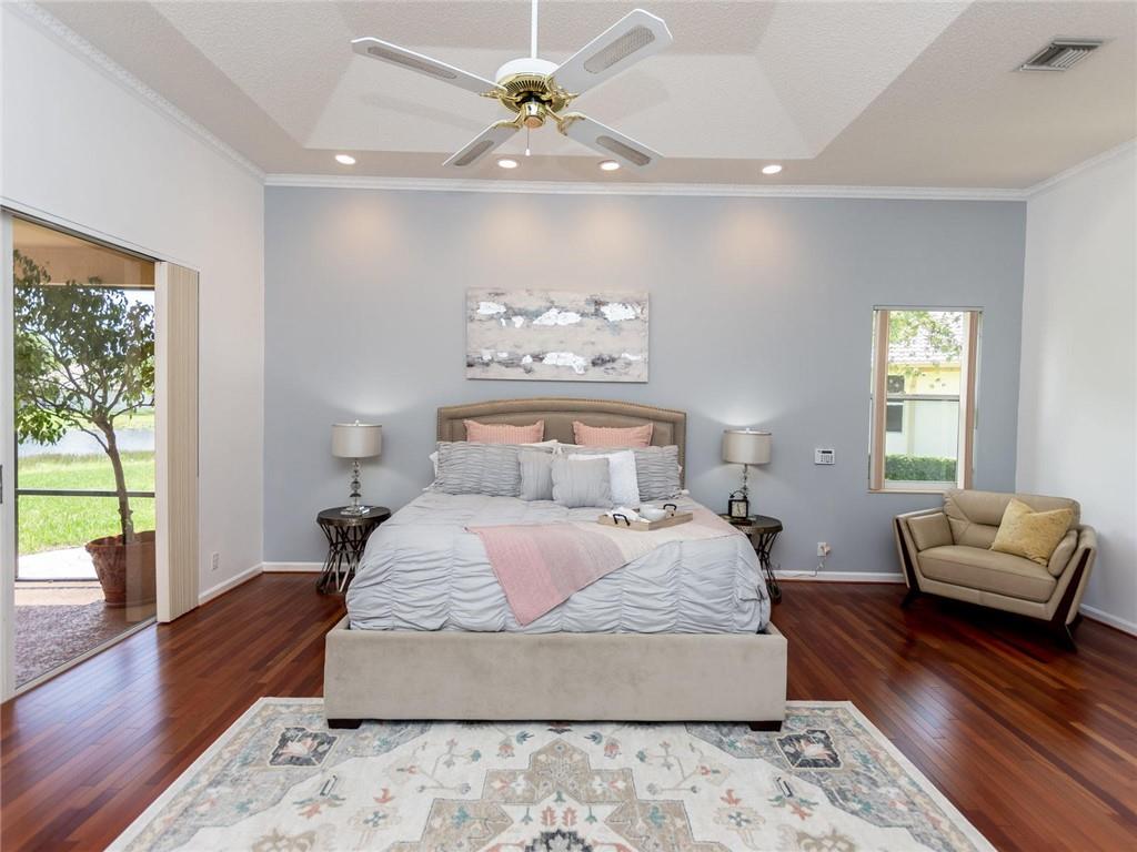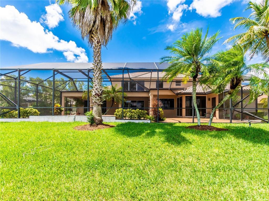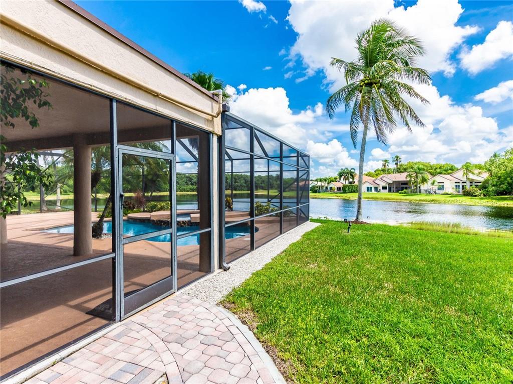 AMAZING HUGE pie-shape culdesac LAKEFRONT lot, OVER half acre, wrap-around WATER views & tons of LAND in upscale boutique Palm Island! Professionally staged, beautifully maintained 5/5/3CG w/salt-chlorinated heated pool/raised spa & long covered patio, screened for year-round comfort! Downstairs spacious Master Suite, Inlaw/Guest Suite + Full Cabana Bath, all with updated bathrooms! Upstairs, 3/2 Kids wing. Stainless/Granite Kitchen w/center island, trendy lighting. Freshly painted interior, new garage epoxy floors, 5-Ton AC compressor 2018. New fans, rose-wood floors in master & living area, new irrigation piping, pool pump, landscape. 3ACs, 2 Hot Water Heaters (one hybrid), custom closets & more! Tot lot, A+ Schools! (Price reflects no shutters, upstairs has original bathrooms & carpet).