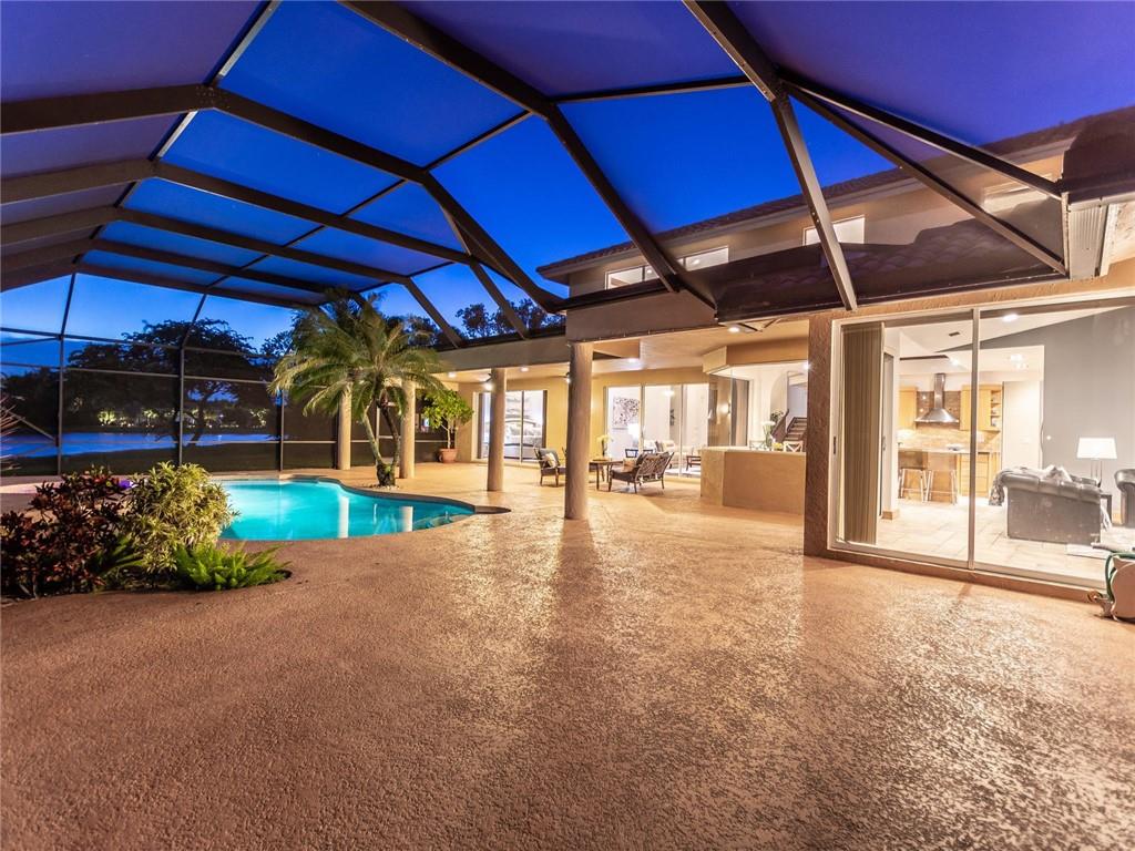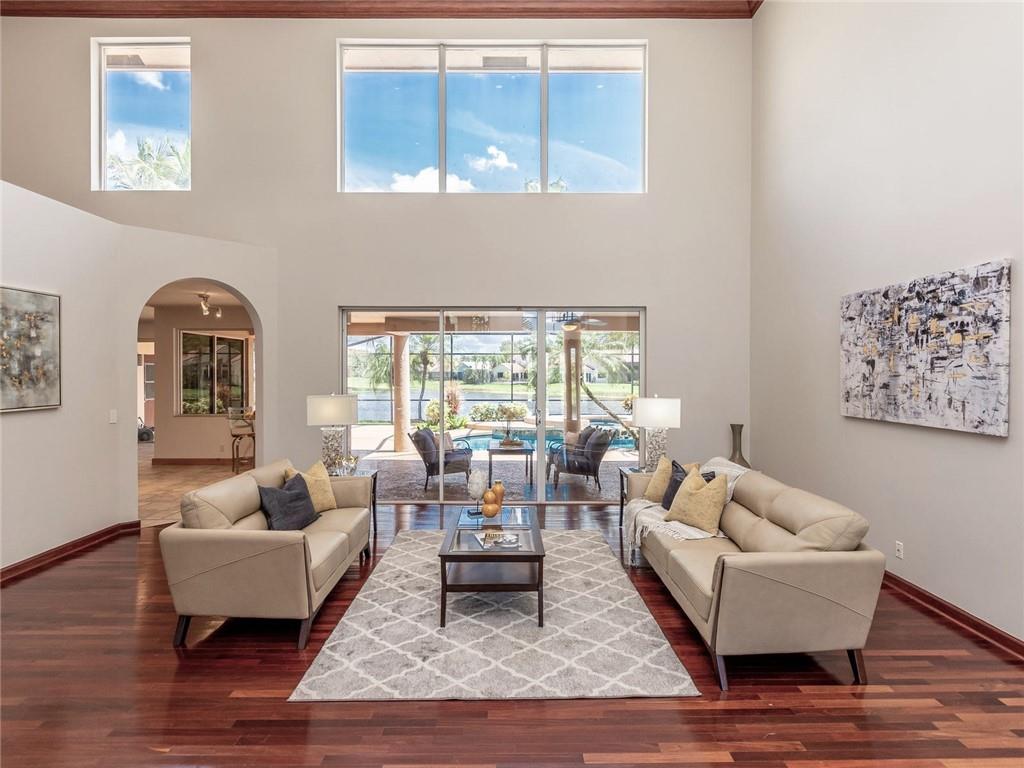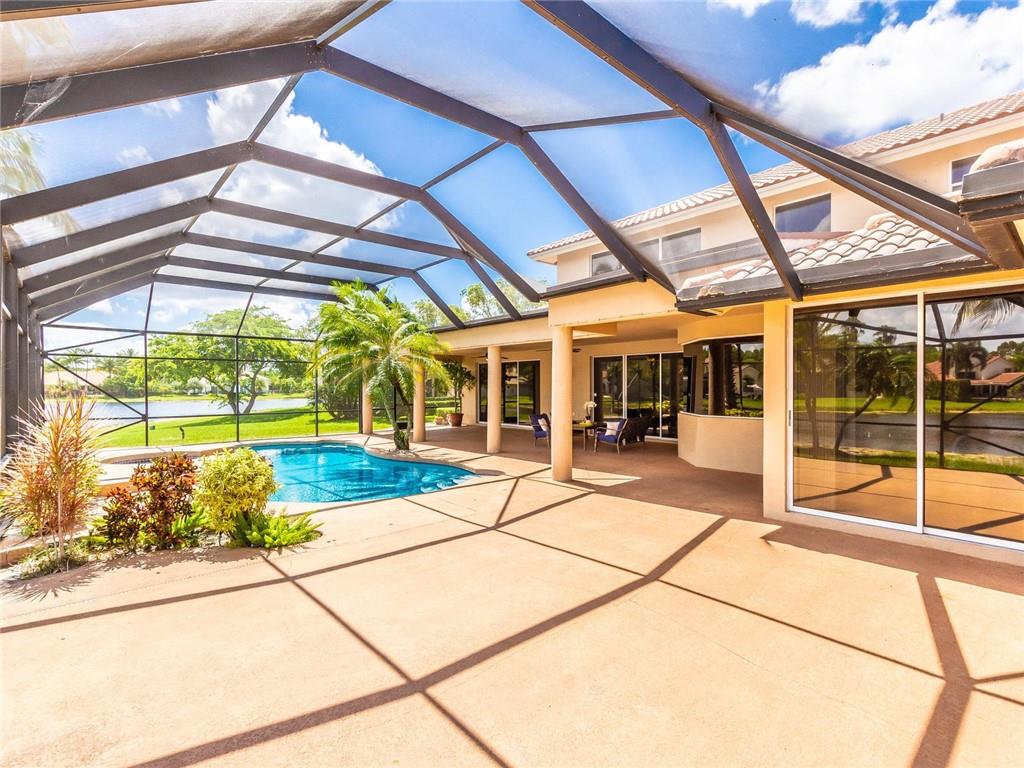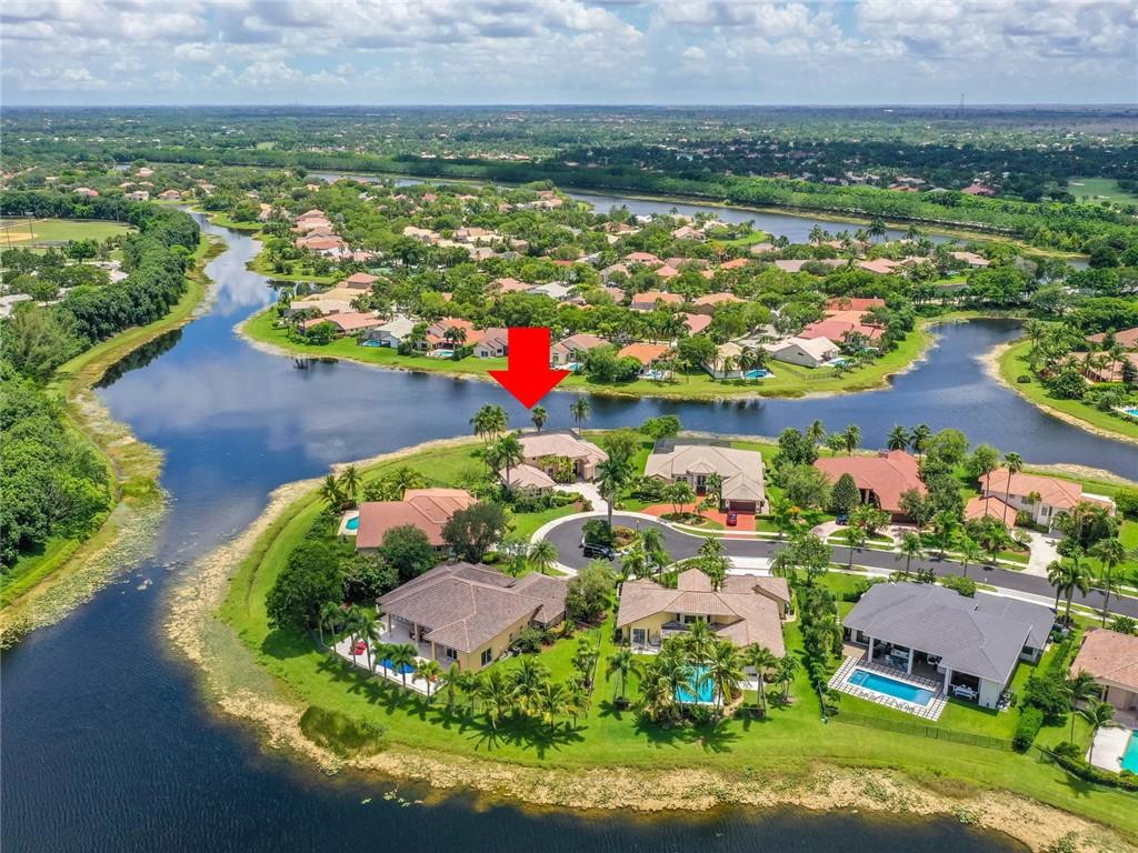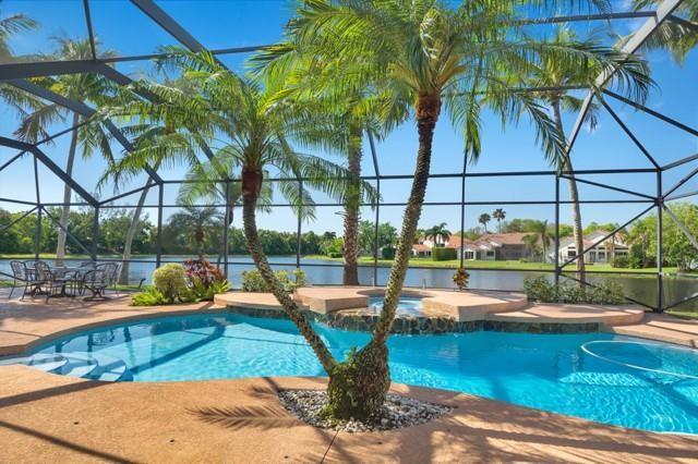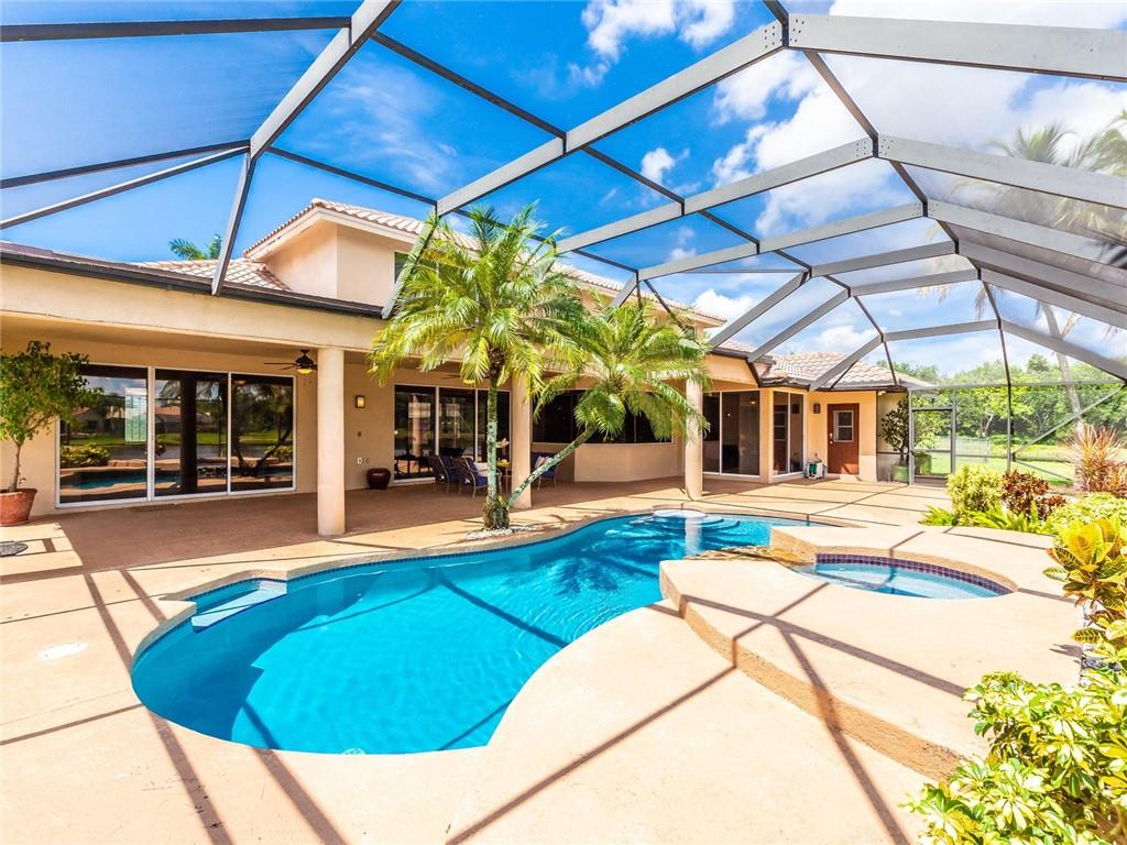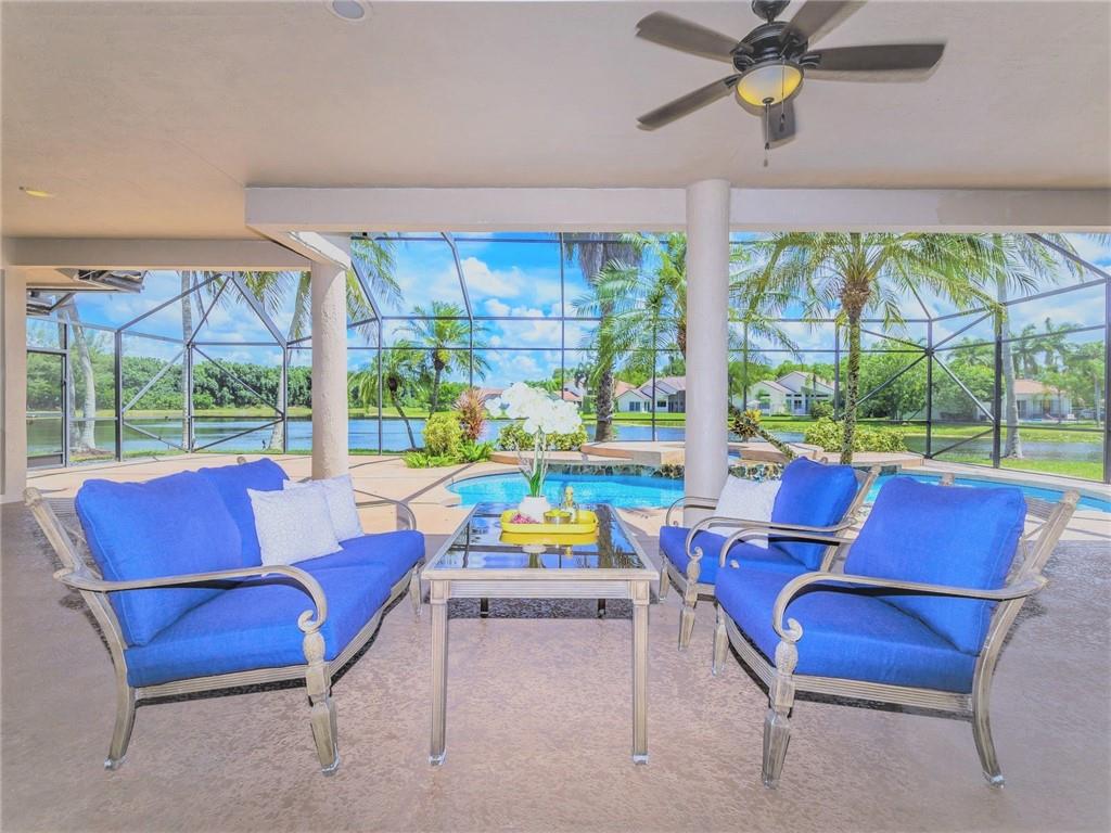 AMAZING HUGE pie-shape culdesac LAKEFRONT lot, OVER half acre, wrap-around WATER views & tons of LAND in upscale boutique Palm Island! Professionally staged, beautifully maintained 5/5/3CG w/salt-chlorinated heated pool/raised spa & long covered patio, screened for year-round comfort! Downstairs spacious Master Suite, Inlaw/Guest Suite + Full Cabana Bath, all with updated bathrooms! Upstairs, 3/2 Kids wing. Stainless/Granite Kitchen w/center island, trendy lighting. Freshly painted interior, new garage epoxy floors, 5-Ton AC compressor 2018. New fans, rose-wood floors in master & living area, new irrigation piping, pool pump, landscape. 3ACs, 2 Hot Water Heaters (one hybrid), custom closets & more! Tot lot, A+ Schools! (Price reflects no shutters, upstairs has original bathrooms & carpet).