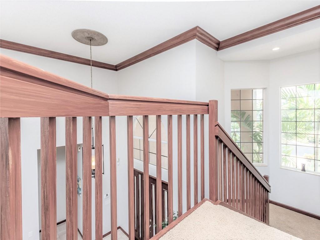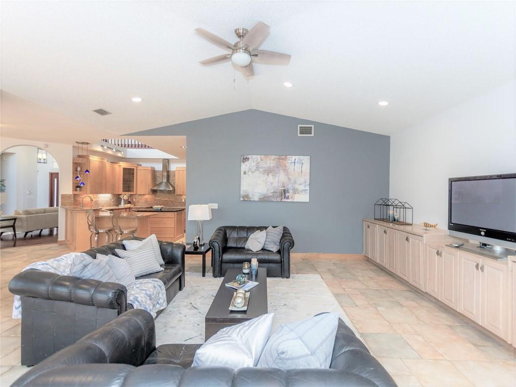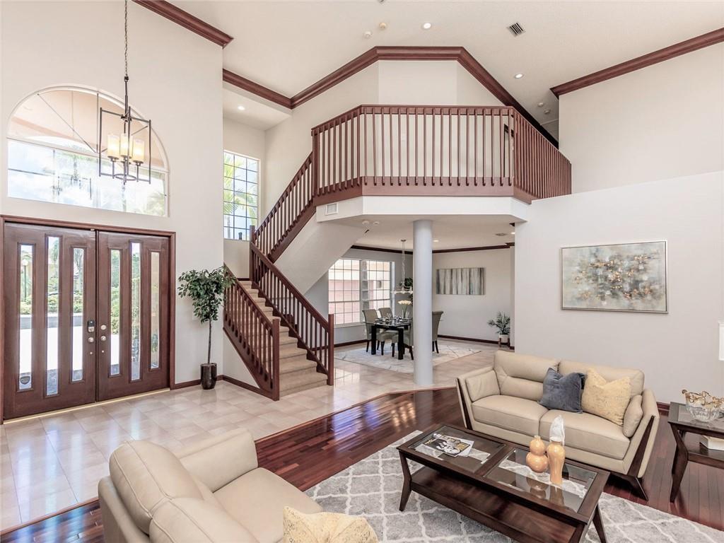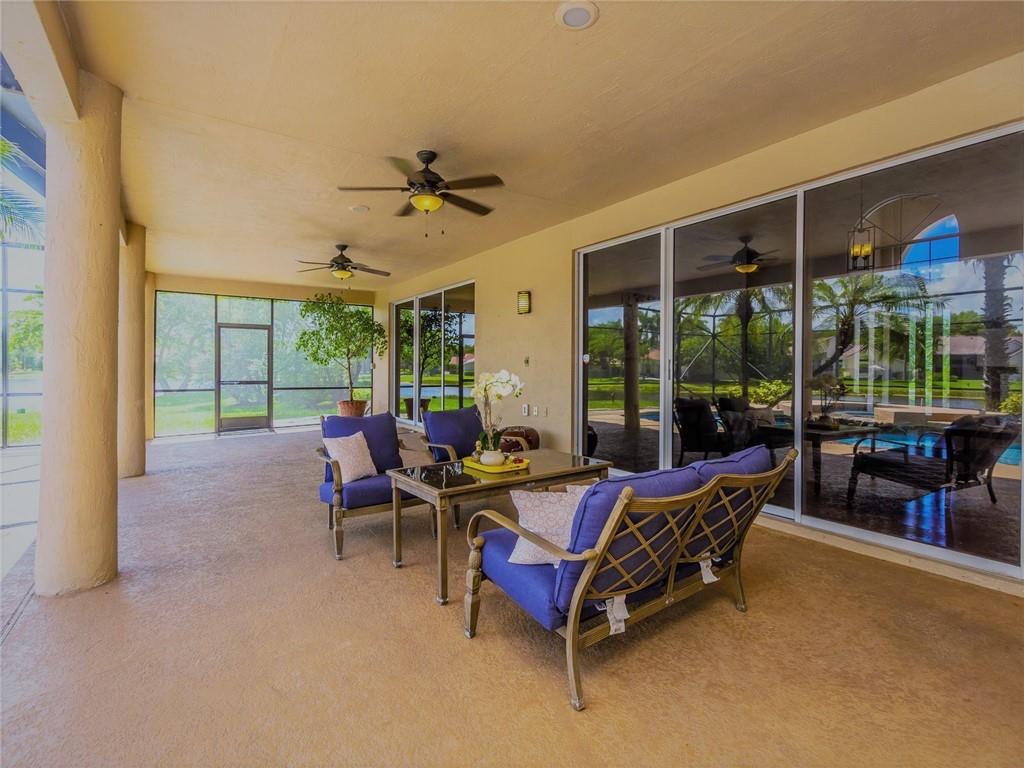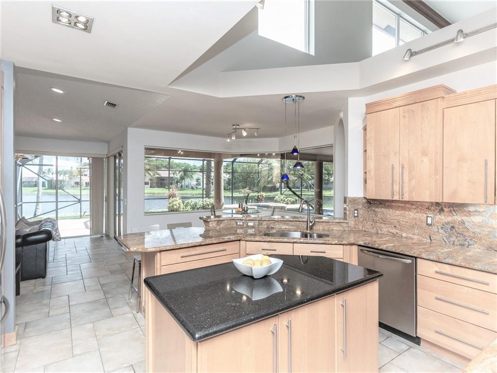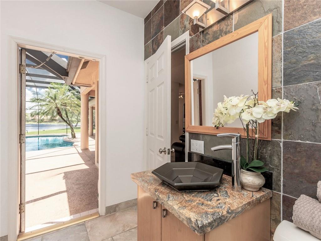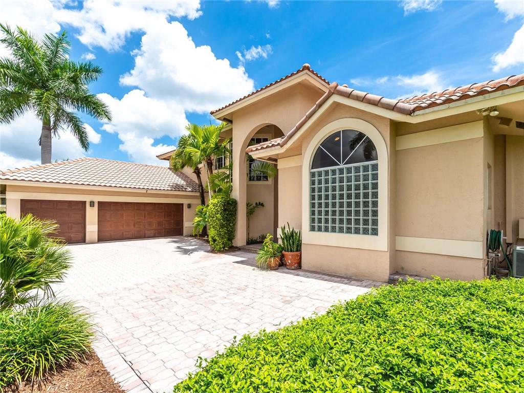 AMAZING HUGE pie-shape culdesac LAKEFRONT lot, OVER half acre, wrap-around WATER views & tons of LAND in upscale boutique Palm Island! Professionally staged, beautifully maintained 5/5/3CG w/salt-chlorinated heated pool/raised spa & long covered patio, screened for year-round comfort! Downstairs spacious Master Suite, Inlaw/Guest Suite + Full Cabana Bath, all with updated bathrooms! Upstairs, 3/2 Kids wing. Stainless/Granite Kitchen w/center island, trendy lighting. Freshly painted interior, new garage epoxy floors, 5-Ton AC compressor 2018. New fans, rose-wood floors in master & living area, new irrigation piping, pool pump, landscape. 3ACs, 2 Hot Water Heaters (one hybrid), custom closets & more! Tot lot, A+ Schools! (Price reflects no shutters, upstairs has original bathrooms & carpet).