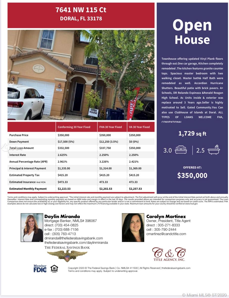 Townhouse offering updated Vinyl Plank floors through out.One car garage, Kitchen completely remodeled .The kitchen features granite counter tops. Spacious master bedroom with two walking closet. Master bath& Half Bath were remodeled as well. Accordion Hurricane Shutters. Beautiful patio with brick pavers. A+ Schools, DR Rolando Espinoza &Ronald Reagan High School. Ac Units inside & exterior was replace around 3 Years ago.Seller is highly motivated to Sell. Gated Community.You Can also use Clubhouse of Islands at Doral. ALL TYPES OF LOANS WELCOME, FHA, CONVENTIONAL , VA , ETC. TENANT OCCUPIED UNTIL August 30,2020.Wear your mask and gloves . Easy showing Min 4 hours notice it is required .