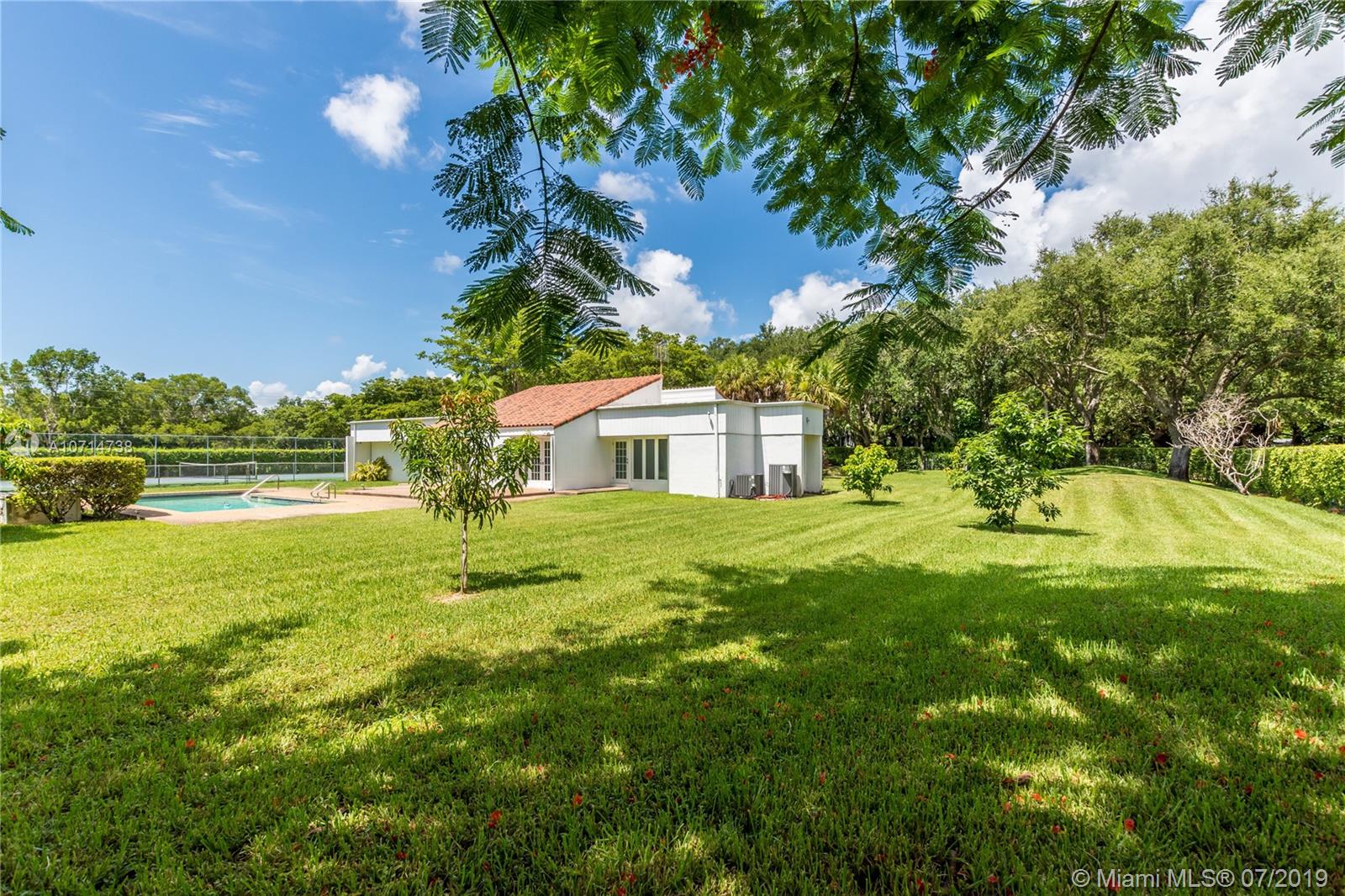 A beautifully landscaped acre in a quiet corner of southeast Pinecrest harbors this modern, designer 3BD/3BA gated home with a wide-open floor plan, volume ceilings & unfettered natural light streaming in on all sides. Chic decorative touches are everywhere, from the trendy drop lighting, to the arched built-ins, colorful kitchen backsplash, tropical leaf fans, a spectacular showcase stained-glass entrance & more. The master suite, which opens to the pool, boasts a big custom closet & large bath with a deep soaking jetted tub and glass brick shower. The expansive, completely private yard provides plenty of space for play, entertainment & relaxation. With the new owners' TLC, the swimming pool and tennis court will complement the home's active, outdoor South Florida lifestyle appeal.