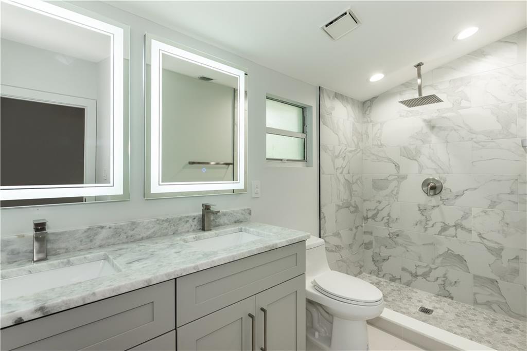 This stunningly remodeled 3 bedroom 2 bathroom home is in the sought after community of Shady Banks. This bright & open home has vaulted ceilings & high impact windows throughout. The kitchen is modern & elegant with high-end 2 tone shaker cabinets, stainless steel appliances & quartz counter-tops. This style continues throughout the house into the master-bath with the impressive wall to wall, walk-in rain shower & marble top dual sink vanity. This home has been COMPLETELY renovated down to the concrete walls with New Electrical, New A/C, New Roof & the list keeps going. You will have the comfort & peace of mind that comes with NEW Construction. This AMAZING OPPORTUNITY to live in East Ft Lauderdale walking distance to a park won't last long. Come see for yourself, you'll be glad you did.