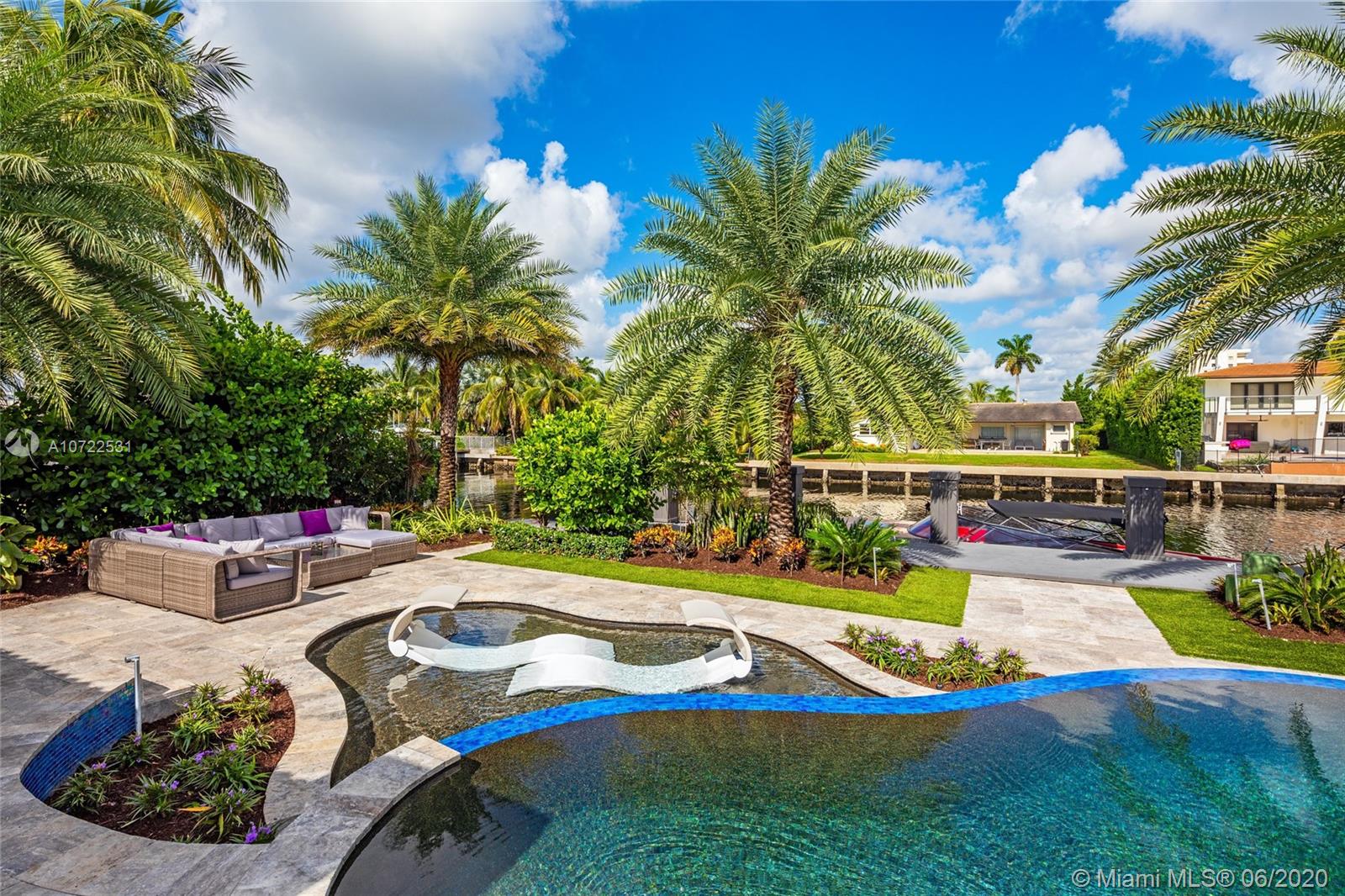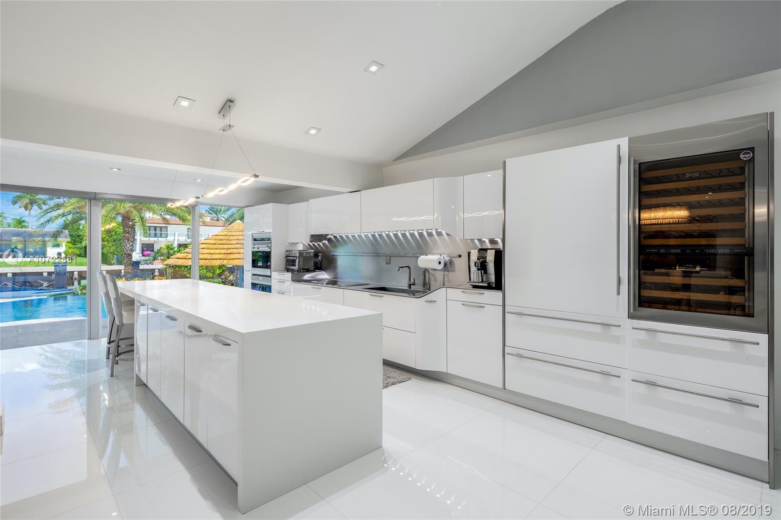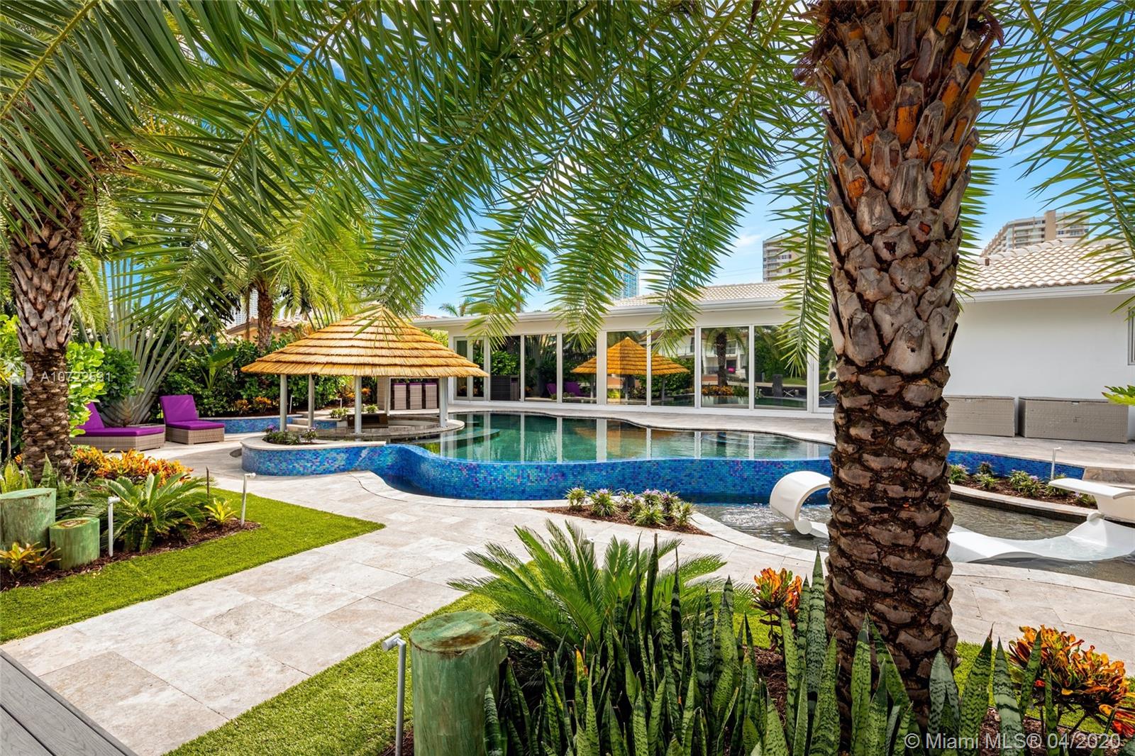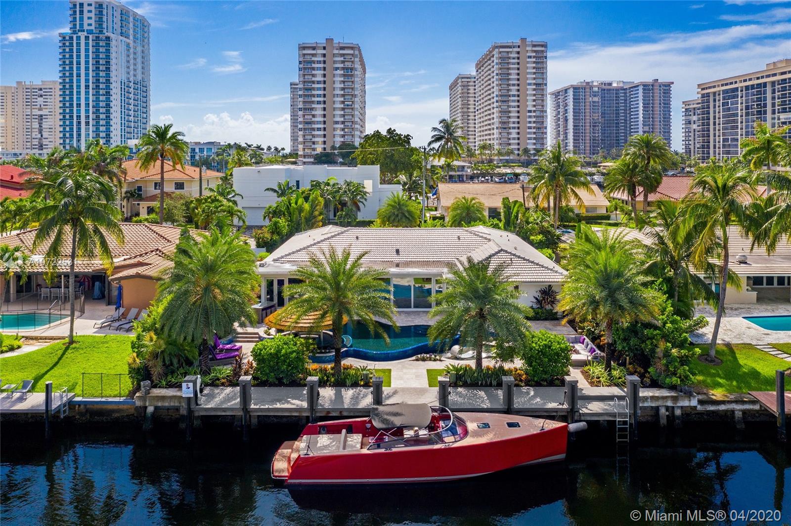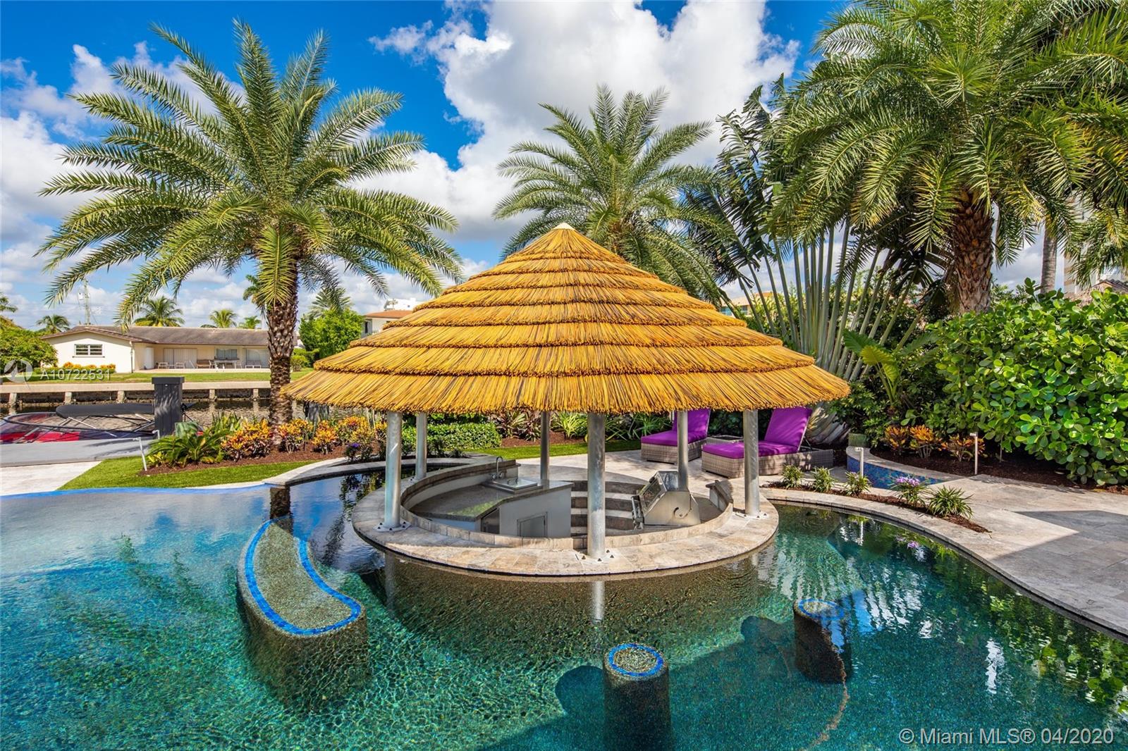 Waterfront luxury masterpiece tucked away in the prestigious Golden Isles community. Fully renovated & turn key this stunning residence features 4 oversized bedrooms and 5 bathrooms, 4,000 Sq Ft of living space. A tranquil entry covered in bougainvillea welcomes you to a sleek modern vibrant place to call home. Open concept floor plan. White 32' porcelain tile throughout, custom doors, closets, LED lighting. Snaidero-Pininfarina Kitchen includes Subzero refrigerator & wine cooler, Quartz countertops, Wolf oven & range. 14' high ceilings, impact windows. Resort style backyard perfect for entertaining, custom designed infinity edge salt water pool w/ built in swim up tiki hut including summer kitchen & bar overlooking 85' of water frontage.Easy access to intracoastal,a plus for avid boaters!