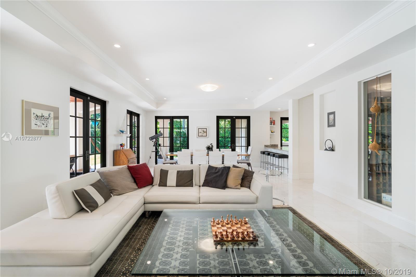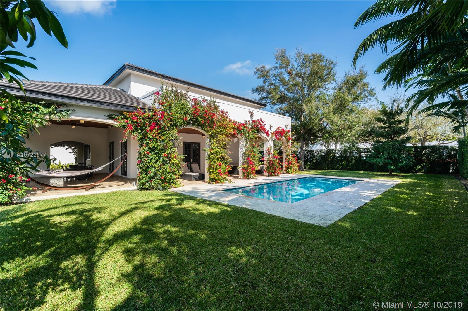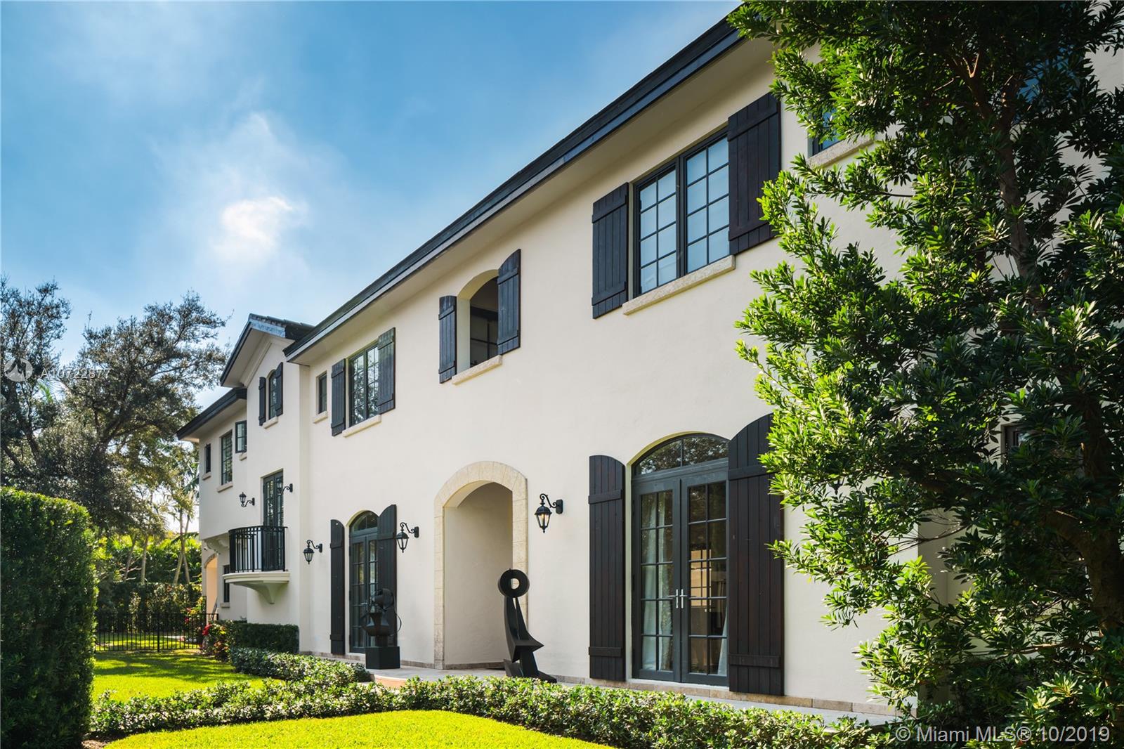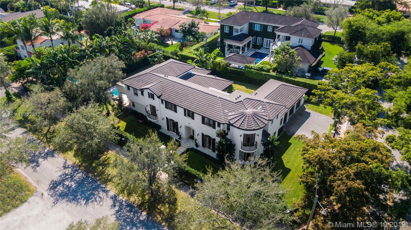 Located on an oversized corner lot in South Gables, this elegant 2 story residence was built in 2015 and features 6 bedrooms, 7 full and 1 half bath. Light filled gourmet European kitchen includes island, Thermador appliances, snack bar, butler’s pantry and walk-in wine cellar. Multiple spacious covered terraces lead to lush manicured yard with pool and summer kitchen. Master Suite features his and hers walk-in closets with custom built-in cabinetry and private deep balcony. Completely walled and gated with 3 car garage. High ceilings and balconies adorn the upstairs bedrooms. Formal Family and Dining Room are adjoined by an enchanting foyer entry. Minutes from A+ rated schools, restaurants and shops. Ideal family home with the spirit for entertaining.