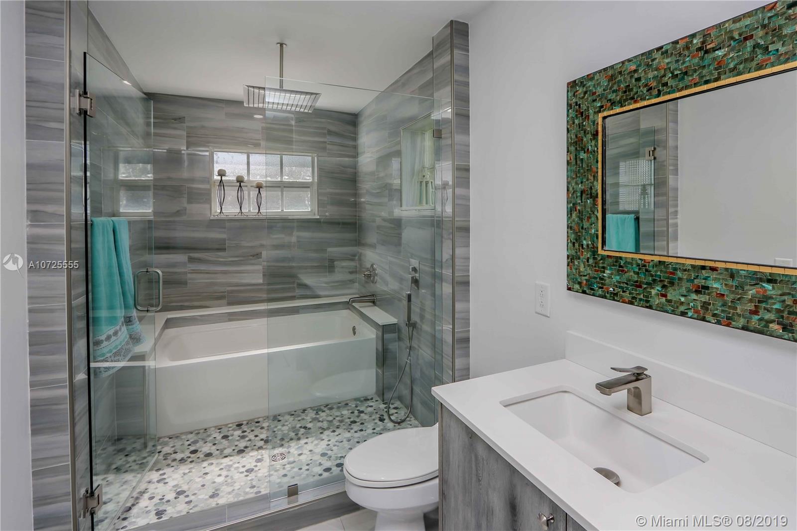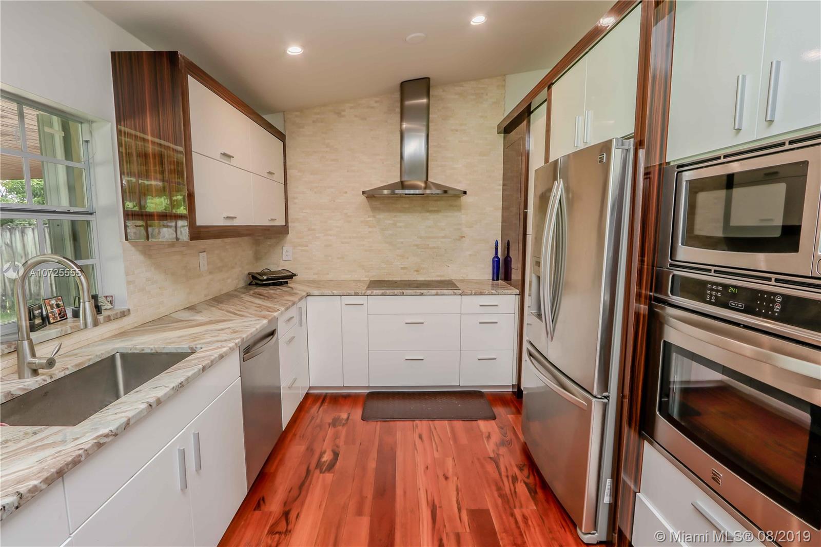 Move in ready-completely remodeled 4 beds & 2 baths home on quiet street, large lot of 10,000 SF. Master bdrm on a split plan. Recent updates include: engineered wood floors, soak tub inside shower enclosure with glass doors, newer AC, open kitchen with white laminate cabinetry and quart counter, ebony paneled cabinetry, wall ovens. Eat in counter and french doors to covered terrace. All surfaces in modern color palette of grays and whites. Lots of natural light from many windows, built out master walk in closet, appliances barely 5 years old, roof with long life to go. Quick access to Red Road & highways, midway between Miami Lakes and Miramar. Privacy fenced back yard-wrap around accordion shutters. Tumbled marble back terrace with wood beam lined ceiling, concrete slab for pergola.