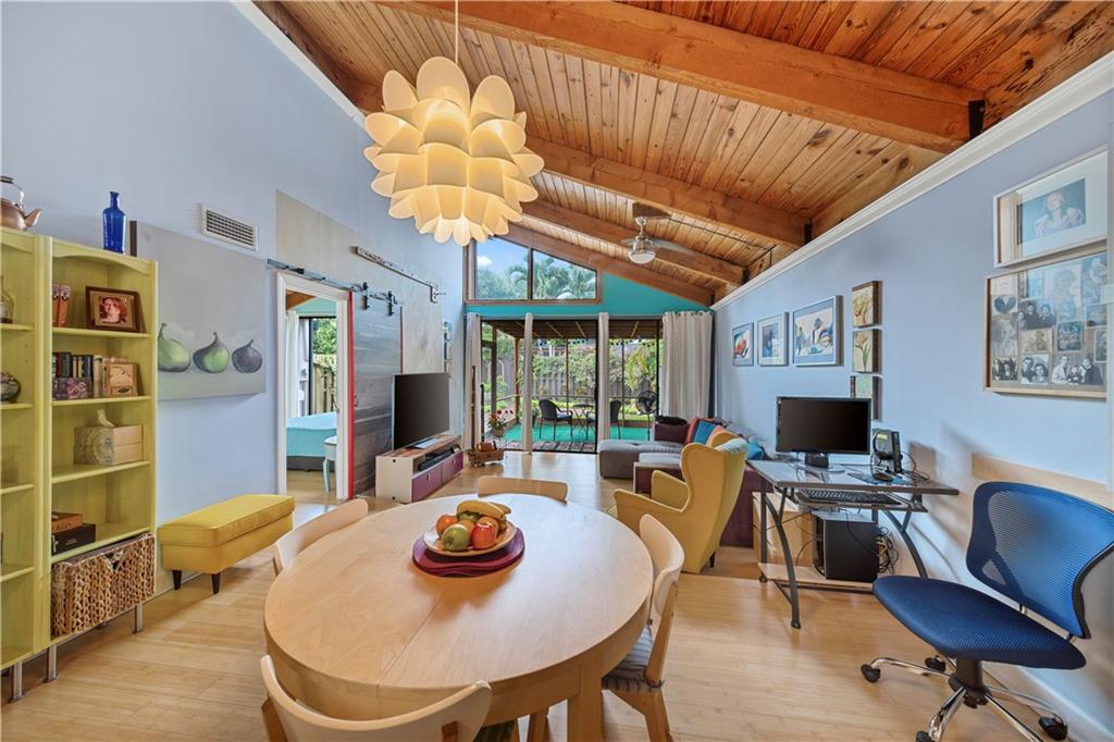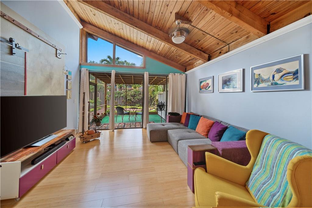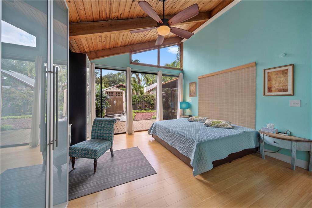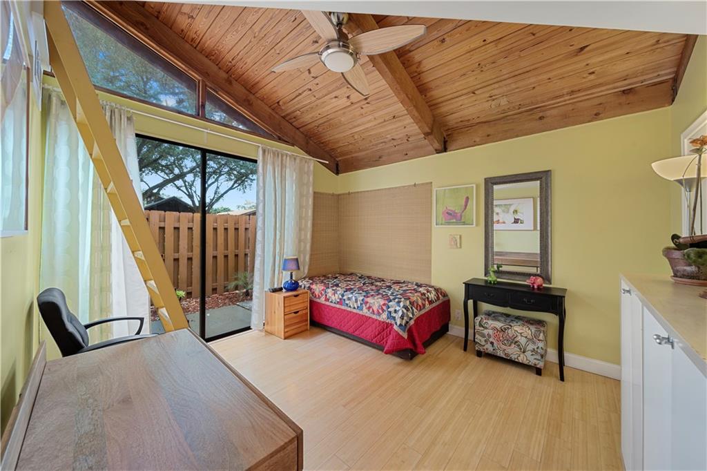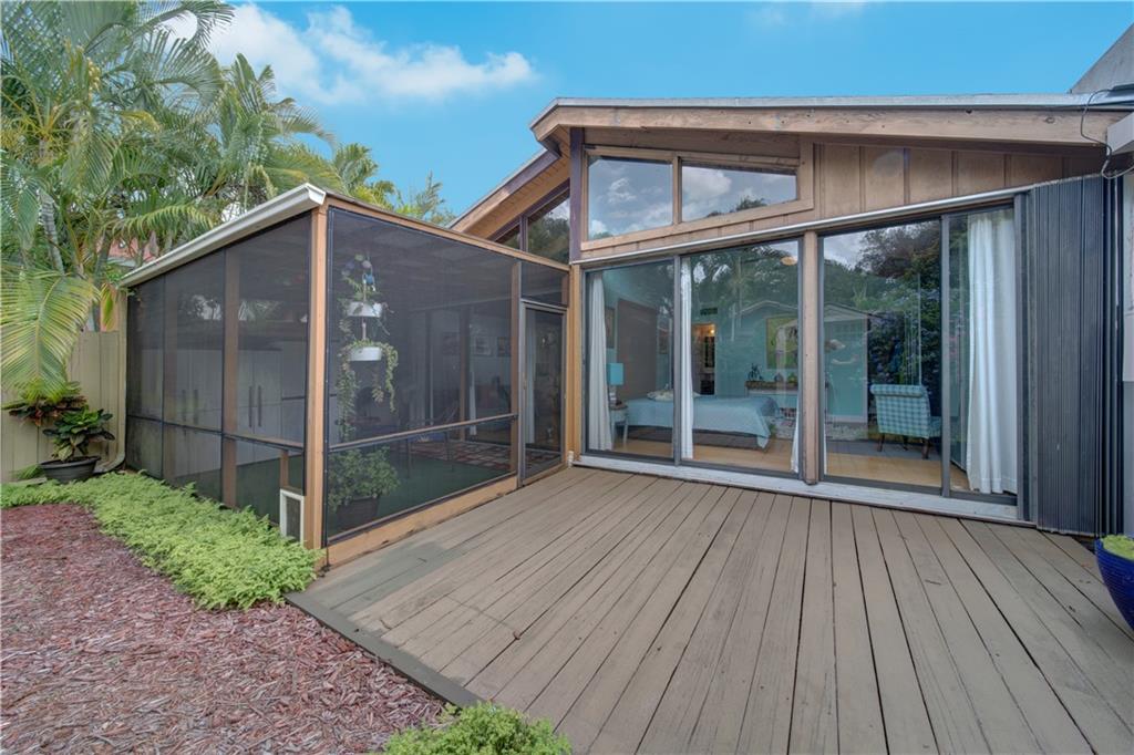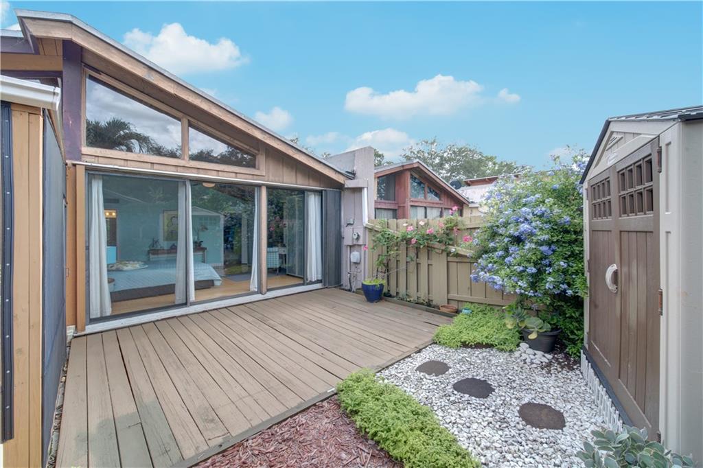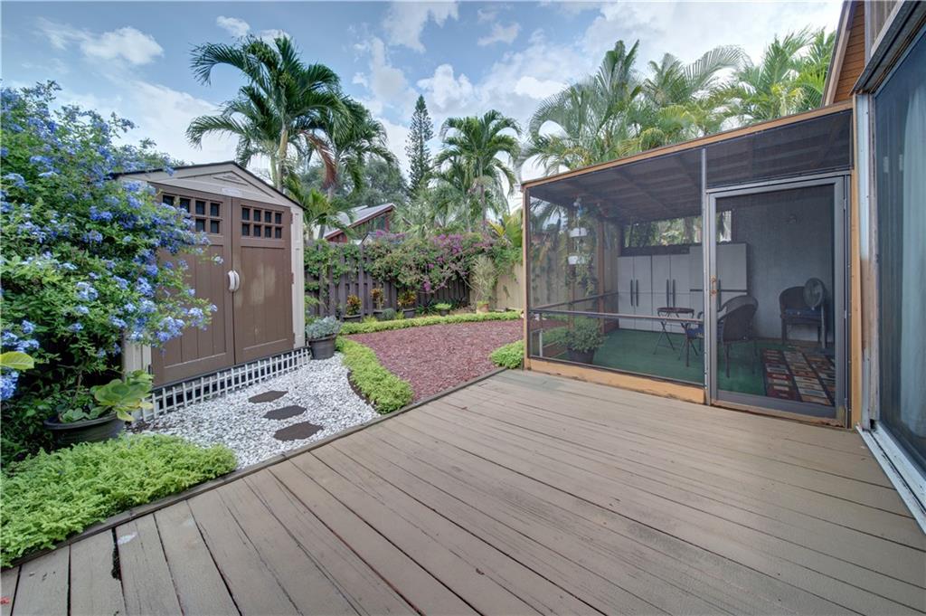 Wow! A mountain Chalet style single family home / townhouse in South Florida! HOA fee only $300/year. This beautiful property features vaulted ceilings with exposed beams, open kitchen with a bar & stainless steel appliances, bamboo flooring throughout, walk-in closets in both bedrooms, extra loft in the second bedroom and a large screened in patio. Fenced in backyard with a shed in the back and a small fenced in patio in the front. Great location, close to major highways I-95 & Turnpike, shoppes and restaurants but yet very secluded & quite area with lots of trees. Call now to schedule your private tour of the property! Will not last!