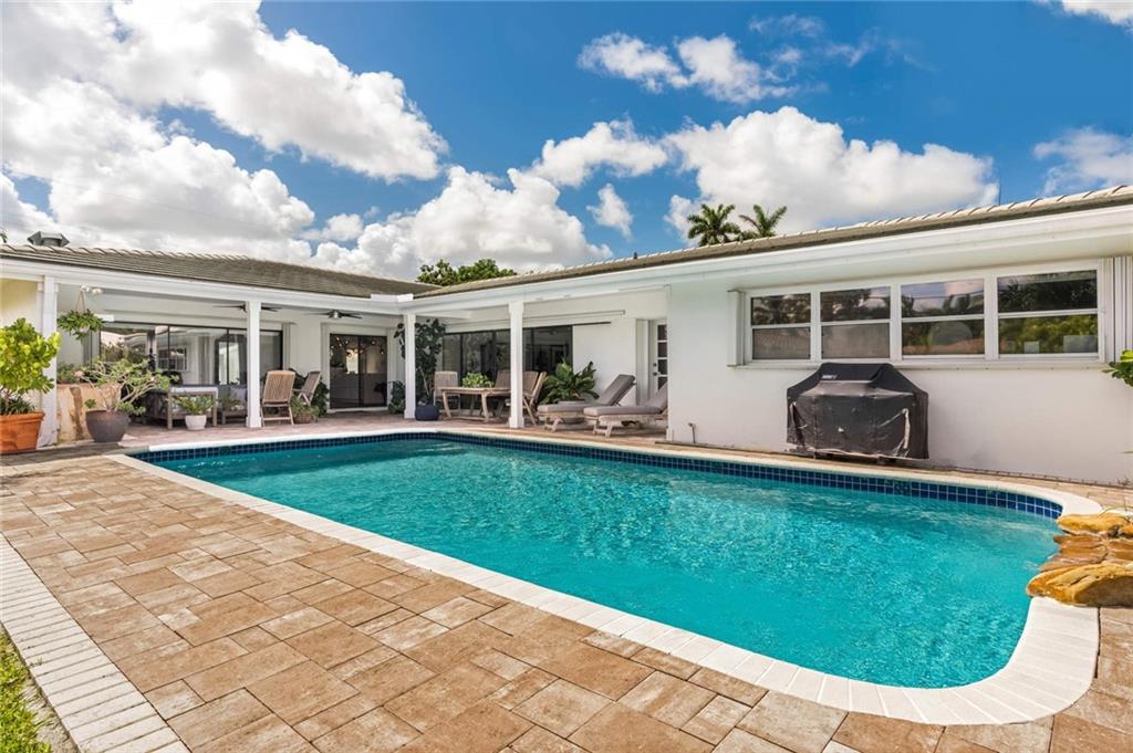 Beautifully renovated home, located east of Bayview Dr. on an oversized Coral Ridge corner lot. A house both stylish & comfortable, with modern finishes & artful details curated for family, entertaining, & relaxation. New open chef’s kitchen with gas range, Kitchenaid appliances, & oversized island. Triple split floor plan with 4 large bedrooms & 3 renovated, modern bathrooms. Expansive windows & sliding doors bring natural light into the large great room & master suite. Wrap-around covered loggia overlooks pool & spa. All spaces are designed with wide-plank, hardwood-like tile flooring, white marble accents, & thoughtful details. Conveniently located in the Bayview School District, close to all major Fort Lauderdale shops, dining, markets, with only moments to the beach.