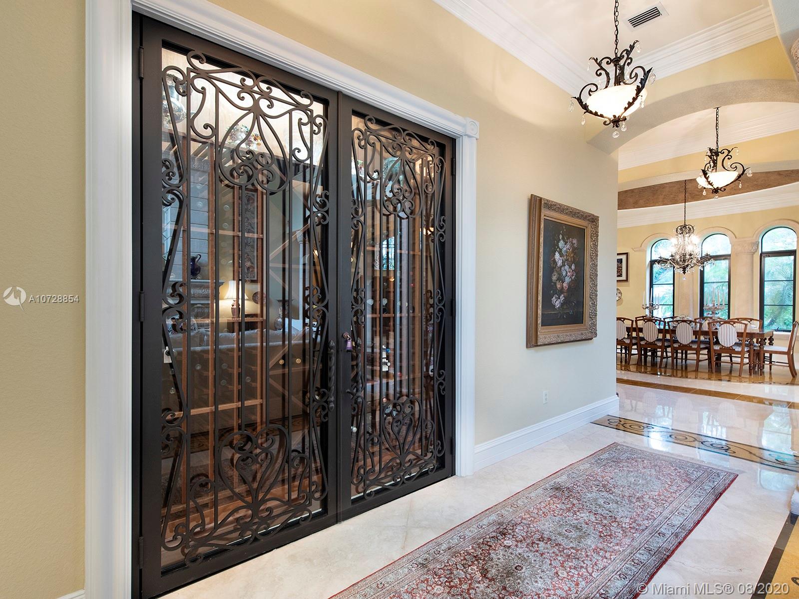 Extraordinary, pristine two story Italian villa in North Pinecrest, with legendary Hollub Homes design and construction. Unmatched living and entertaining spaces. Formal living and dining room, executive library with gorgeous built-ins and double-sided fireplace, billiard/game room, bar and wine cellar, stunning European kitchen with brick ceiling. The expansive master suite of over 1700 square feet is palatial, with separate marble baths and walk-in closets and an exercise room with exterior access to the resort-like pool and grounds. Ultimate flexibility with 5 additional en suite bedrooms. Other distinct features include a second floor loft with kitchen and additional laundry, custom exquisite finishes and design details throughout. Impact glass. A MUST SEE!