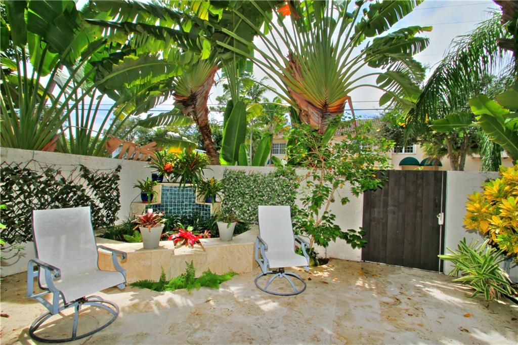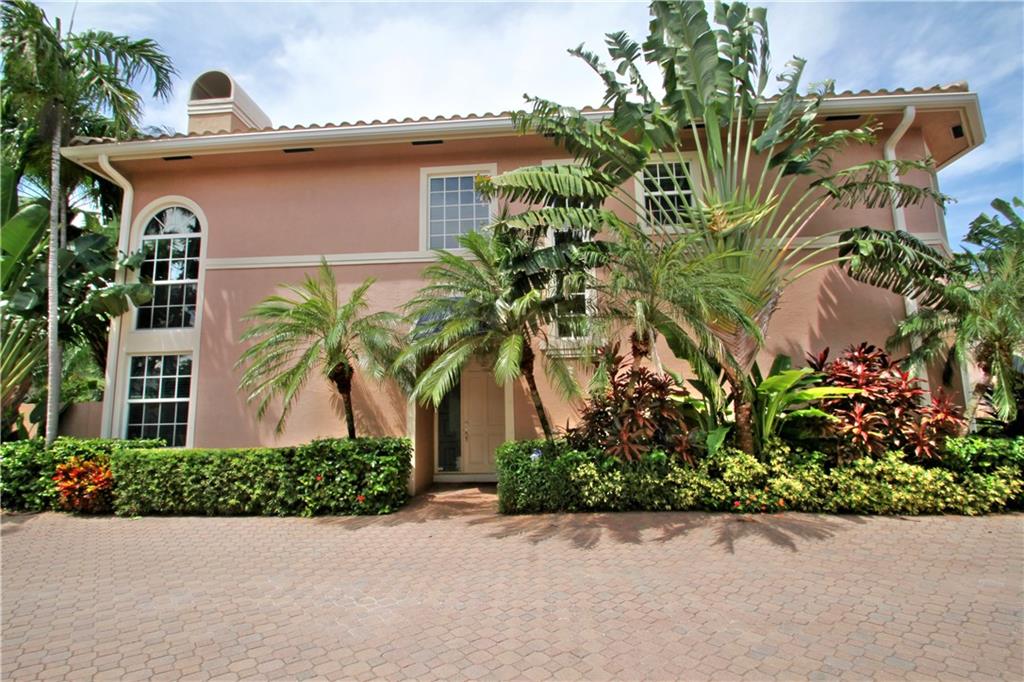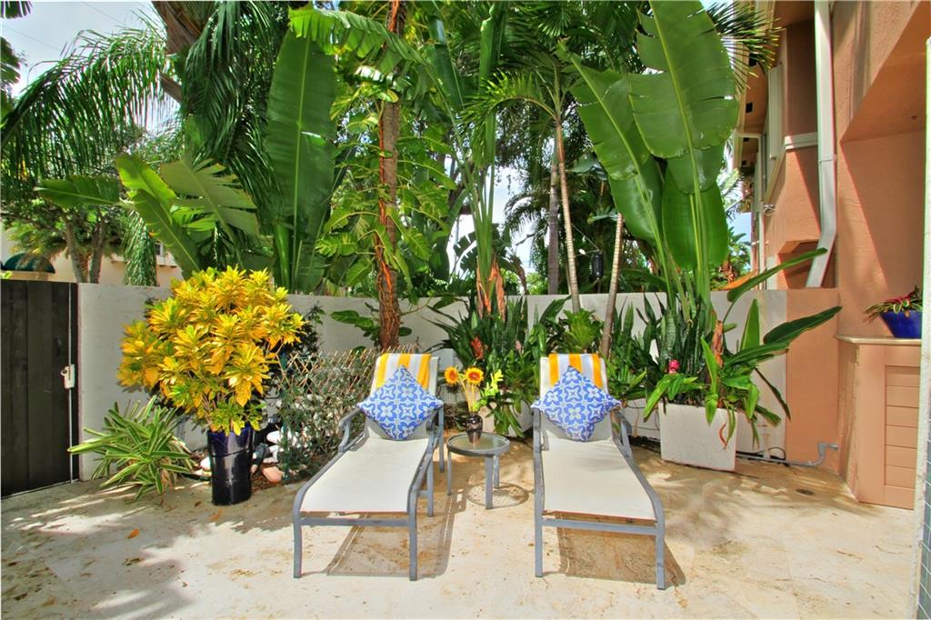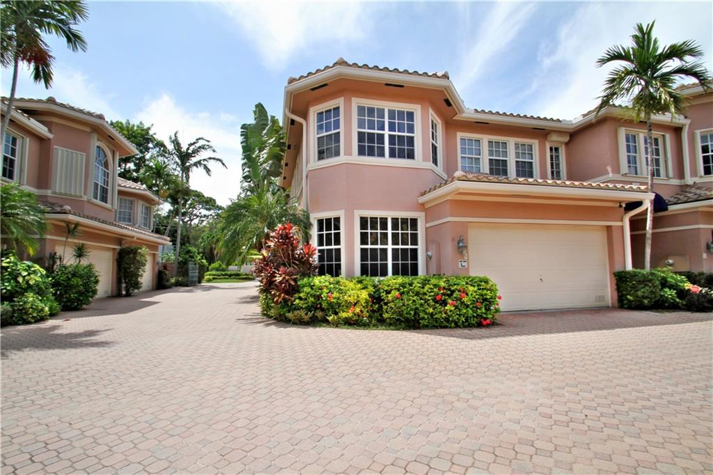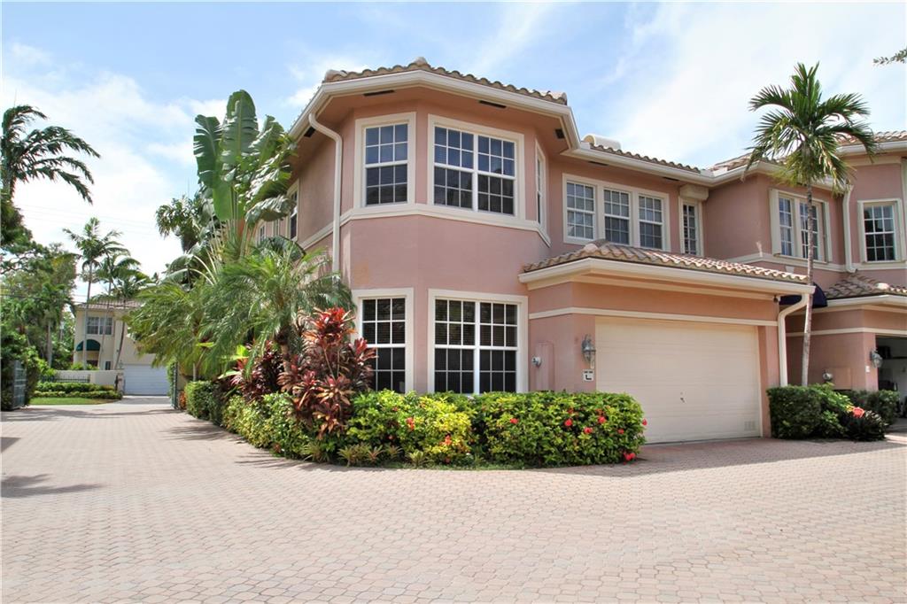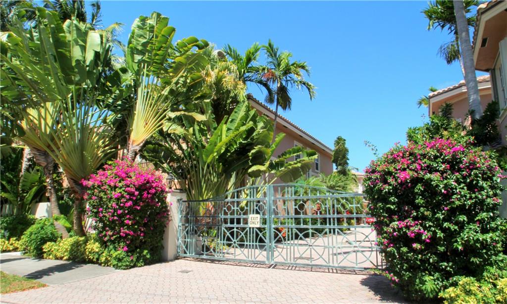 Beautiful corner unit town home in gated community has two story entry with tons of natural light. Many updates including new white porcelain floors downstairs, and bathrooms have all been stylishly updated. Gas fireplace, wet bar, spacious and open kitchen with bar seating and wine cooler, wireless surround sound throughout. Unit has it's own tropically landscaped patio complete with hot tub/spa and plenty of space for outdoor furniture. Hardwood flooring in 3 bedrooms upstairs. Downstairs den could be a 4th bed/office/family room. Two car garage, hurricane impact windows & BRAND NEW roof! Only a couple minutes to all the restaurants, entertainment, shops, art shows and events on Las Olas. (chandelier in dining room, mirrors in both downstairs bath & master bath do not convey)