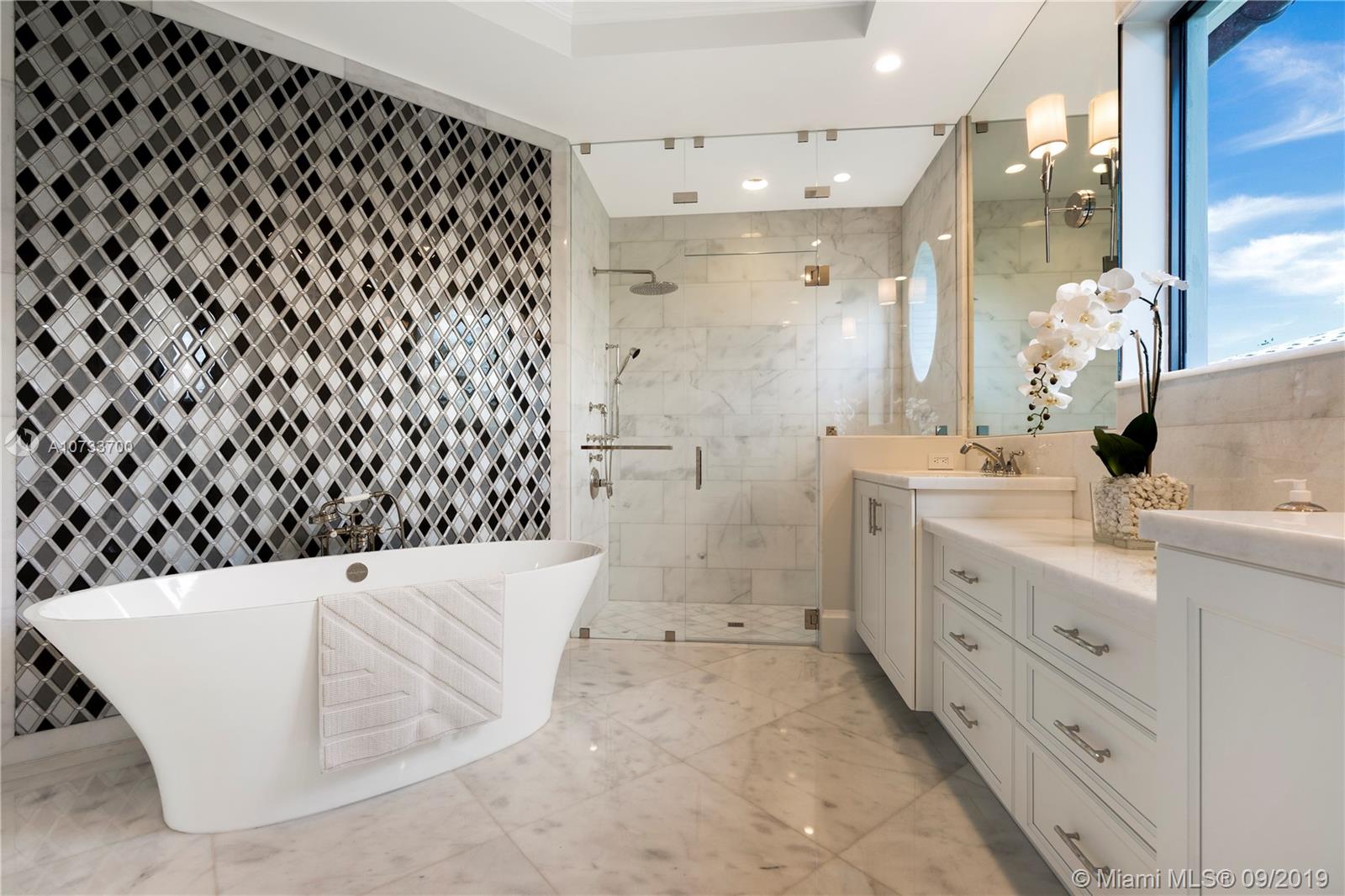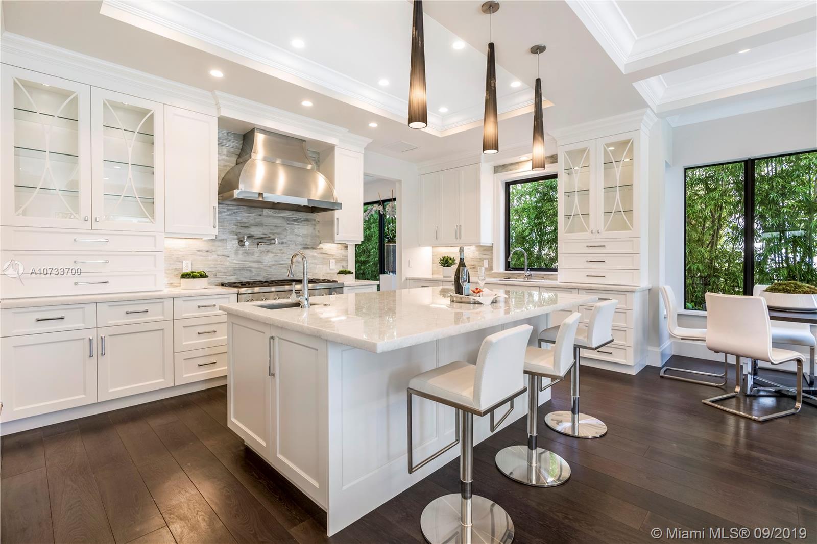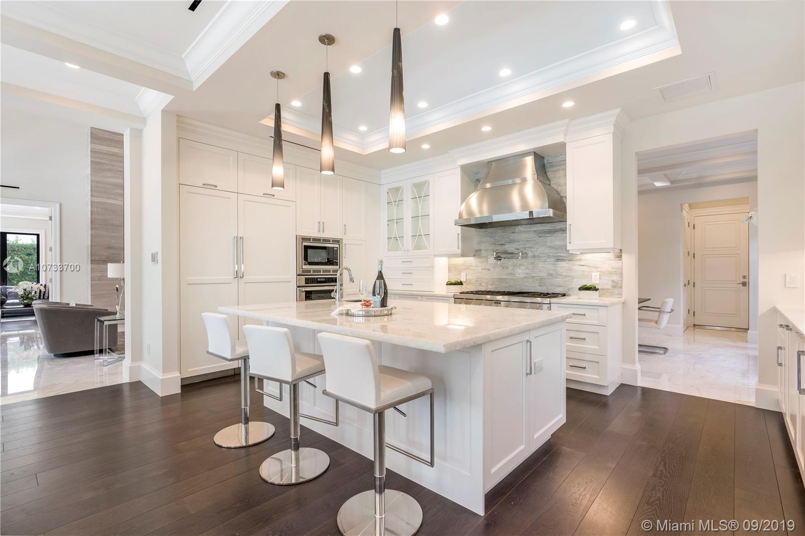 Come see the difference between this quality NEW custom built home versus a spec home. Gated waterfront estate with 75' waterfront, 3-story CBS, 5 bedroom/5 bathroom/1 half bathroom, Master bedroom suite on the 1st floor and 2nd floor, magnificent 3rd floor bonus room with Intracoastal waterway views, elevator, media room, floor to ceiling glass wine room, floor to ceiling gas fireplace, 36x36 marble throughout, 45x15 salt/heated pool with (gas) fire and water features. New concrete dock/pilings extended to 11' from seawall with new coral reef for turtles and sea-life. Cell phone controlled lighting/smart home, Hurricane impact windows and doors, 3-story foyer with spiral Italian wood staircase. Not a detail was missed on this custom home! A must see!