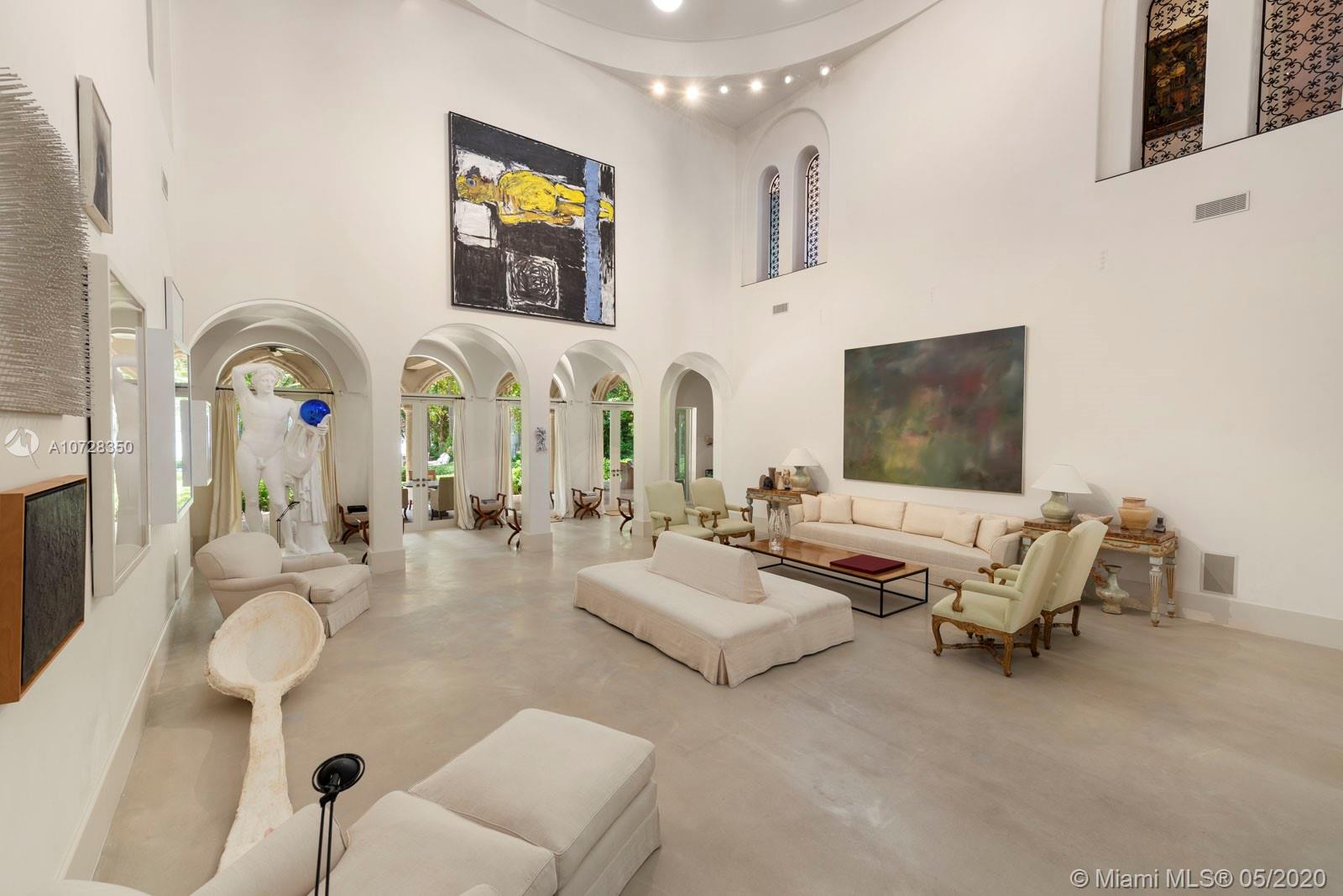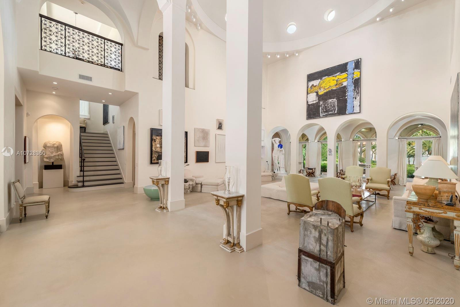 Located on exclusive Star Island, this exquisite estate offers a world of privacy & luxury. Tucked behind hand-crafted gates, an expansive motor court leads to a grand entrance. An incomparable living room w/stunning 35’ detailed domed ceilings boosts skylights & exquisite arched windows/doors. Interior features: formal dining room, library, office w/separate entrance & full bathroom, 2 grand stairways, beautiful iron work & gourmet chef’s kitchen w/ top-of-the-line appliances. The grand master bedroom features a rooftop terrace, seating area, office area, expansive built-out closet & a spa-like master bath, marble floors & countertops, a floating tub & oversized marble shower. The verdant outdoors are complete w/luxuriant gardens, summer kitchen, dock, beautiful pool & wide bay views.