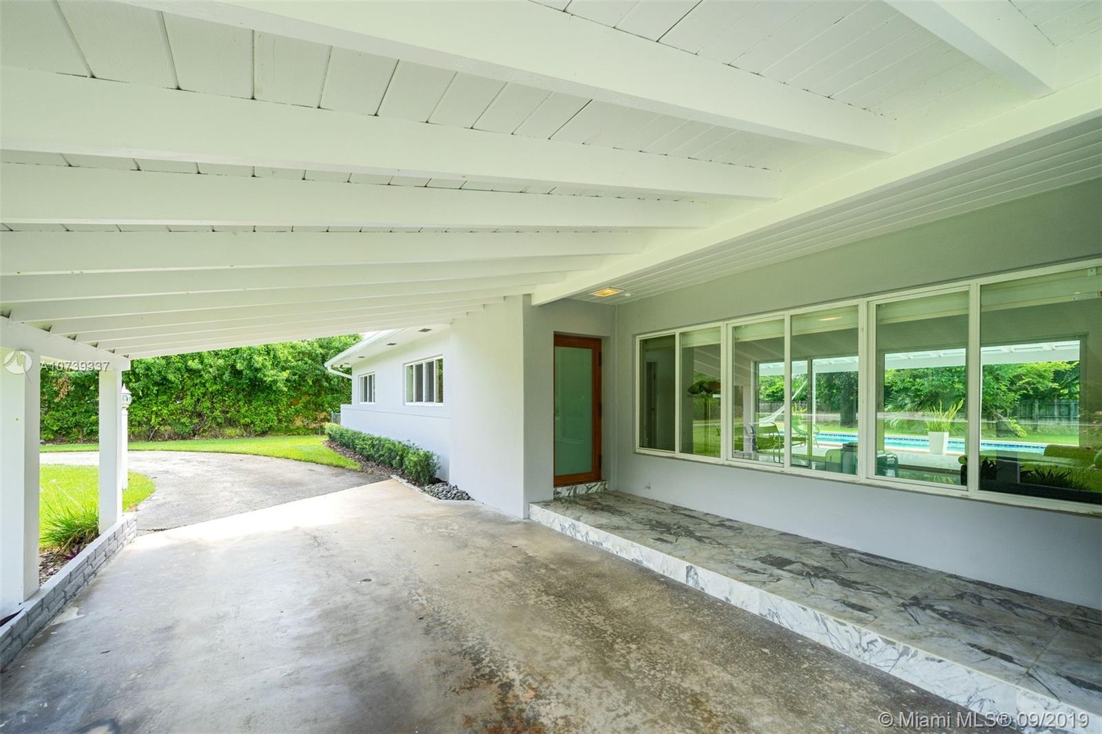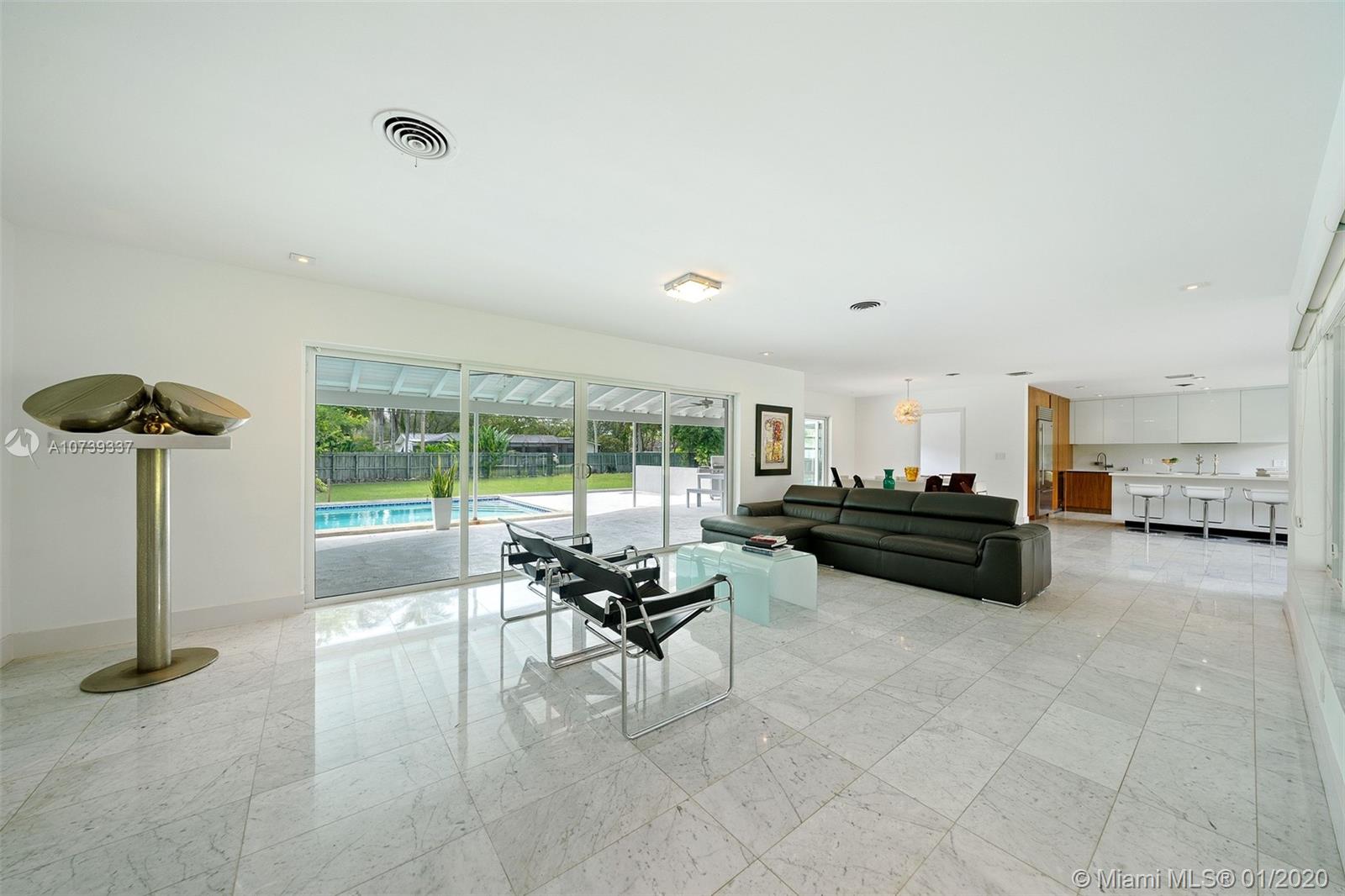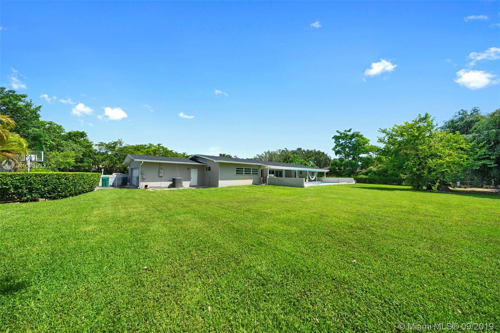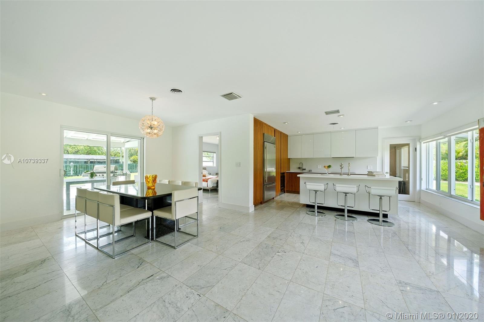 Spectacular 4 bedroom/3 bathroom one-story home situated on a builder’s acre in Pinecrest. Bright open floor plan with spacious living and dining room for grand entertaining. Modern and refined kitchen with quartz countertops and state-of-the-art appliances, including SubZero fridge, wine chiller and Wolf 4-burner glass cooktop and oven. Not to mention, an island with seating for four. Large sliding doors fill the home with natural light and provide panoramic views of the sparkling pool. Covered patio with deep overhang. Modern cabana bath. Dazzling marble floors throughout the house, laminate in the bedrooms. Indoor laundry. 2 car garage plus porte cochere.