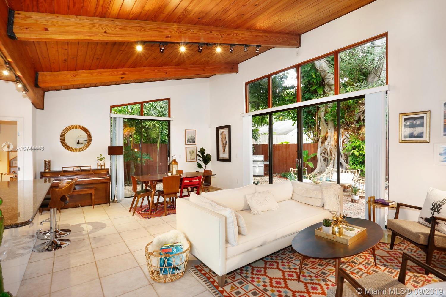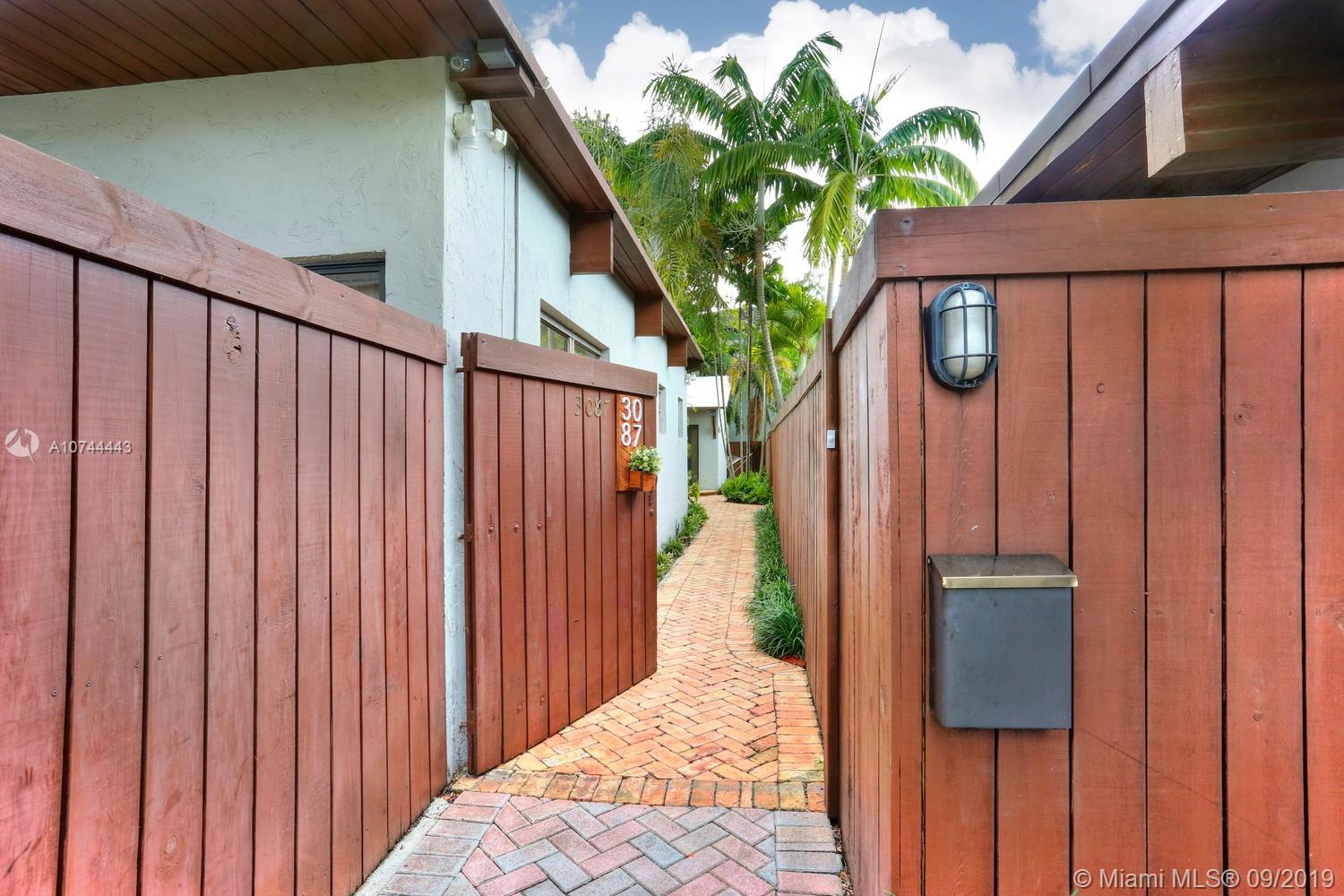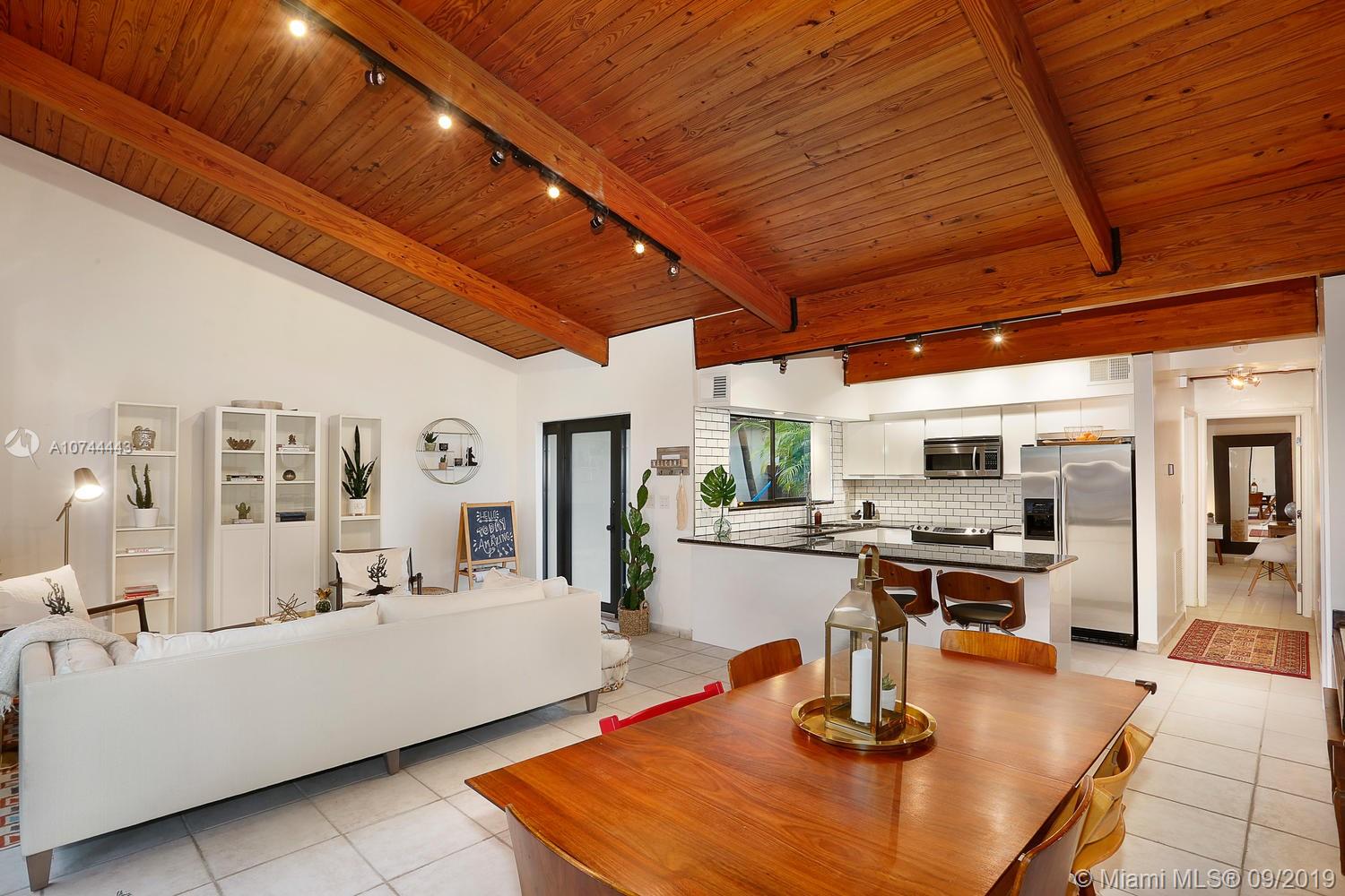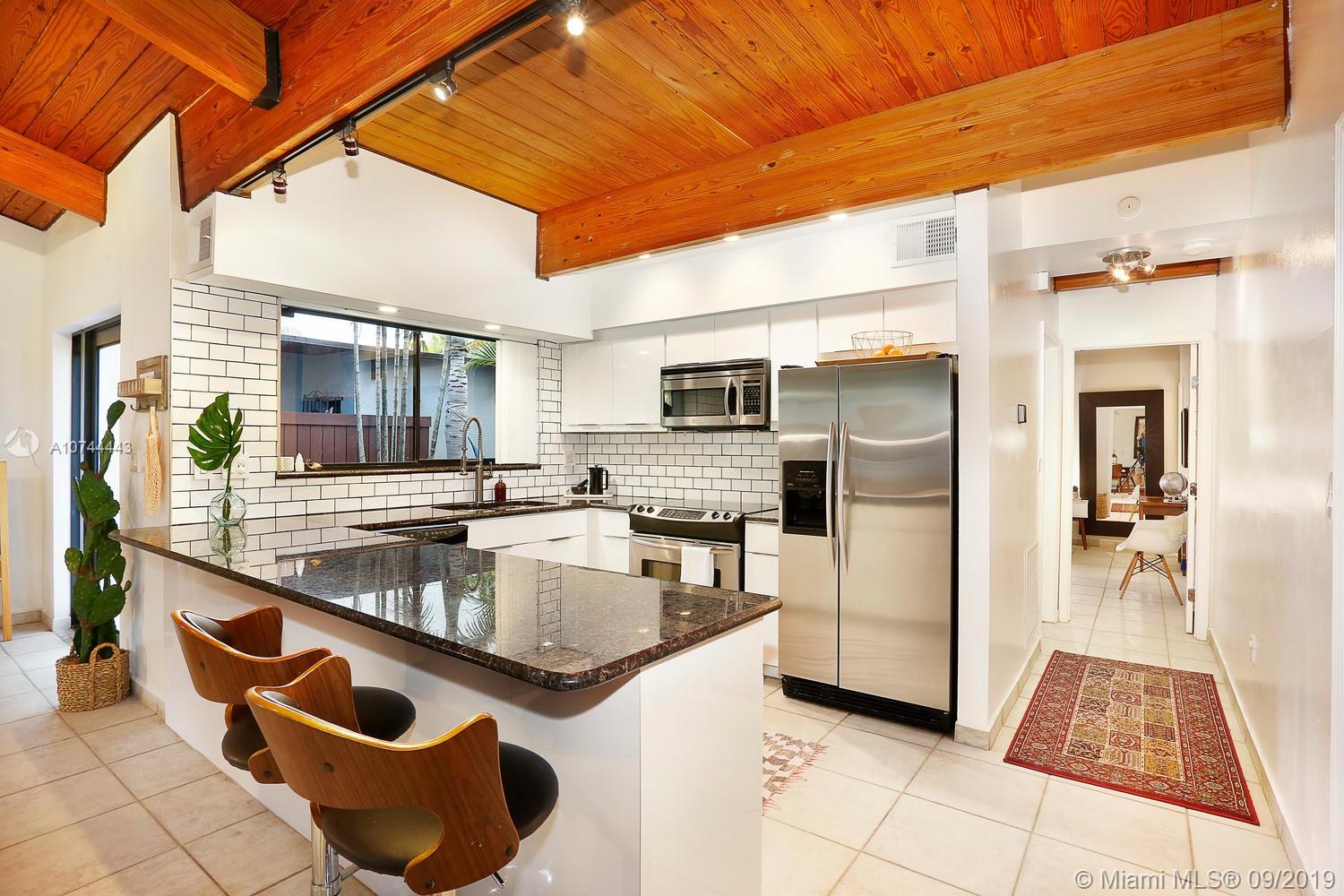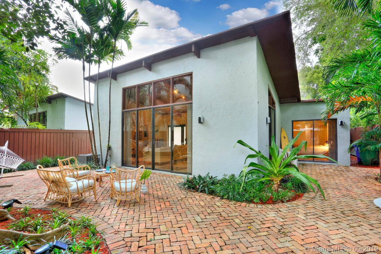 Ultra-private, unique one-level townhouse just a short walk to the Grove village center’s galleries, boutiques, cafes and bayfront parks & marinas. Gated & set back behind a tall-privacy fence, with light-filled living areas that feature vaulted wood-beamed ceilings and walls of glass that create a blending of interior & outdoor spaces. Totally renovated, including open kitchen w/ European style white cabinetry, granite countertops, stainless appliances and breakfast bar. 2 BR’s with walk-in closets & en-suite baths. All rooms open to expansive bricked terrace w/ lush tropical landscaping that surrounds the home and creates a tranquil setting for outdoor living & entertaining. Large laundry/storage room. 4 parking spaces. Minutes to downtown, MIA, Coral Gables, Key Biscayne & the Beaches.