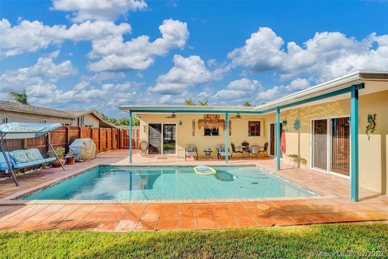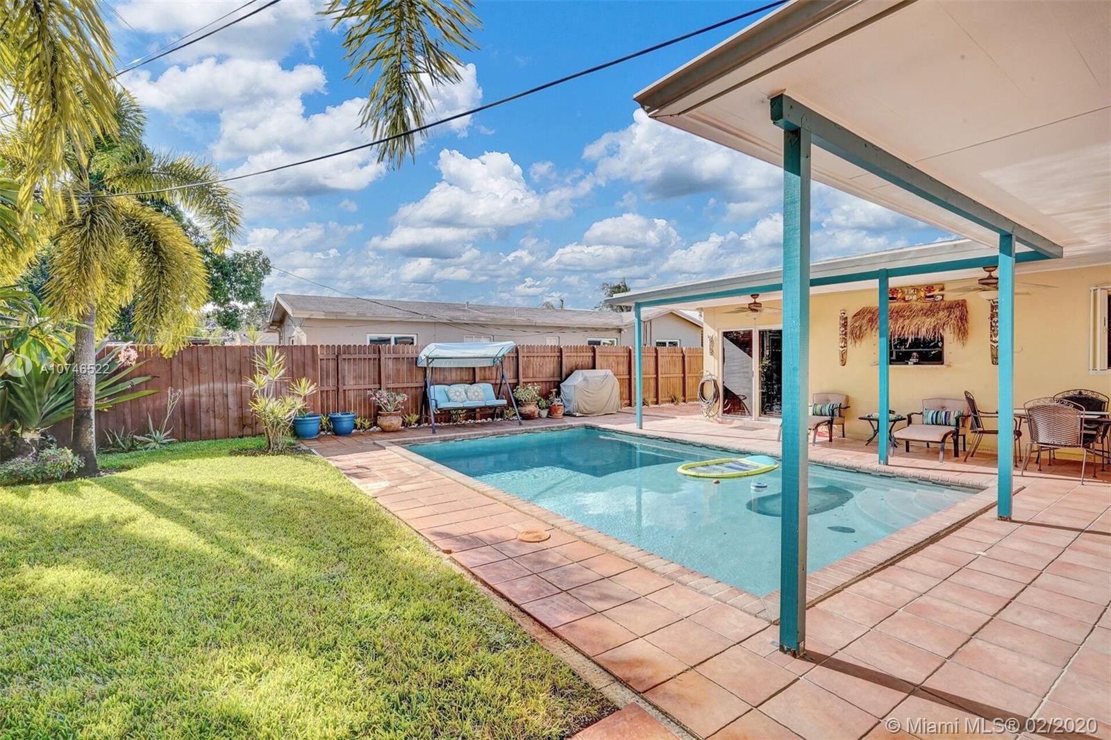 For Sale, 3 bedroom 2 bath plus additional 200 square foot bonus room. Large tiled patio , beautiful pool, gorgeous landscaping in a tropical setting with automatic sprinkler system. Custom built shed/workshop with 50 amp of power. Completely fenced in property with reinforced double gate. Perfect for a secured storage area. Newly finished driveway, new hurricane accordion shutters on all windows with hurricane impact glass sliding doors. Bathrooms newly remodeled creating a luxurious atmosphere. Custom wood cabinets in kitchen, laundry room and pantry including new appliances. Home is in turnkey ready to move in condition. Centrally located to Beaches, Hard Rock Casino and major highways. Motivated Seller.