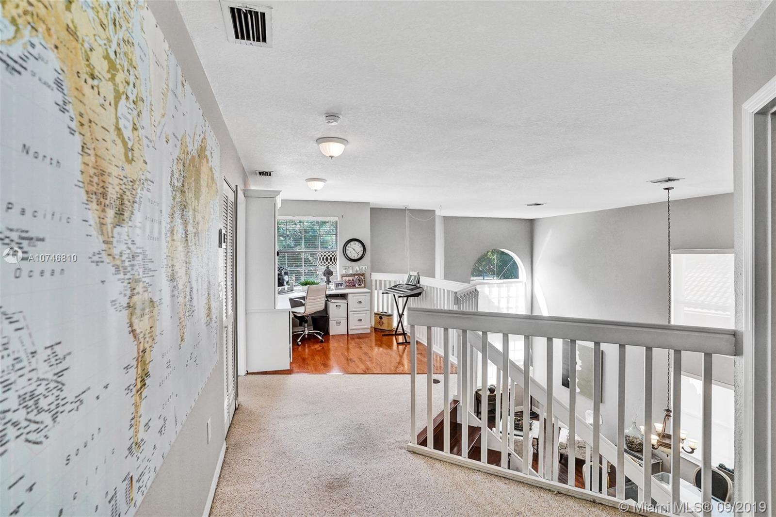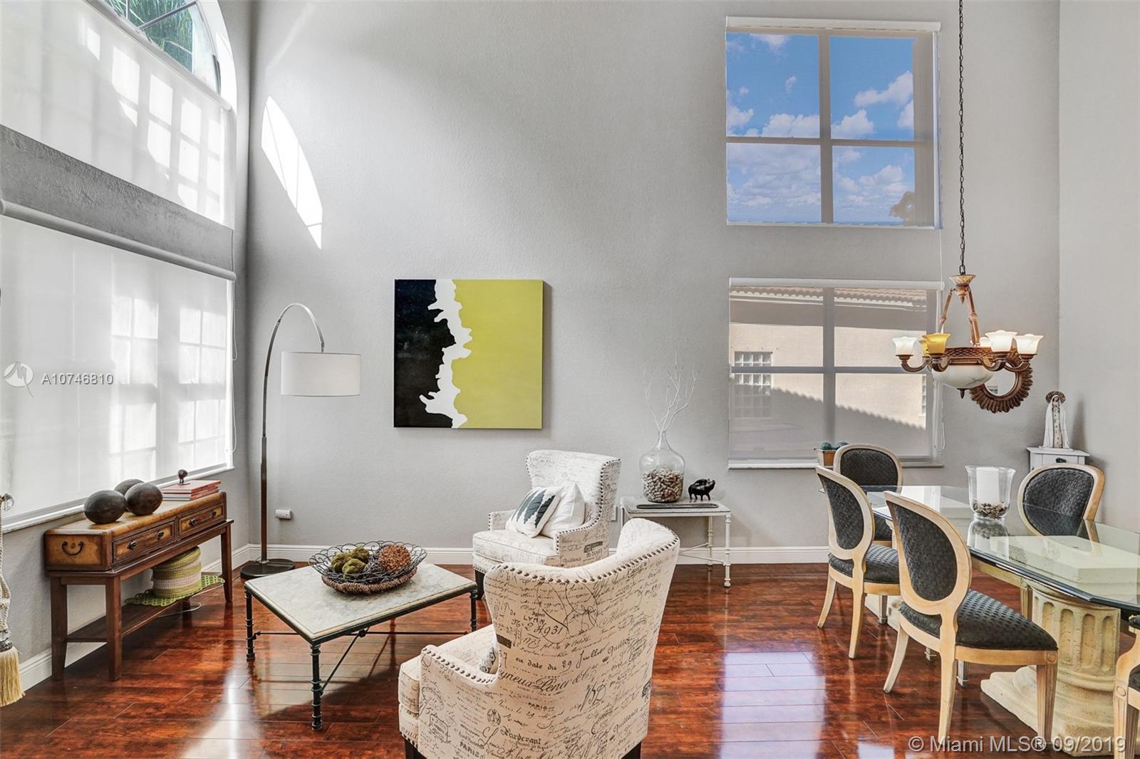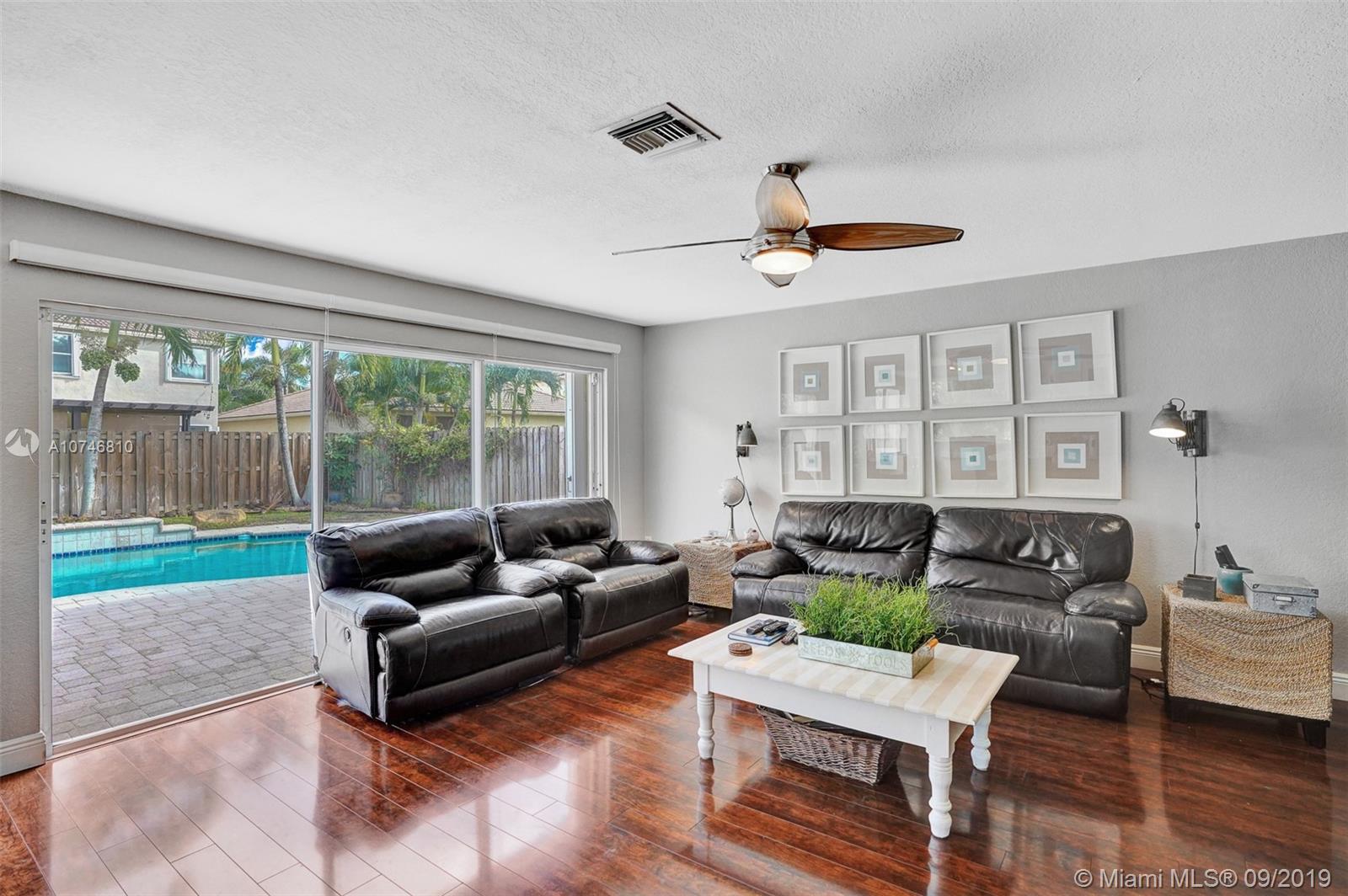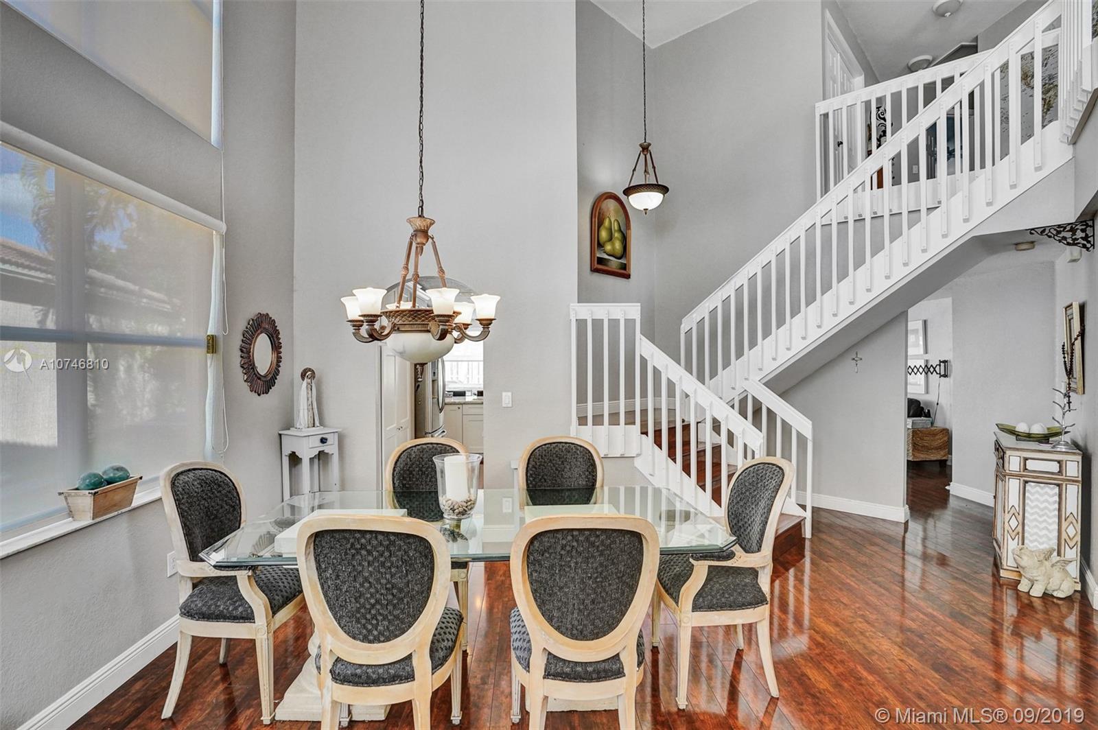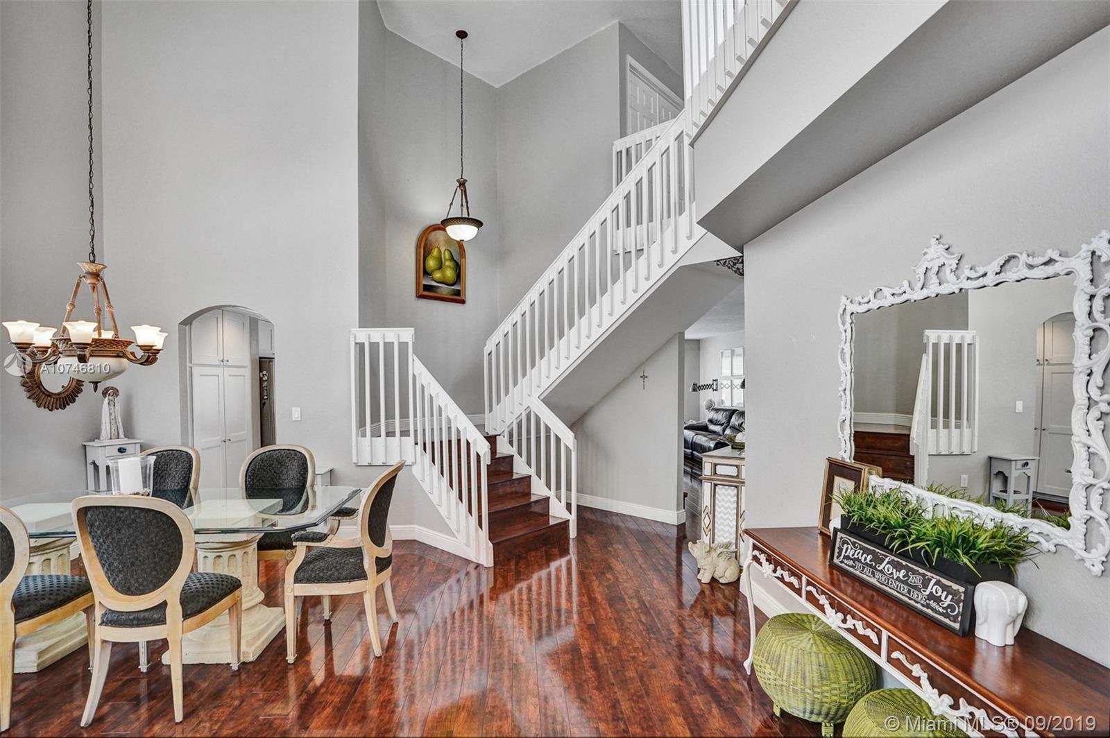 Unique & spacious floor-plan featuring high ceilings, bright interior & all laminate wood floors downstairs. Updated kitchen with high-quality cabinetry, pull-out shelves, stainless appliances & stone counters with seating for 5. Custom work space adjacent to kitchen & family room, downstairs bedroom & fully updated bath. 2nd floor boasts a large & open den/office space . Updated master bath, 3rd & 4th Bedrooms share a Jack & Jill bath. Relax in your private & fenced back yard oasis with solar heated pool and greenery, how about your own Mango tree? Storm protection throughout. Enjoy a care-free lifestyle with lawn care, sprinkler system, HD cable service, internet and ADT alarm monitoring service included. Emerald Estates is guard gated & ideally located, next to parks, shopping & schools
