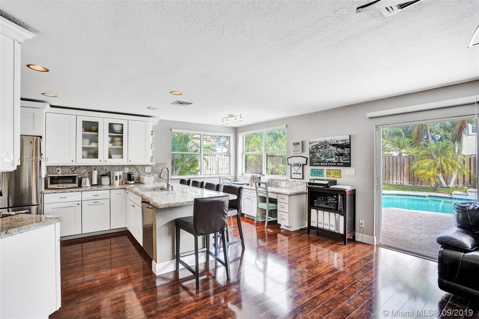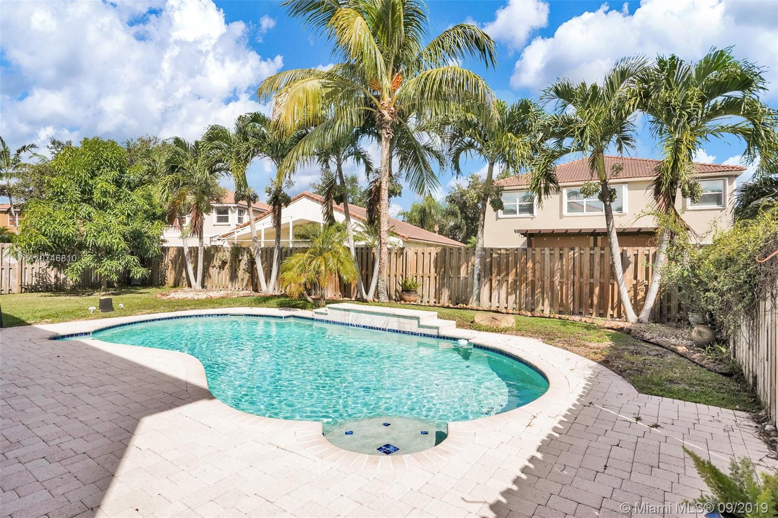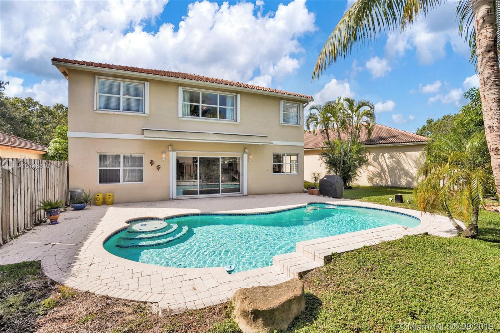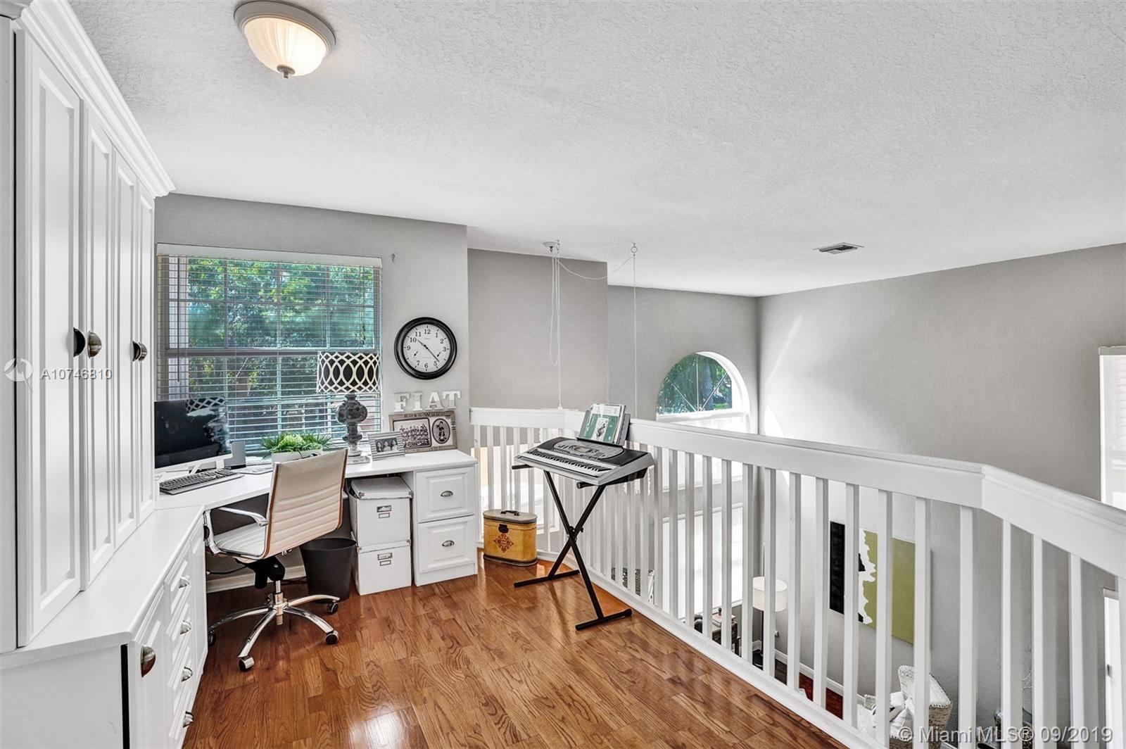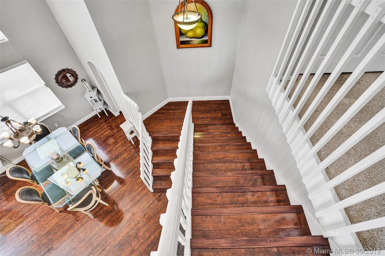 Unique & spacious floor-plan featuring high ceilings, bright interior & all laminate wood floors downstairs. Updated kitchen with high-quality cabinetry, pull-out shelves, stainless appliances & stone counters with seating for 5. Custom work space adjacent to kitchen & family room, downstairs bedroom & fully updated bath. 2nd floor boasts a large & open den/office space . Updated master bath, 3rd & 4th Bedrooms share a Jack & Jill bath. Relax in your private & fenced back yard oasis with solar heated pool and greenery, how about your own Mango tree? Storm protection throughout. Enjoy a care-free lifestyle with lawn care, sprinkler system, HD cable service, internet and ADT alarm monitoring service included. Emerald Estates is guard gated & ideally located, next to parks, shopping & schools