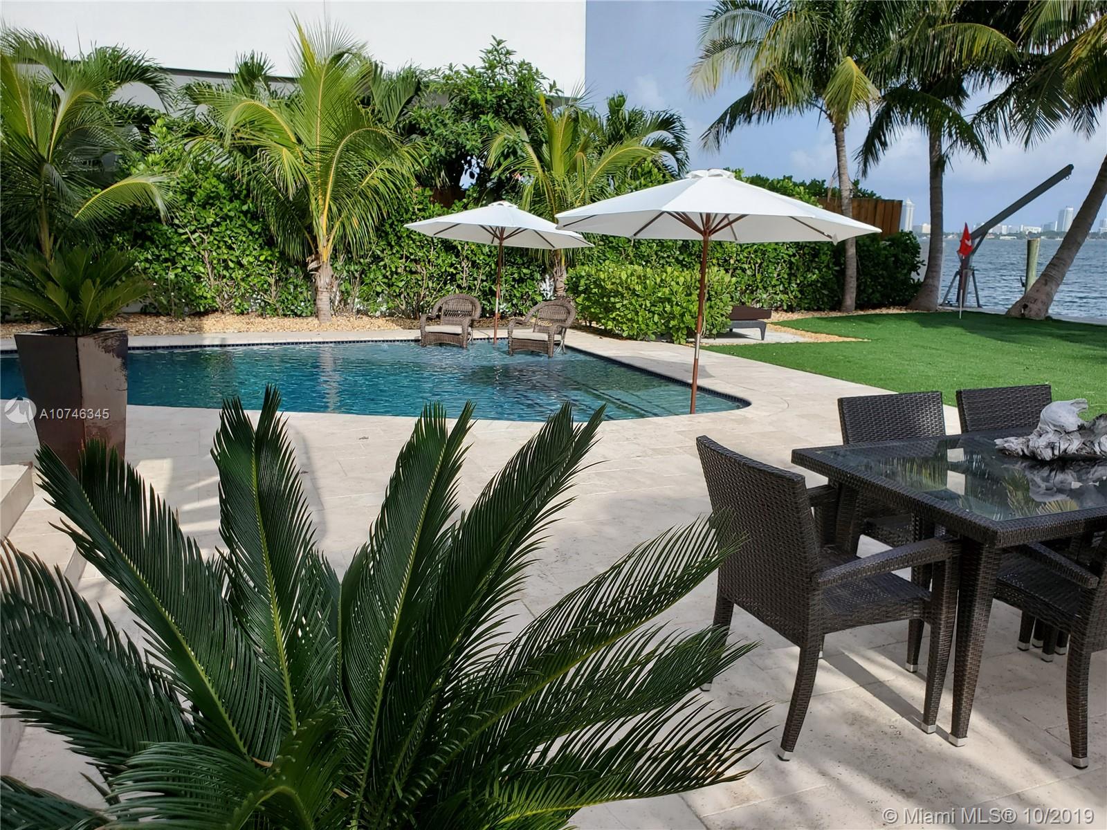BEST PRICED UPDATED WATERFRONT HOME! Tropical paradise on the open bay with unobstructed views of the Miami skyline and South Beach. This beautiful property offers 60-ft of bayfront, oversized heated pool with beach, and a huge backyard with fire pit! Situated on a 9,000 sqft lot, this stunning 4-bed plus den / 3 bath home has been renovated in 2012 and is move-in ready. The open concept floor plan and wall-to-wall glass allow for the maximum exposure of magnificent water views. Some of the features include marble and wood floors, high-end kitchen appliances, spa shower with steam, giant master suite with sitting area/den, hurricane impact windows and doors, new seawall and boat dock, and one car garage. Amazing location just minutes from South Beach, Bal Harbor, and downtown.
