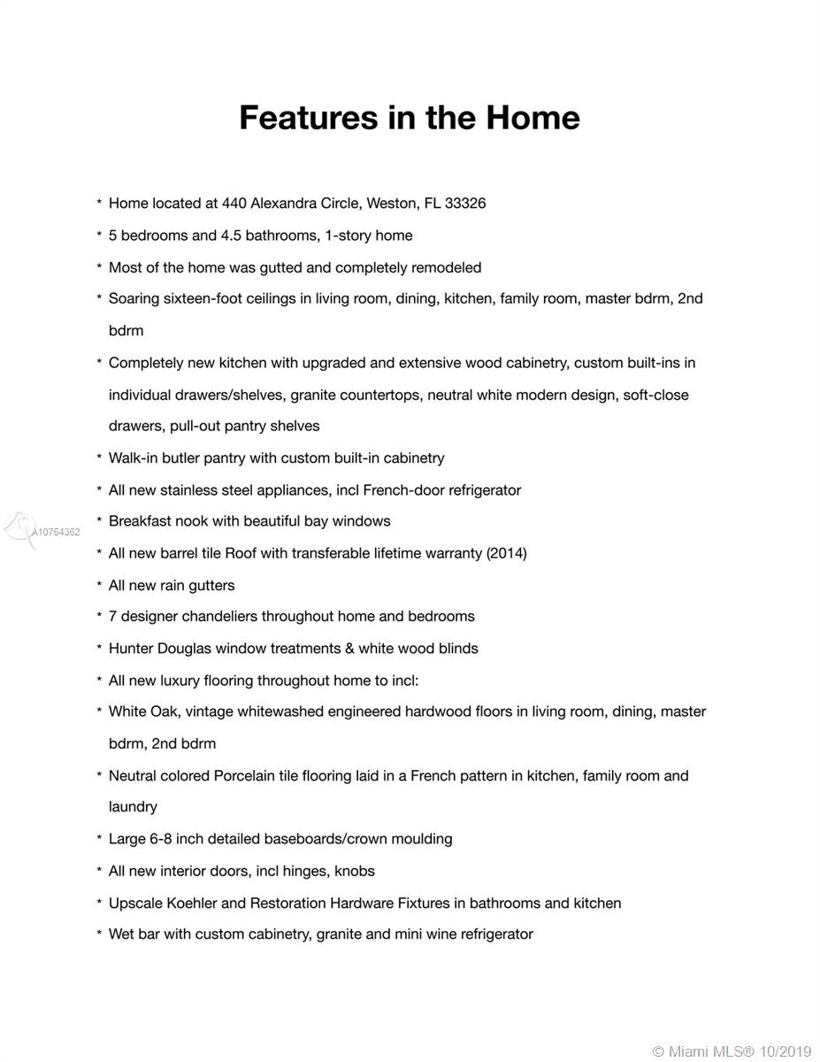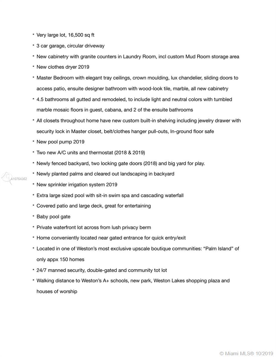 Gorgeous *FULLY-REMODELED* one-story home on large LAKEFRONT/POOL lot with big yard for play! $300k in luxury renovations. New everything! NEW ROOF 2014! New WHITE gourmet kitchen with expansive cabinetry/walk-in pantry, new designer bathrooms, new luxury flooring, new tropical landscaping, newly fenced yard, 2 new a/c’s, new irrigation system. 5bd/4.5 baths, 3CG with circular driveway. Light and bright, soaring ceilings. Oak wood floors, French-pattern porcelain floors, all new custom closets. Entertain South Florida style in your covered patio and large deck overlooking pool and panoramic lake views across from lush greenery & privacy berm. Tot lot, guard-gated, palm-tree lined upscale boutique community of Palm Island. Walk to Weston’s A+ schools, parks, shopping, houses of worship.