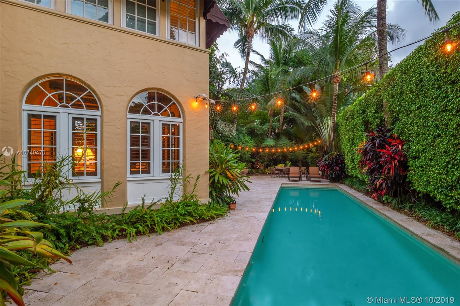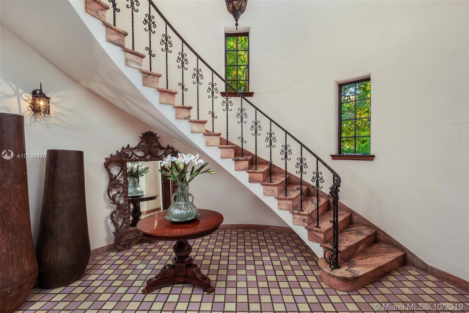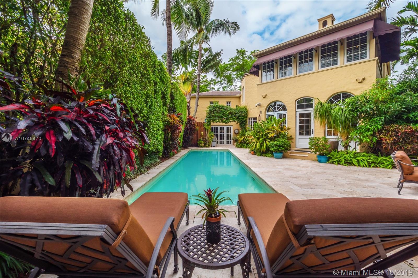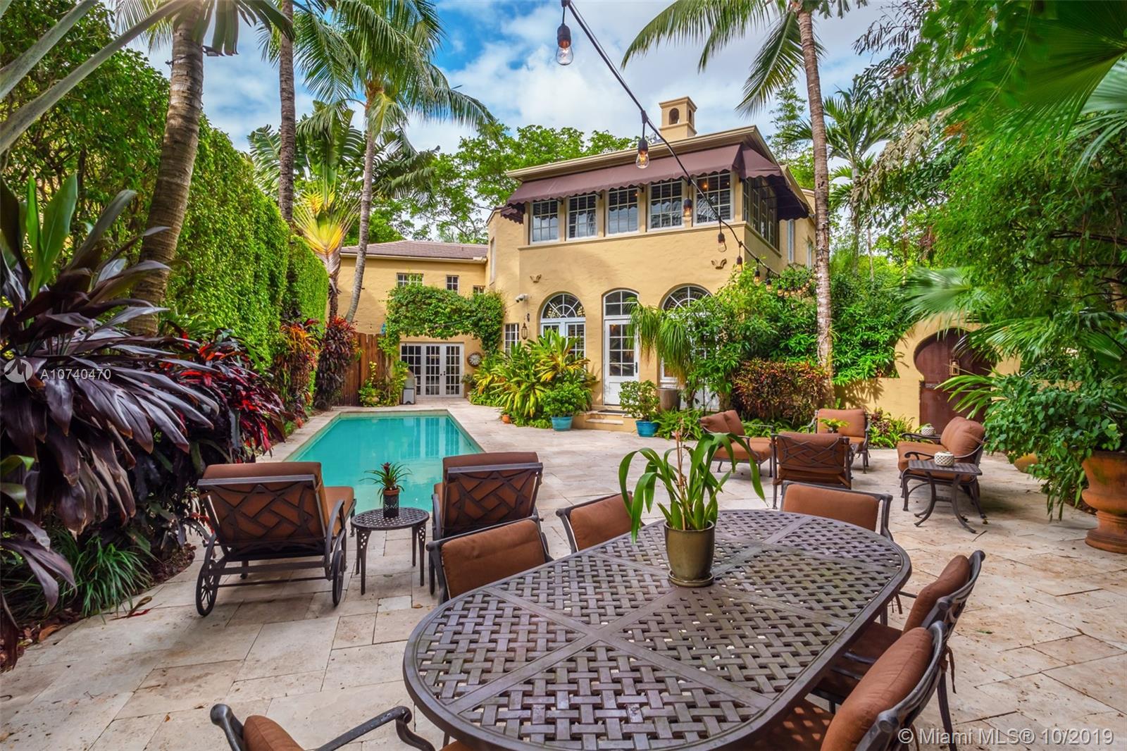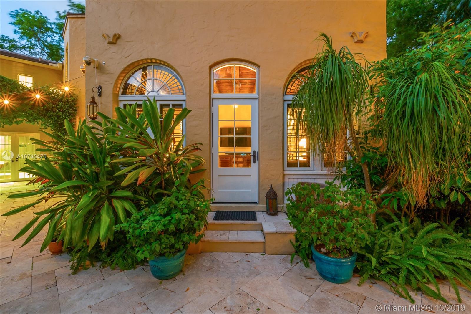 The grandeur of this historic gem spreads throughout the 4,326 sf of living space. An impressive rotunda entry showcases a winding marble staircase. Detailed wood scroll and mill work add elegance to the 4 bedroom and 6 bathroom layout. Adding to the splendor are Moroccan sconces, high beamed ceilings, arched windows, and a carved stone fireplace. The lavish master bedroom and bathroom with custom tile are a delight, and the upgraded kitchen has modern features that complement the unique design. Relax in the sunroom or entertain guests in the spacious formal living and dining space. A game room with pool table leads outside to a lush private garden that surrounds an inviting stone patio and pool. Located in the heart a Coral Gables, downtown City Beautiful is a short walk away.