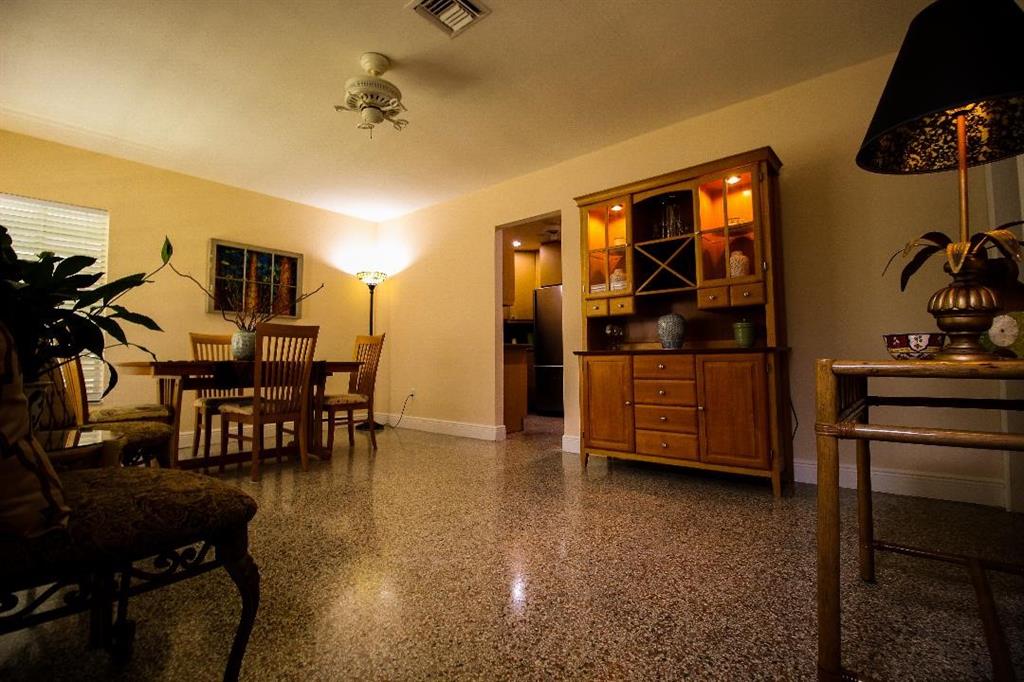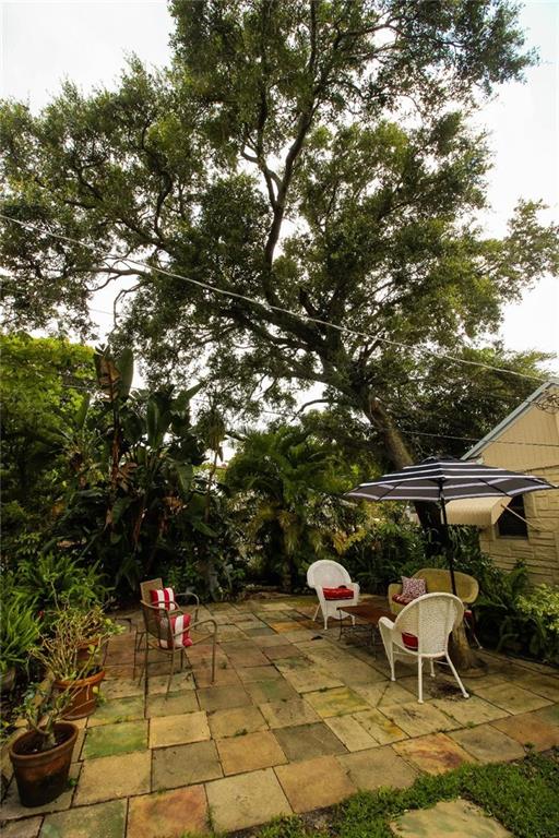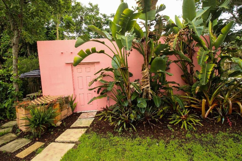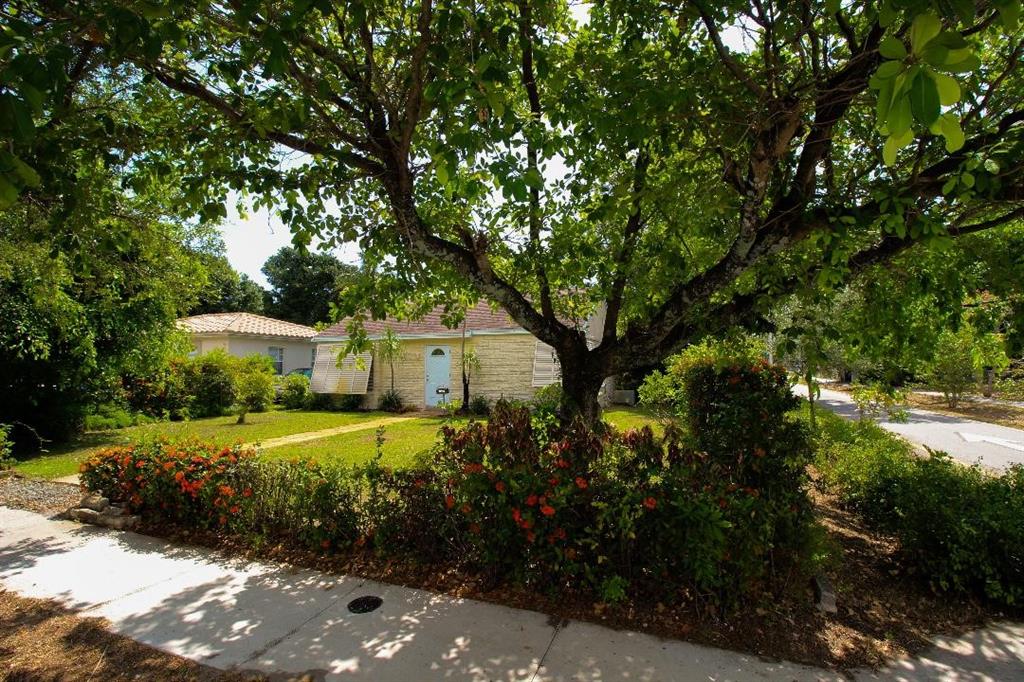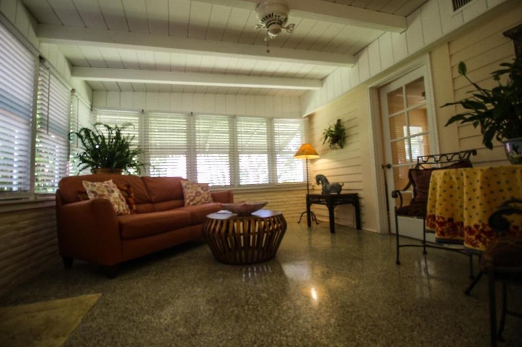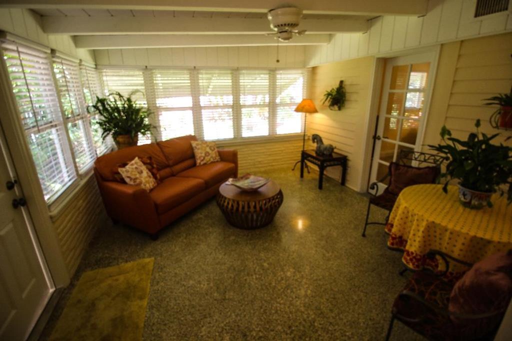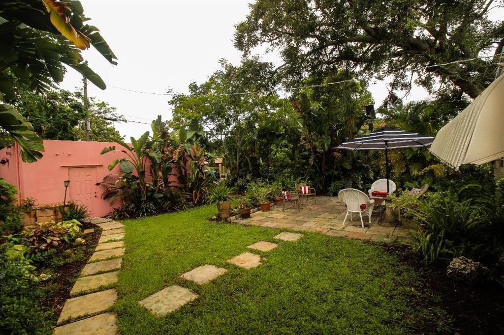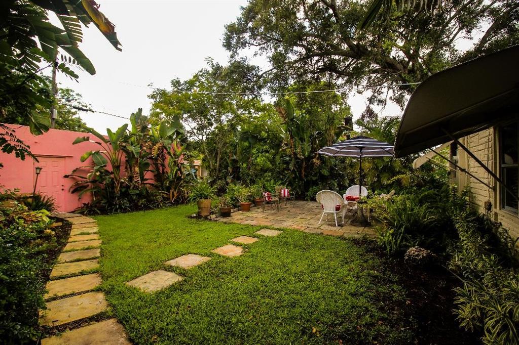 2 beds, 1 completely renovated bath, FL room, living/dining room, Completely renovated kitchen; double stoves, stainless, granite, plenty of cabinets. Updated windows, restored original terrazzo floors. Tropical landscaped, private, fenced backyard with custom barbeque/grill/patio area. In-ground fish pond. Detached garage with electric/water & laundry. Corner lot. Well water sprinkler/pump system. Beautiful cottage feel.