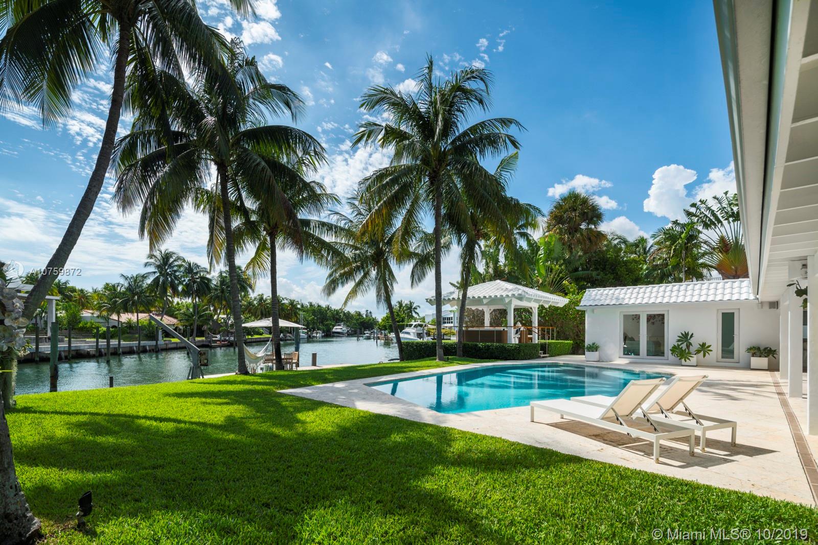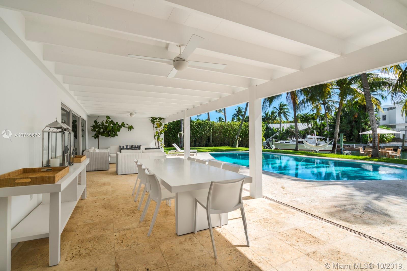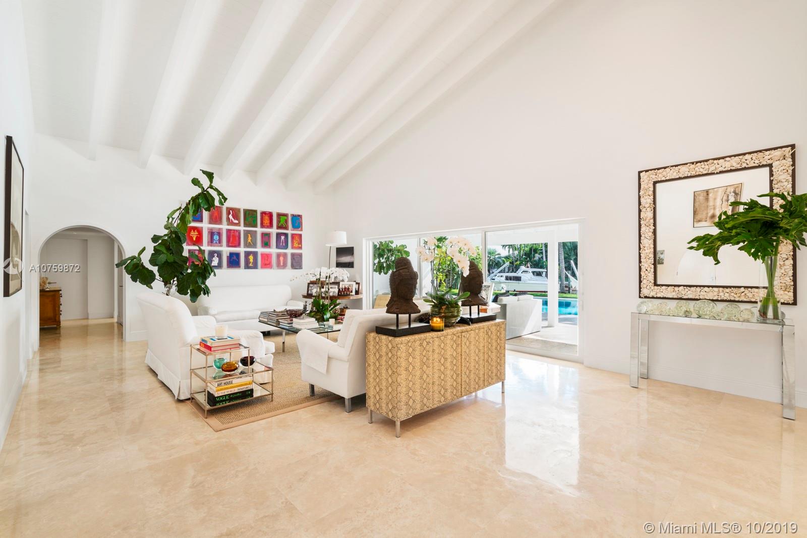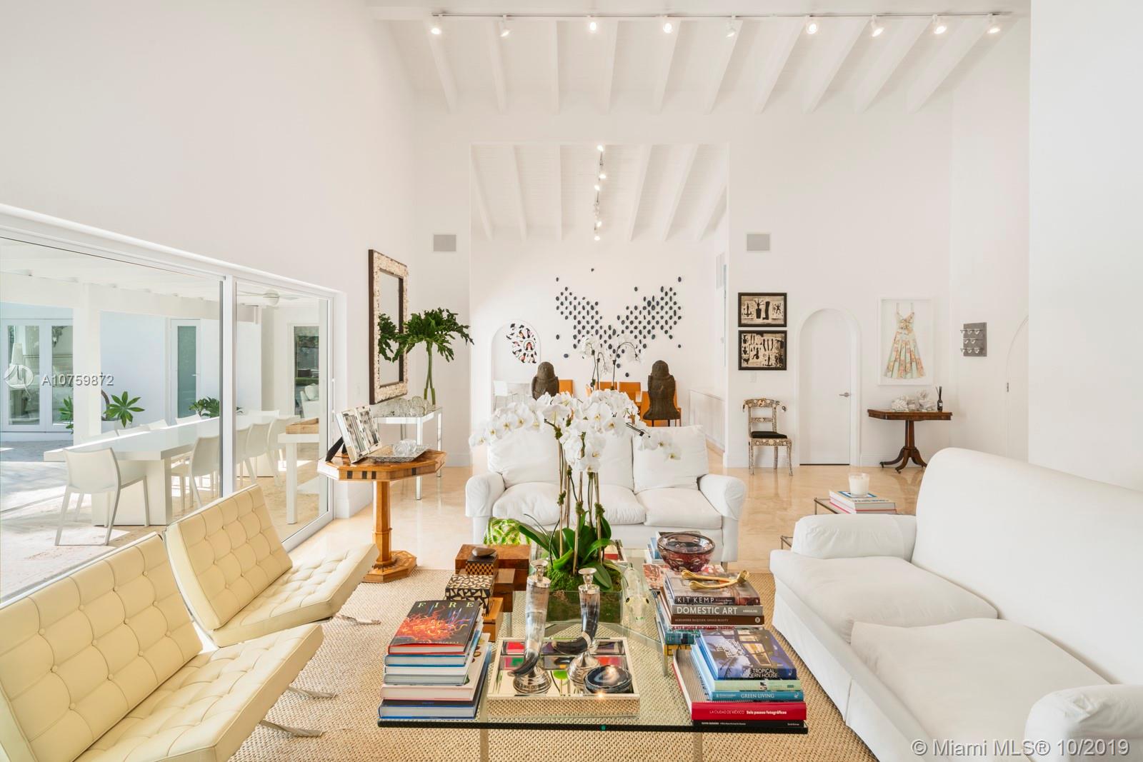 Stunning, magazine quality waterfront home on the exclusive & idyllic island of Key Biscayne. Enjoy water views from light-filled living spaces w/ soaring, vaulted wood-beamed ceilings, a striking white color palette & a modern vibe throughout. Updates include new: limestone flooring, spa-like baths, impact glass, interior & exterior Sonos sound system, new dock w/adjoining floating dock & new stone terrace & pool deck. European-style kitchen features black granite countertops, Viking appliances & breakfast area. Lush, tropical garden surrounds the resort-like outdoor space that offers an expansive covered terrace, pool & gazebo w/ spectacular sunset views. Protected, private dock w/davits & no bridges to the bay. Direct ocean access, 180’ turning basin at the head of the canal.