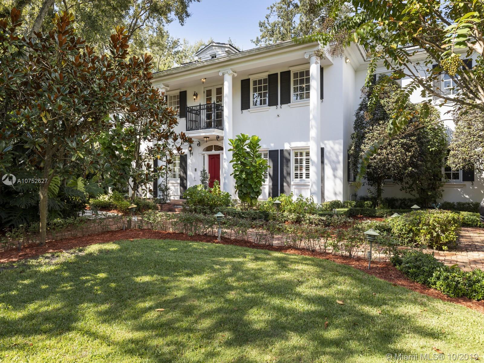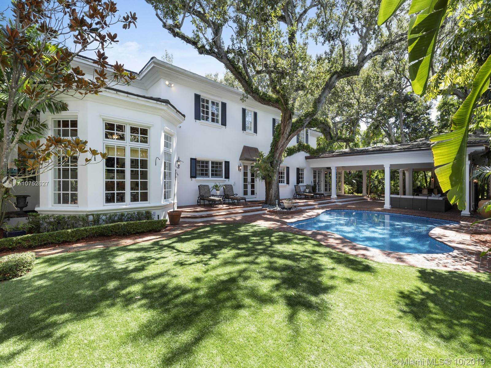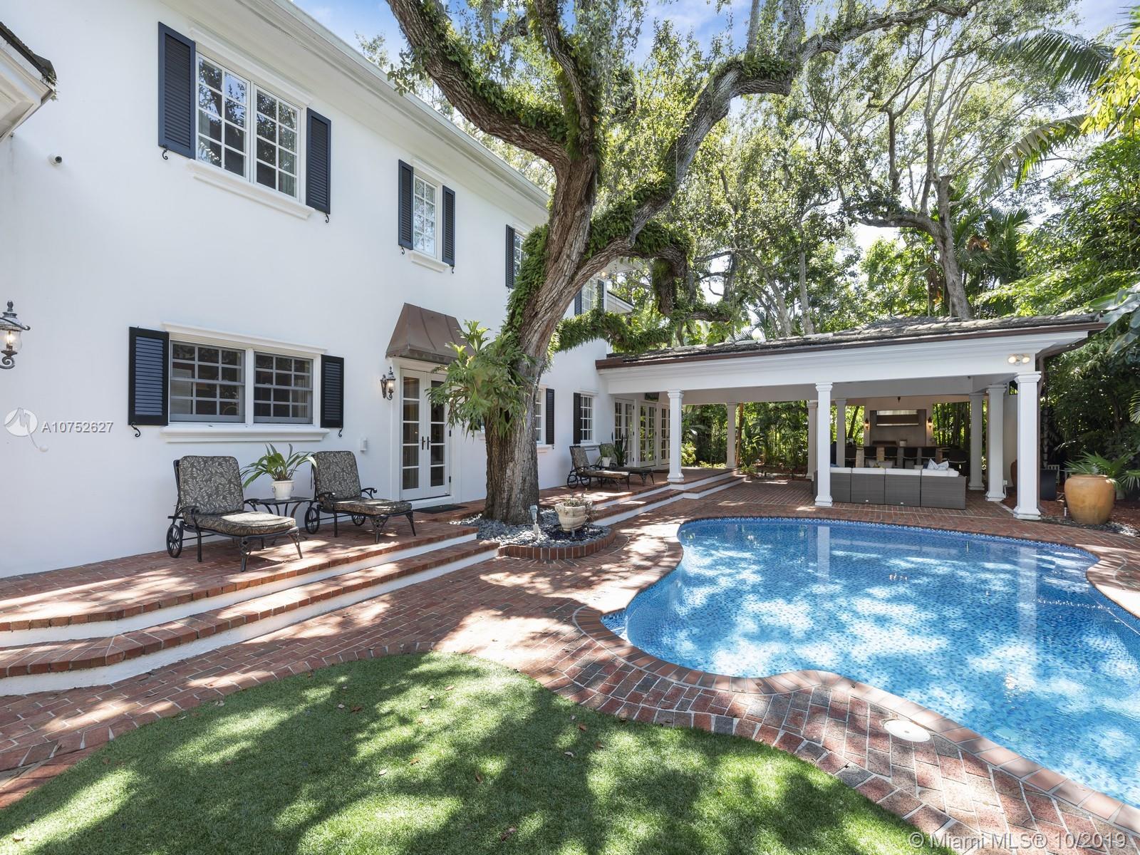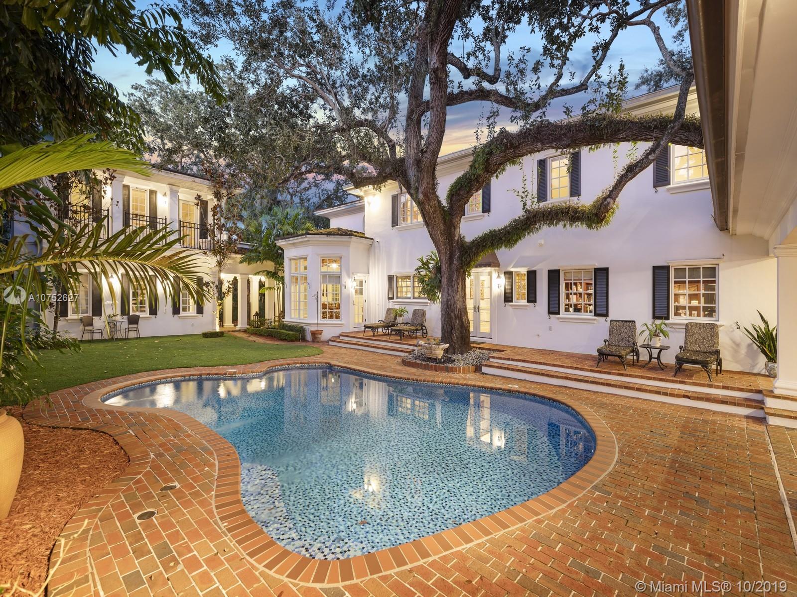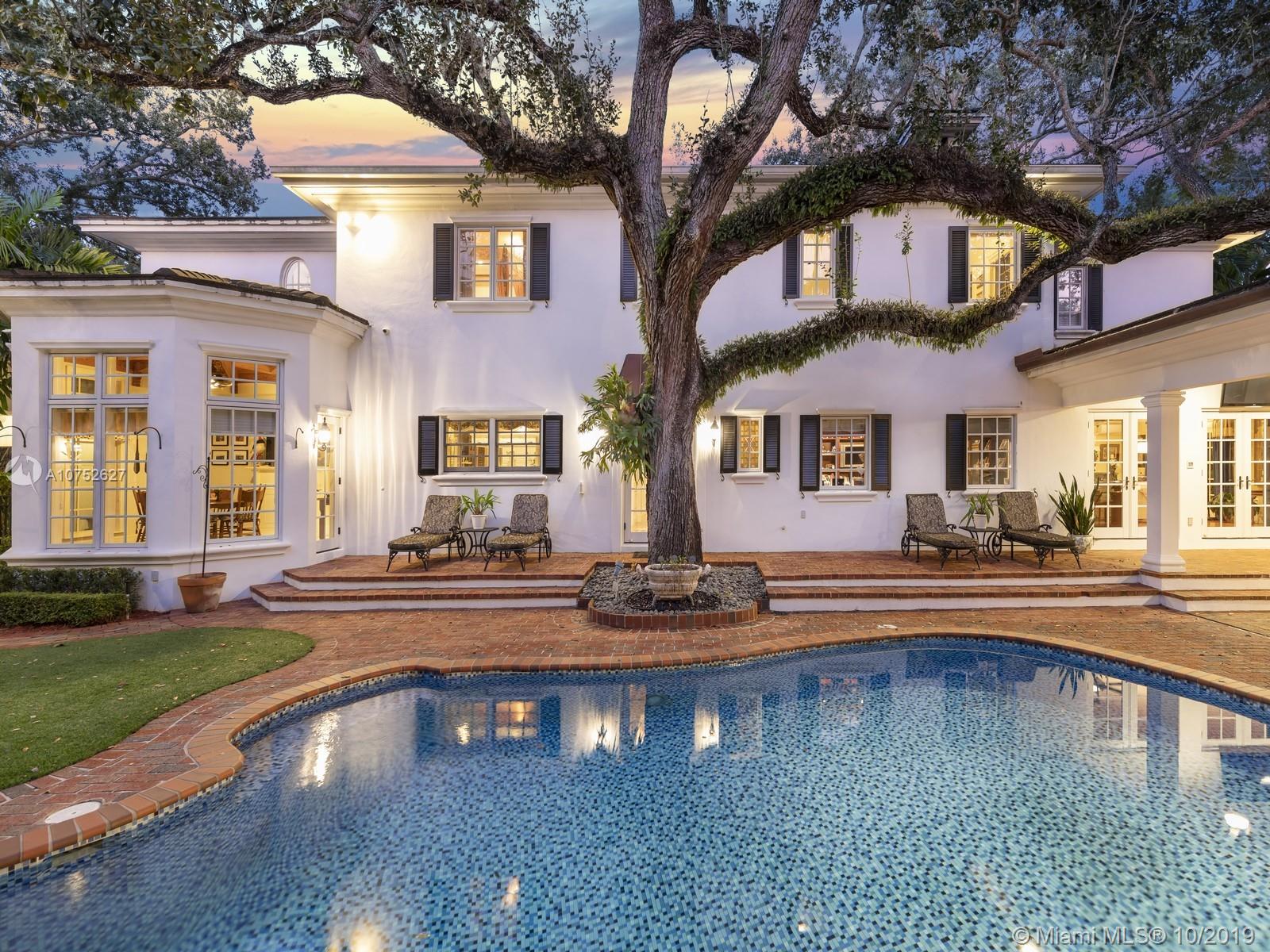 Poised to charm this Grande Dame two story colonial style architecture is everything the most discerning buyer could desire, and more. Renovated to perfection w/ the highest quality finishes: Rich custom mill work in the family room, library and kitchen, Viking gas stove, expansive outdoor entertainment areas, indoor & outdoor fireplaces, wood floors, sweeping staircase, library/den/kids study room. Enjoy decadent soirées & wine tastings in the exquisite 1,500 bottle wine cellar. Inviting tile pool, separate two story guest house, two car garage connected to the main house via a delightful covered breezeway through the garden. Completely walled, fenced and gated with the latest security system throughout. Mature oaks adorn this home in the most coveted residential area in Miami, So.Gables.