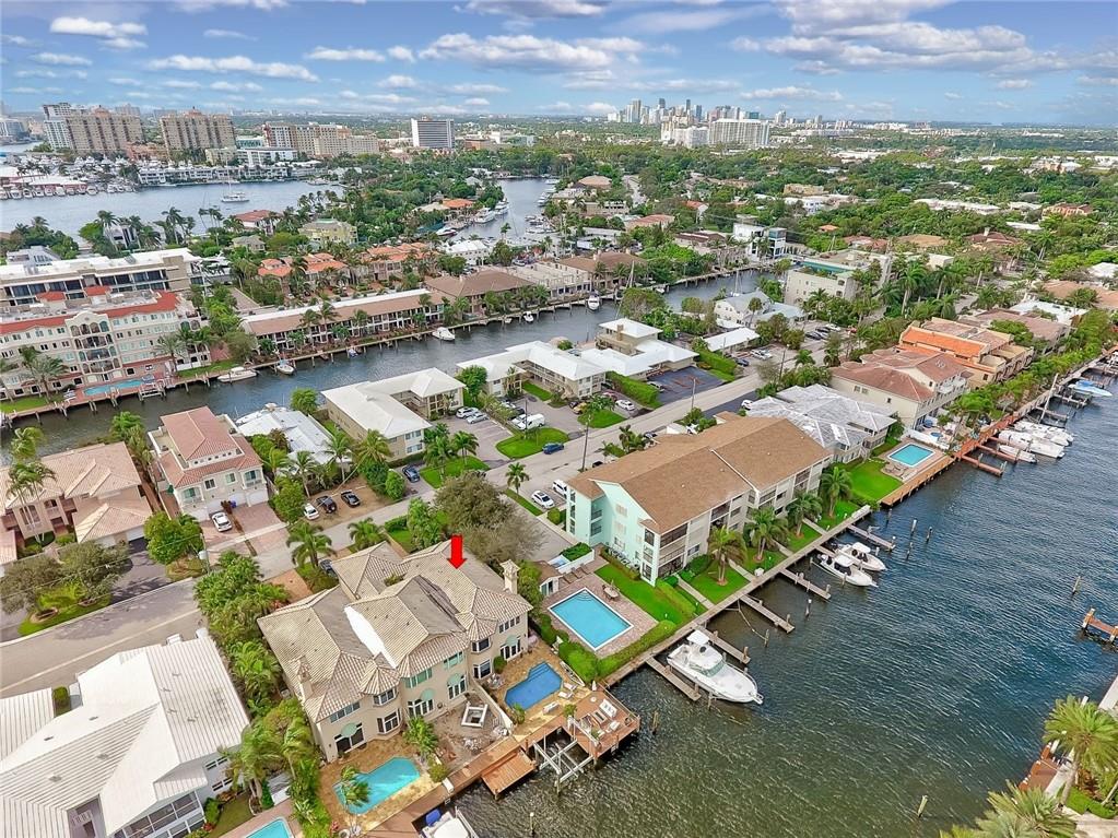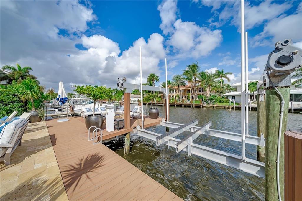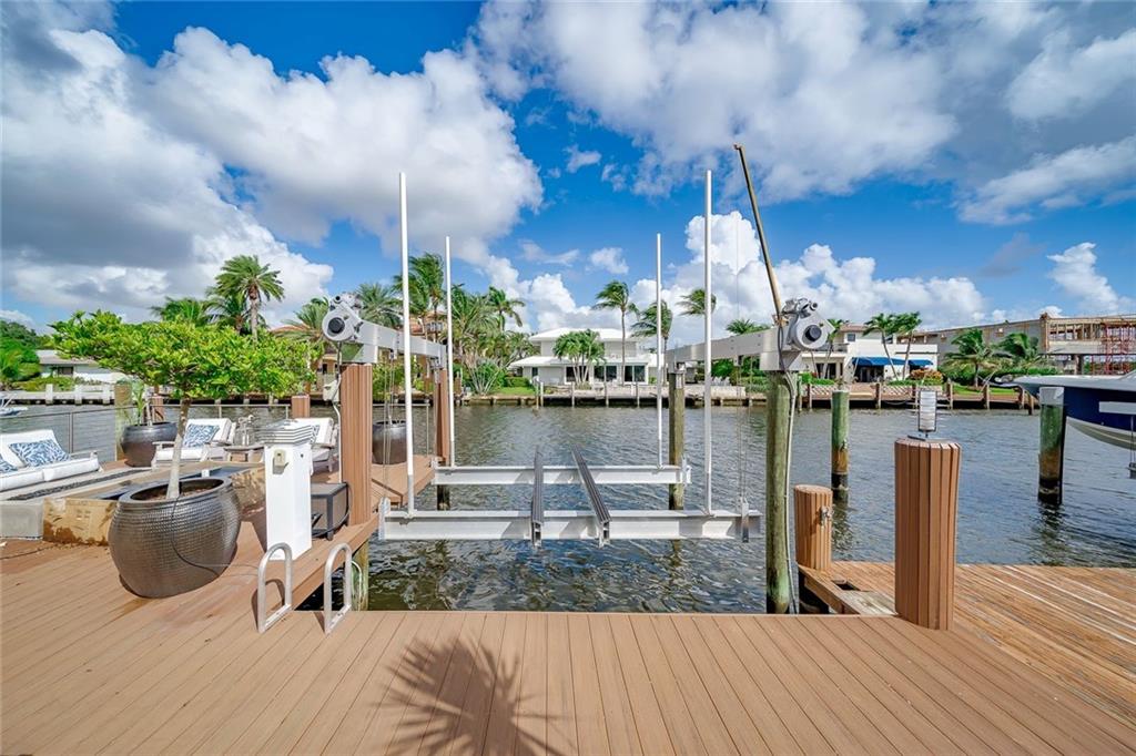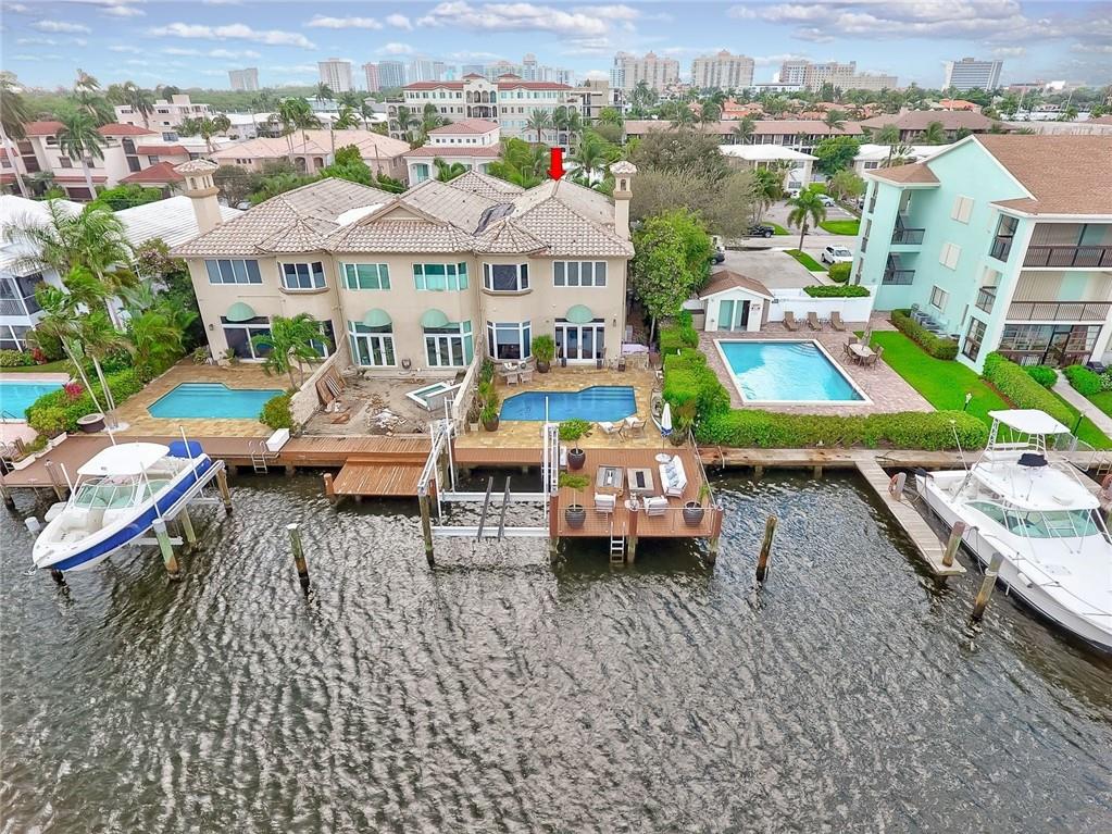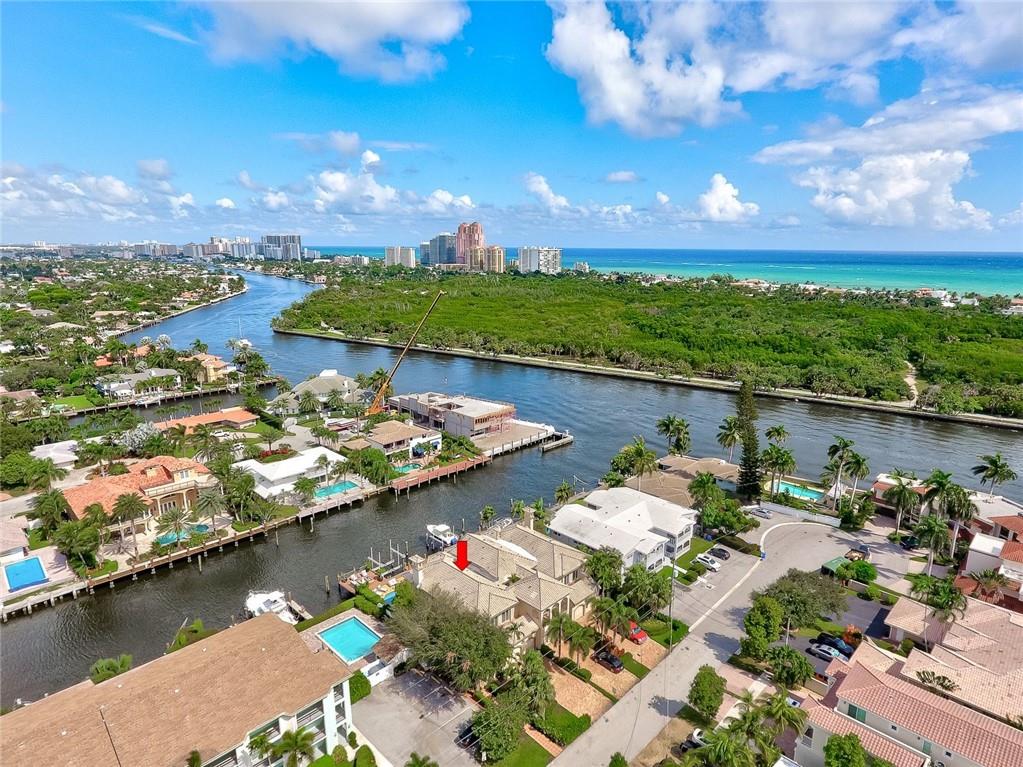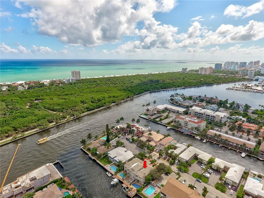 No Fixed bridges w/boat lift! Two-story spacious townhome with the absolute best design & finishes available! 12FT ceilings immediately bring your eye to the beautiful wooden beams above the kitchen featuring top of the line appliances. Bedrooms are perfectly situated upstairs with large master bedroom overlooking the waterway & 2 guest bedrooms with their own private ensuite bath & private balcony. The master bedroom features 2 walk-in closets & one very large bathroom. You must see the shower! Beautiful extended dock looking straight out to the intracoastal & a brand new summer kitchen make outdoor entertainment as luxurious as it gets. Only a couple buildings from the point of the canal so very private & so close to the city. Walking distance to beach & Galleria. 5 minutes to Las Olas.