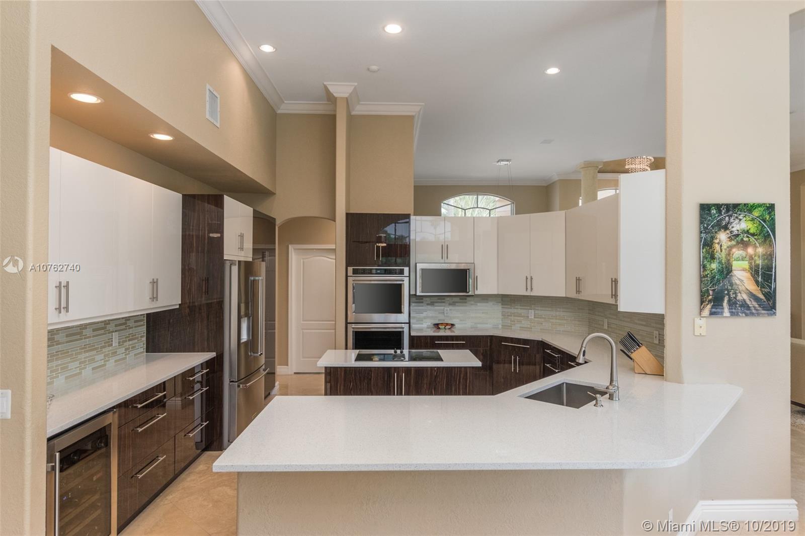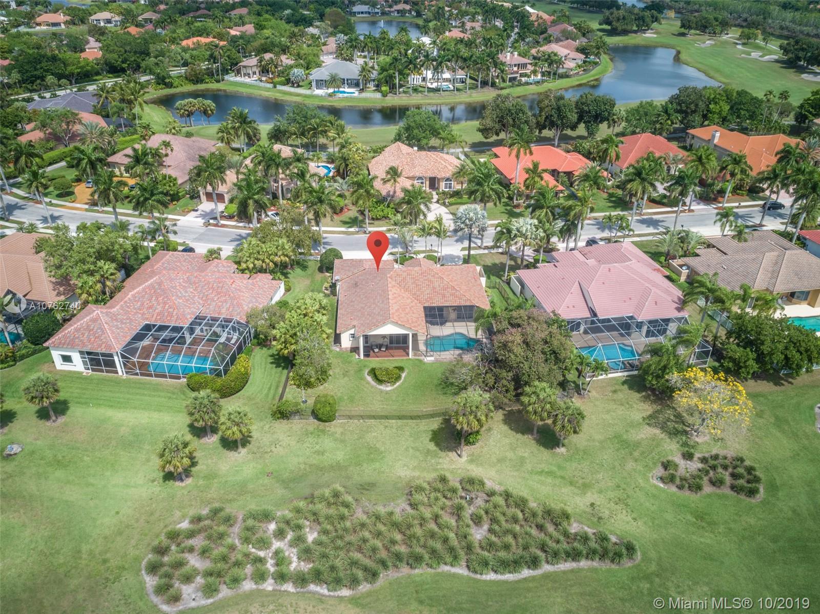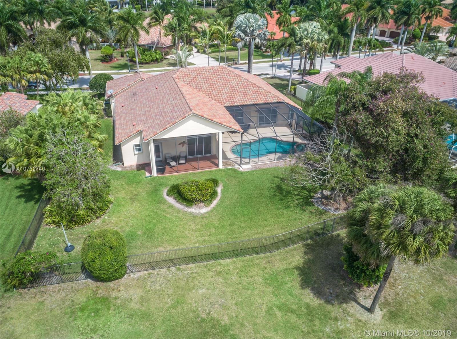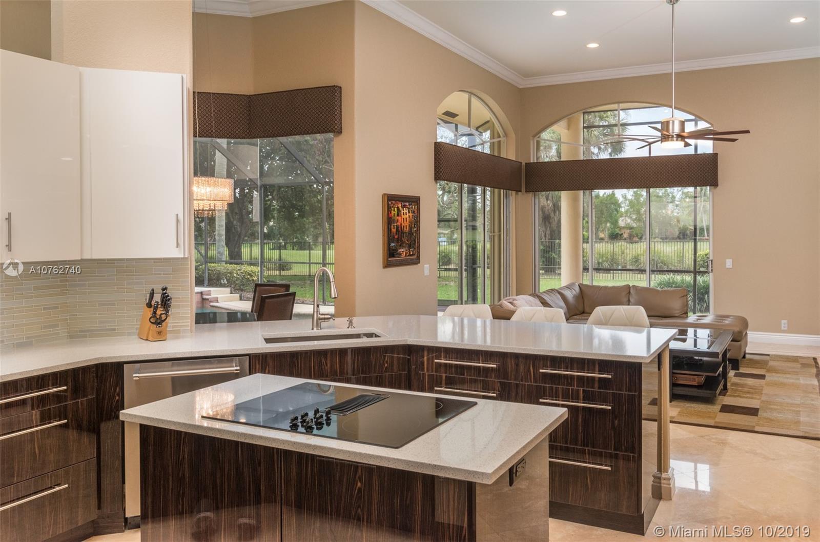 SPECTACULAR VIEWS!! Take in expansive views of the golf course from one of the largest yards in Weston Hills! Gorgeous renovated contemporary kitchen w/ stainless steel appliances, double oven, warming drawer, wine fridge & quartz countertops make it a chef's dream. Phenomenal chandeliers sparkle in dining room, entry and kitchen. Soaring ceilings, large windows & open floor plan with gleaming marble floors create spacious home flowing into sensational screened-in patio & porch and oversized yard. Grand master suite features built-in closets. Perfect for entertaining, this private oasis is located on a tranquil cul-de-sac street and features a three car garage and circular driveway with room for 7-8 cars. Accordion shutters and newer roof.