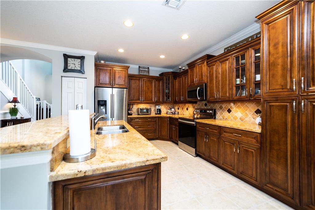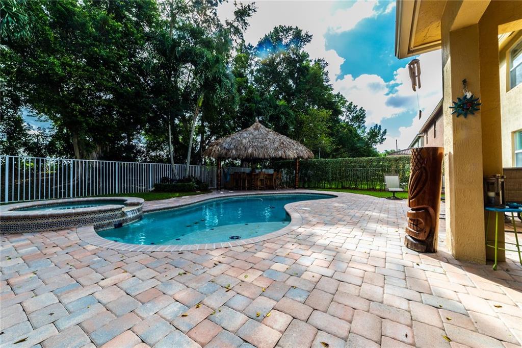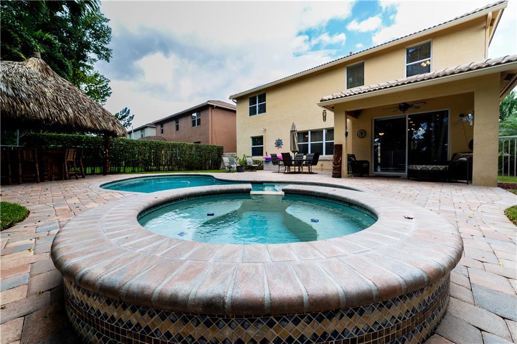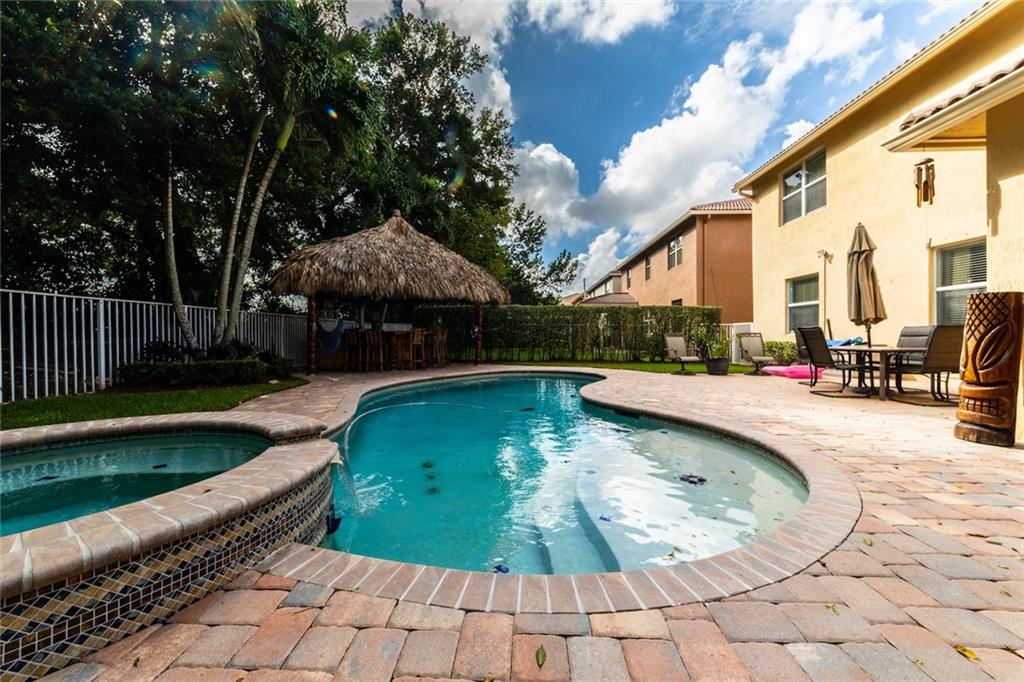 STUNNING 2 STORY CRYSTAL MODEL 5/4 HOME, LOFT AND 2 CAR GARAGE IN GATED ISLES AT WESTON COMMUNITY. UPGRADED KITCHEN WITH LESS THAN 1 YR OLD STAINLESS STEEL APPLIANCES AND GRANITE COUNTER. HARDWOOD FLOORING DOWSTAIRS, STAIRS AND 2ND STORY HALLWAY WITH TILE IN KITCHEN AND BATHS. MASTER BEDROOM WITH DUAL CUSTOM CLOSETS. ONE BEDROOM AND FULL BATH ON FIRST FLOOR. EXTRA STORAGE UNDER THE STAIRS FROM INSIDE THE GARAGE. STEP OUTSIDE INTO YOUR PRIVATE OASIS WITH POOL/SPA AND TIKI HUT WITH BAR STOOLS (5 INCLUDED) READY FOR ENTERTAINING. A+ SCHOOLS NEARBY. HOA dues include alarm monitoring, cable/internet and access to community pool, gym, tot lot, volleyball and basketball court all secure gated community.