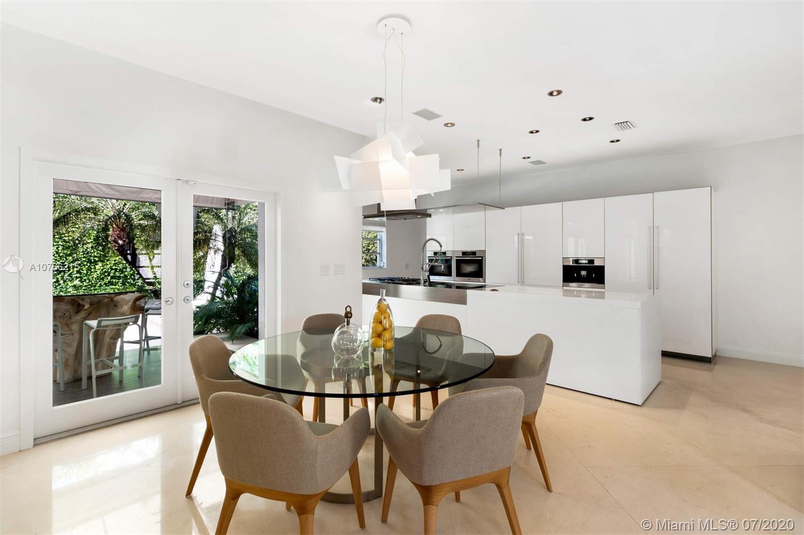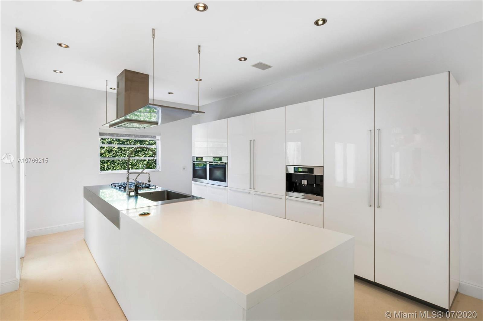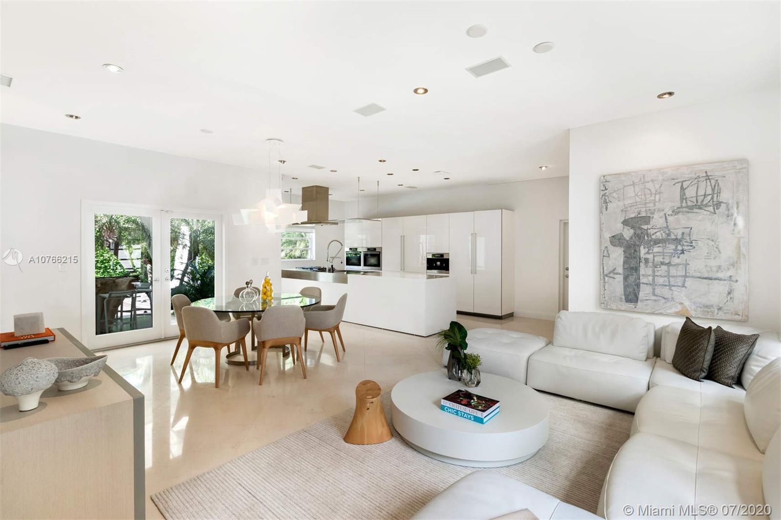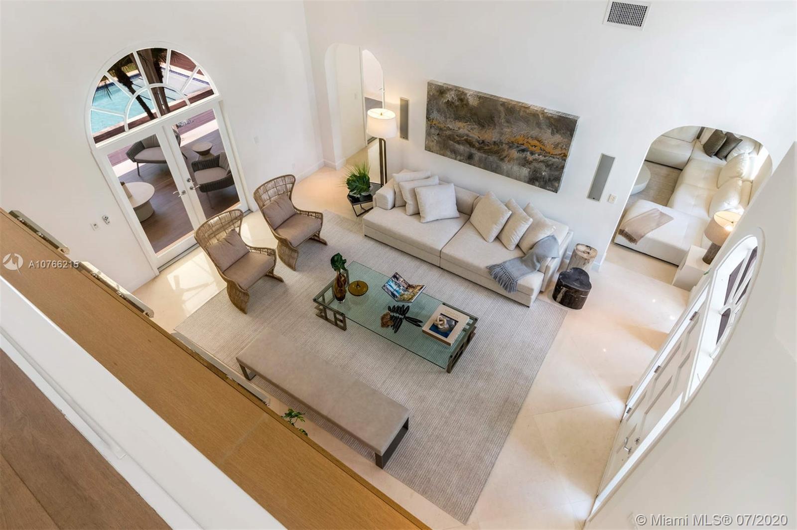 Nested in majestic royal palms, this architectural charmer is wrapped with mature hedges and tropical landscape. Enter to a 20FT ceiling atrium fit to expose impressive art collections. Great room includes a chef's kitchen by Boffi, Miele, Sub-Zero with gas range and designer hood system open to dining and living areas. Master suite sanctuary with private office on ground floor. Spa inspired Master Bathroom overlooking the lush gardens and resort style pool and patio areas. 2 guest bedrooms on the 2nd floor accessible by architectural stairway. Timeless design and modern comfort in a private island setting.