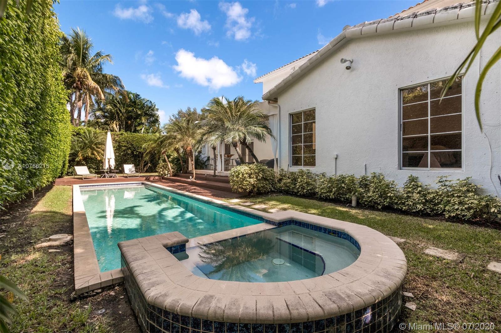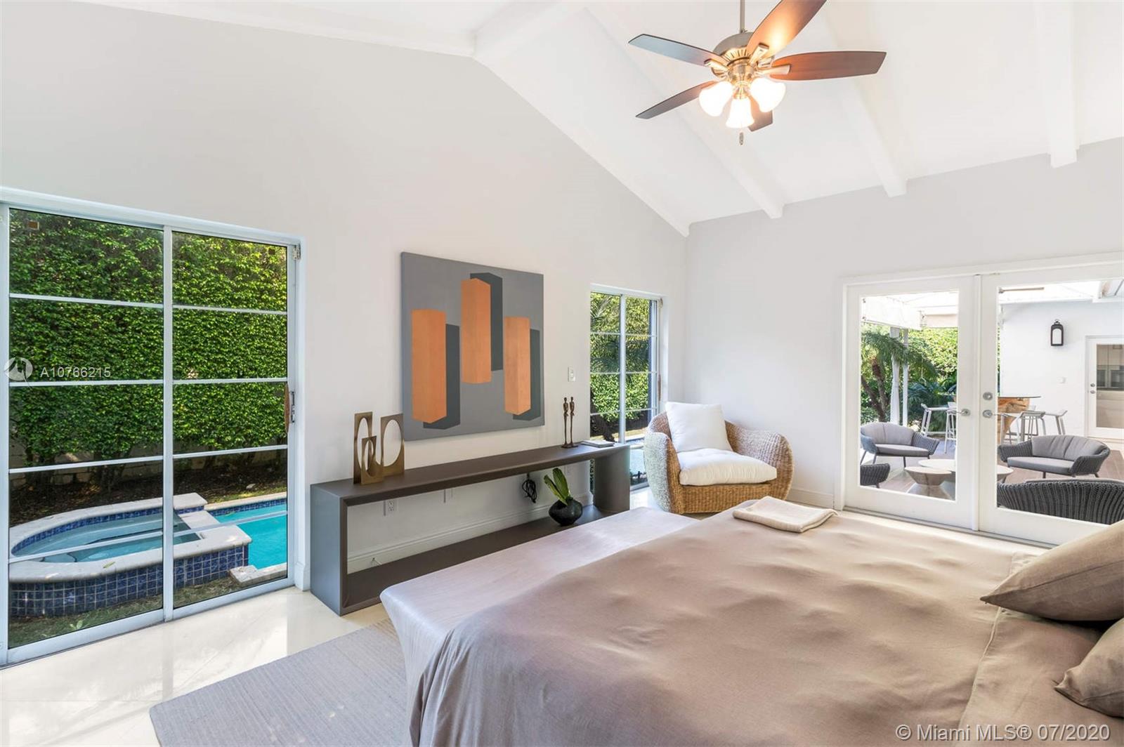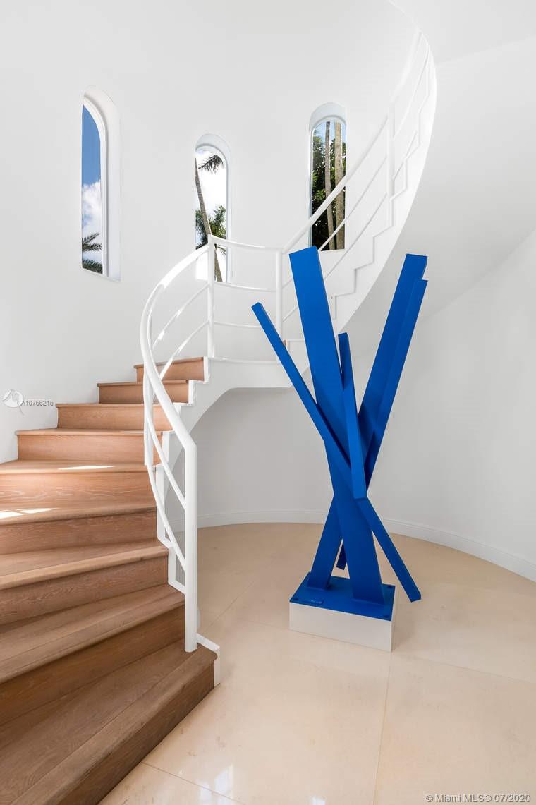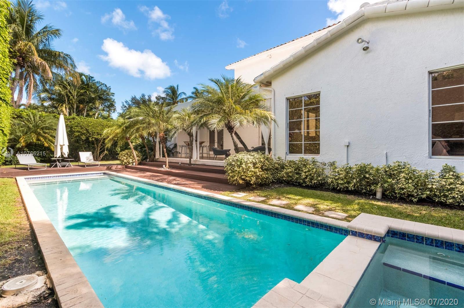 Nested in majestic royal palms, this architectural charmer is wrapped with mature hedges and tropical landscape. Enter to a 20FT ceiling atrium fit to expose impressive art collections. Great room includes a chef's kitchen by Boffi, Miele, Sub-Zero with gas range and designer hood system open to dining and living areas. Master suite sanctuary with private office on ground floor. Spa inspired Master Bathroom overlooking the lush gardens and resort style pool and patio areas. 2 guest bedrooms on the 2nd floor accessible by architectural stairway. Timeless design and modern comfort in a private island setting.
